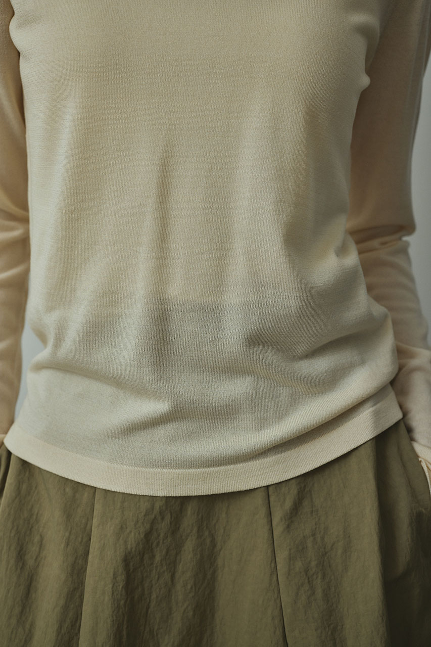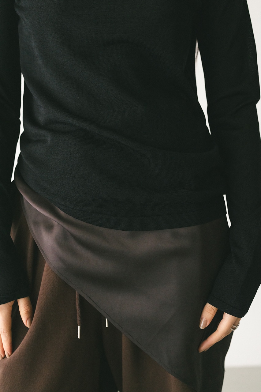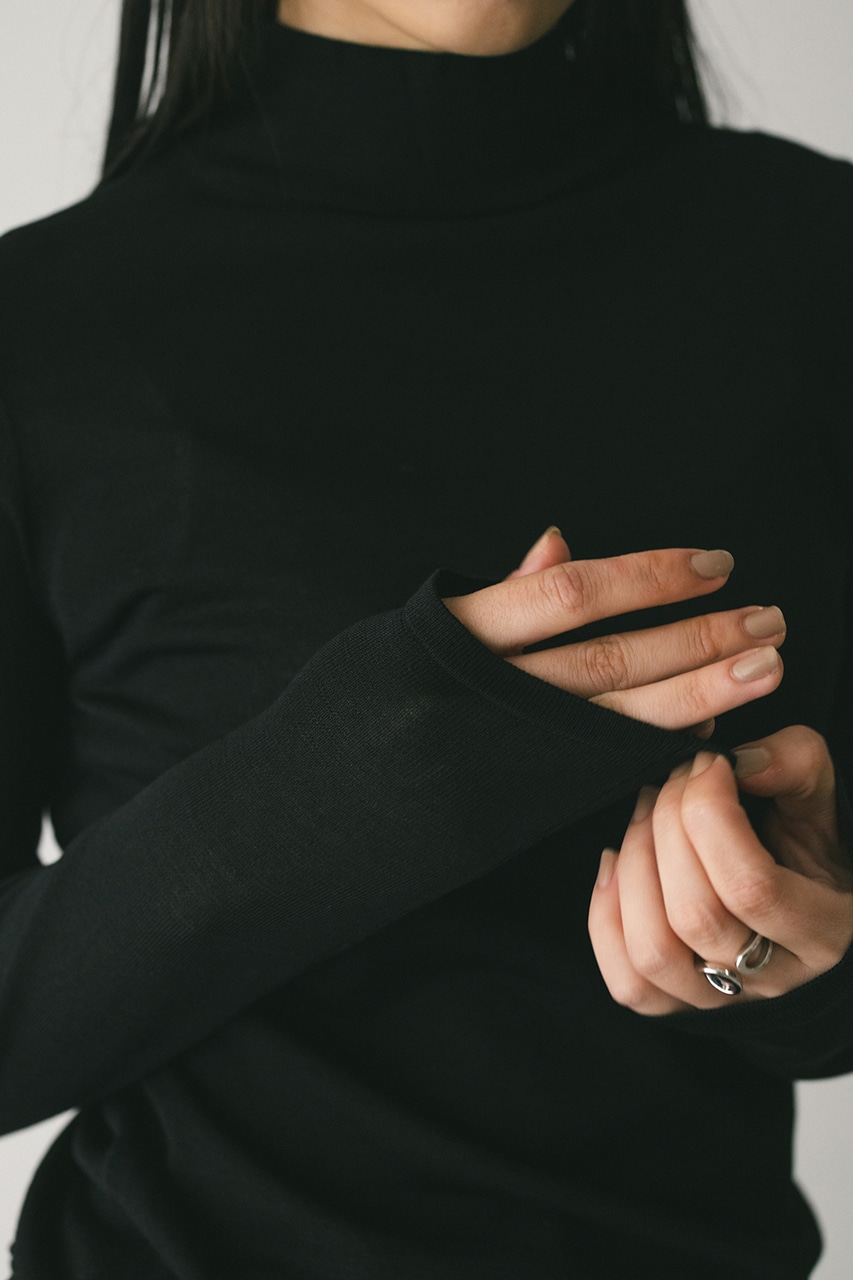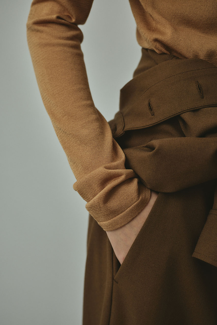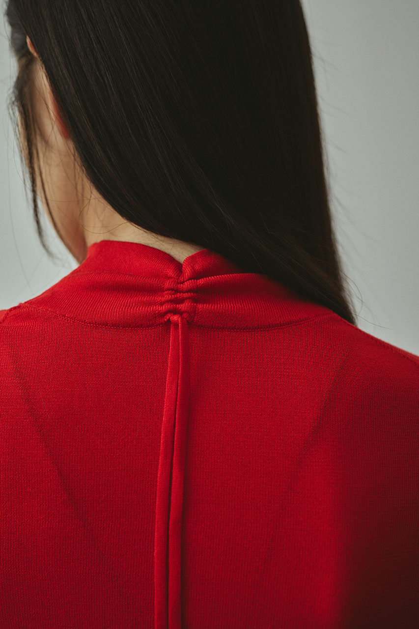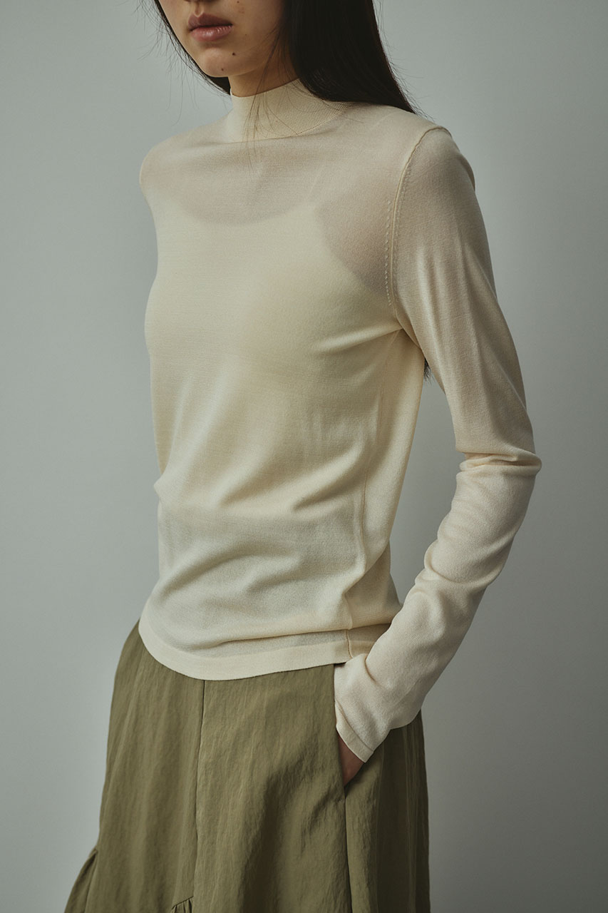 スタミキ定番人気のバックストリングデザインがポイントのニット。首に綺麗に沿うモックネックに施されたバックストリングデザインがモードで上品さを際立たせます。14Gのハイゲージで編みたてているので肌触りもよく、綺麗めにもカジュアルにも着用頂けます。透け感ややあり、ストレッチあり。