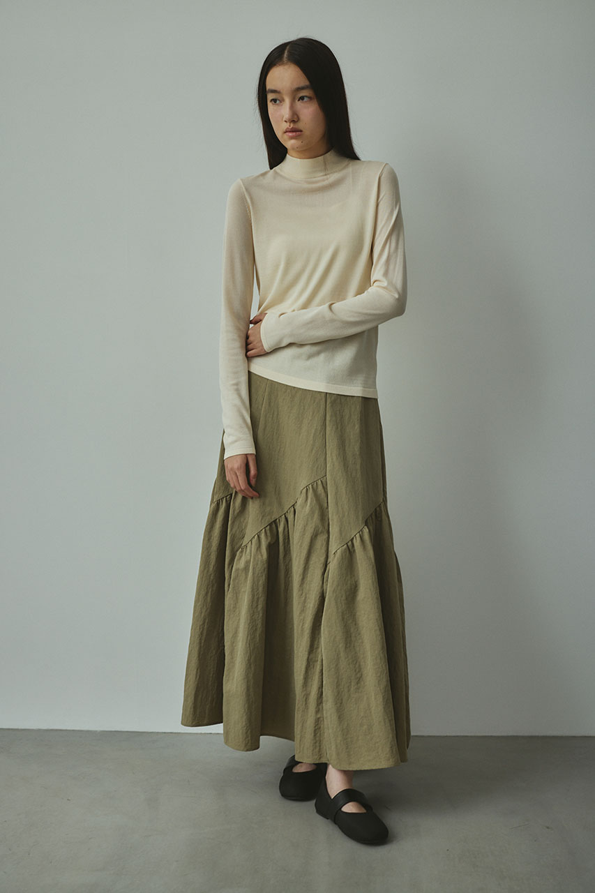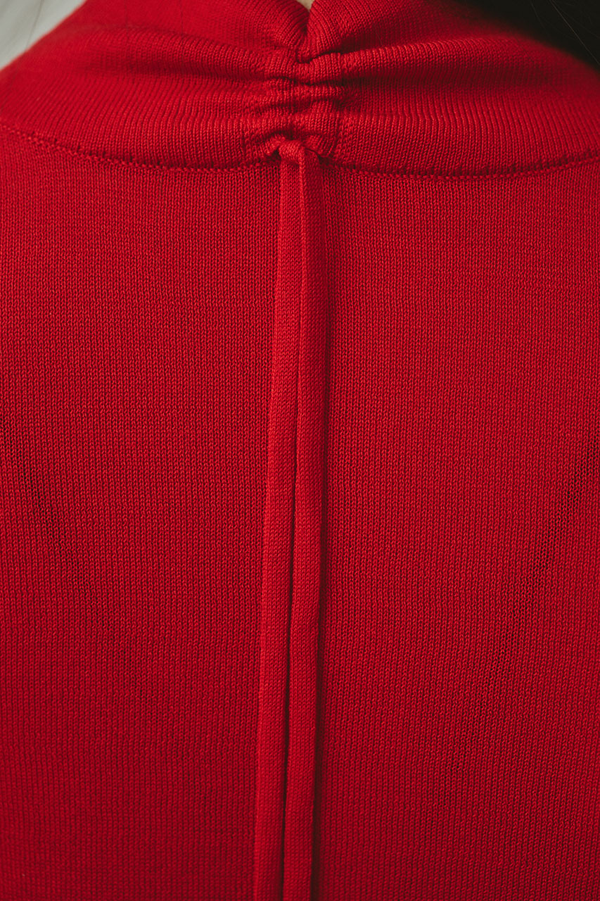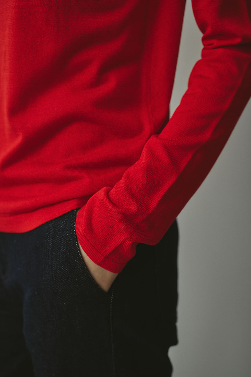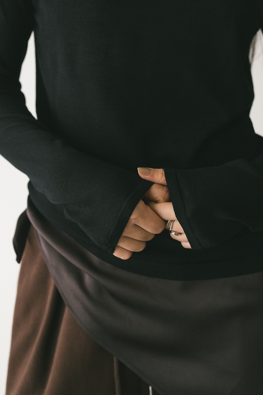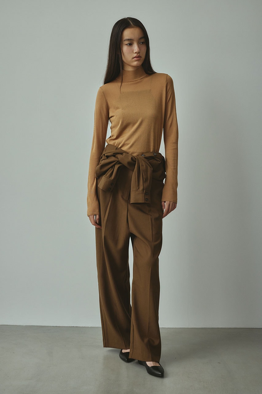 スタミキ定番人気のバックストリングデザインがポイントのニット。首に綺麗に沿うモックネックに施されたバックストリングデザインがモードで上品さを際立たせます。14Gのハイゲージで編みたてているので肌触りもよく、綺麗めにもカジュアルにも着用頂けます。透け感ややあり、ストレッチあり。