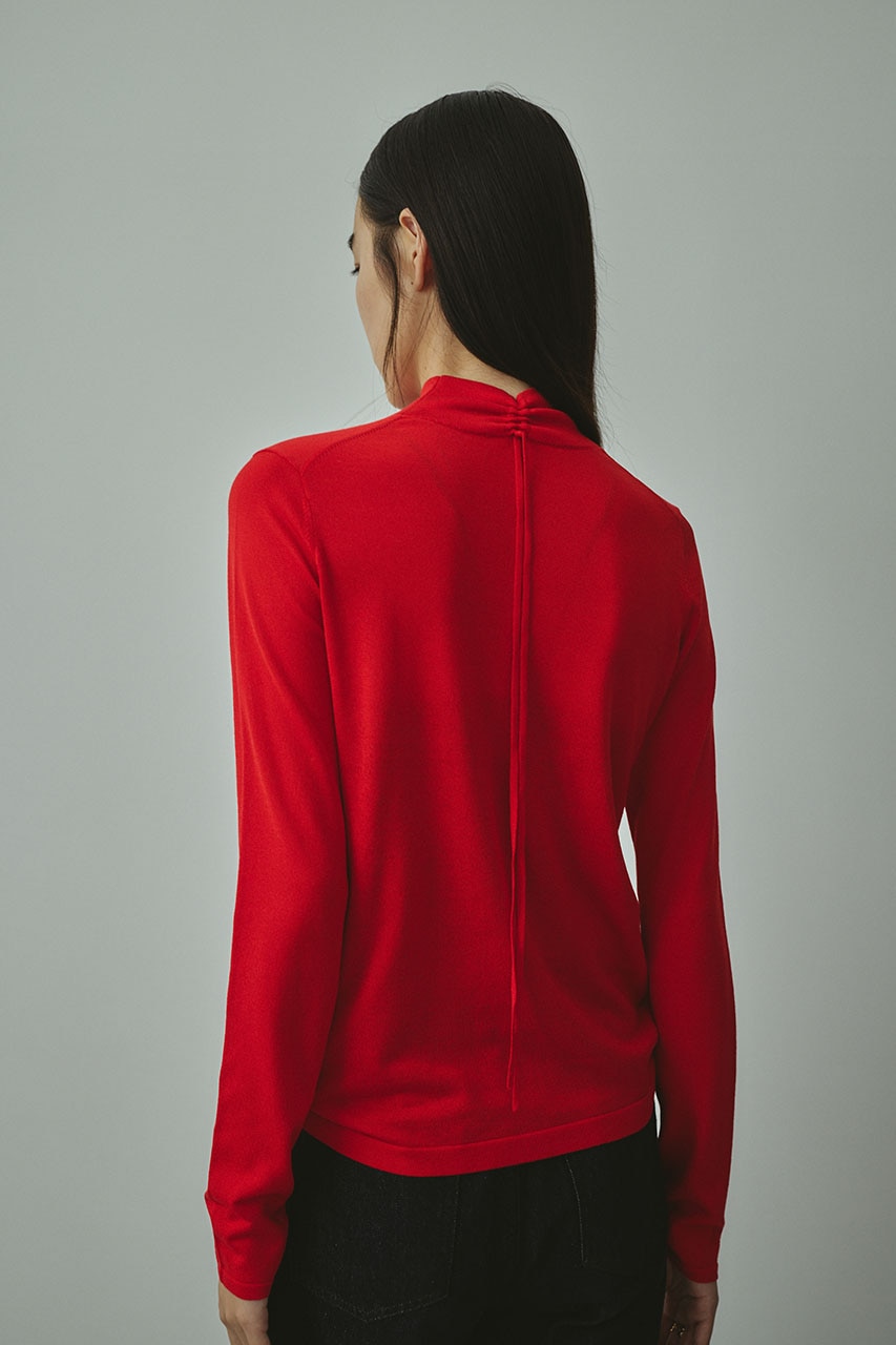 スタミキ定番人気のバックストリングデザインがポイントのニット。首に綺麗に沿うモックネックに施されたバックストリングデザインがモードで上品さを際立たせます。14Gのハイゲージで編みたてているので肌触りもよく、綺麗めにもカジュアルにも着用頂けます。透け感ややあり、ストレッチあり。