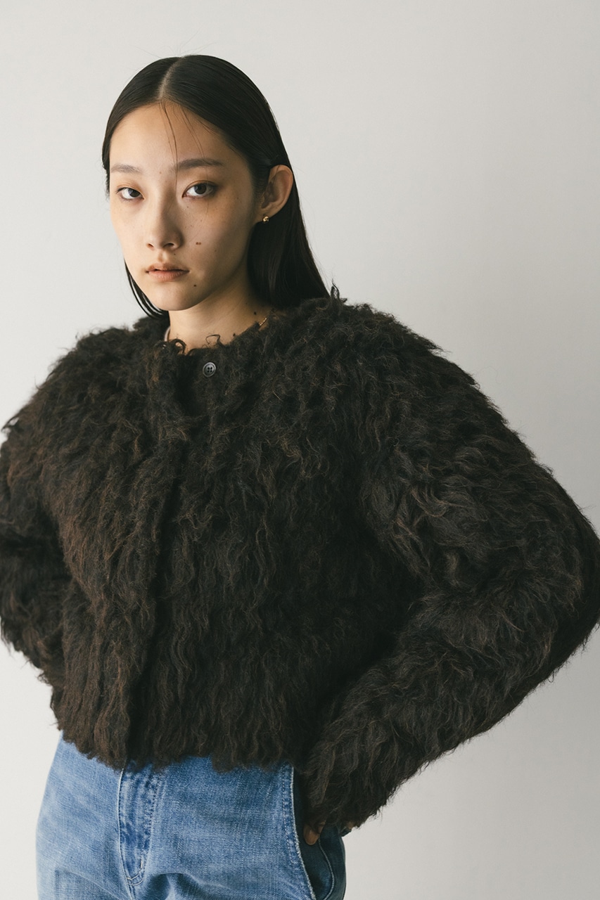 異なる2色の糸を組み合わせて編み上げたメランジシャギーニットカーデ。表面の糸をかいて毛吹かせることで、柔らかな表情感のあるニットに仕上げました。インナーにレイヤードしやすいように、アームホールや袖は丸みをもたせ、身幅はゆったりとしたシルエットに仕上げています。透け感なし、ストレッチあり。