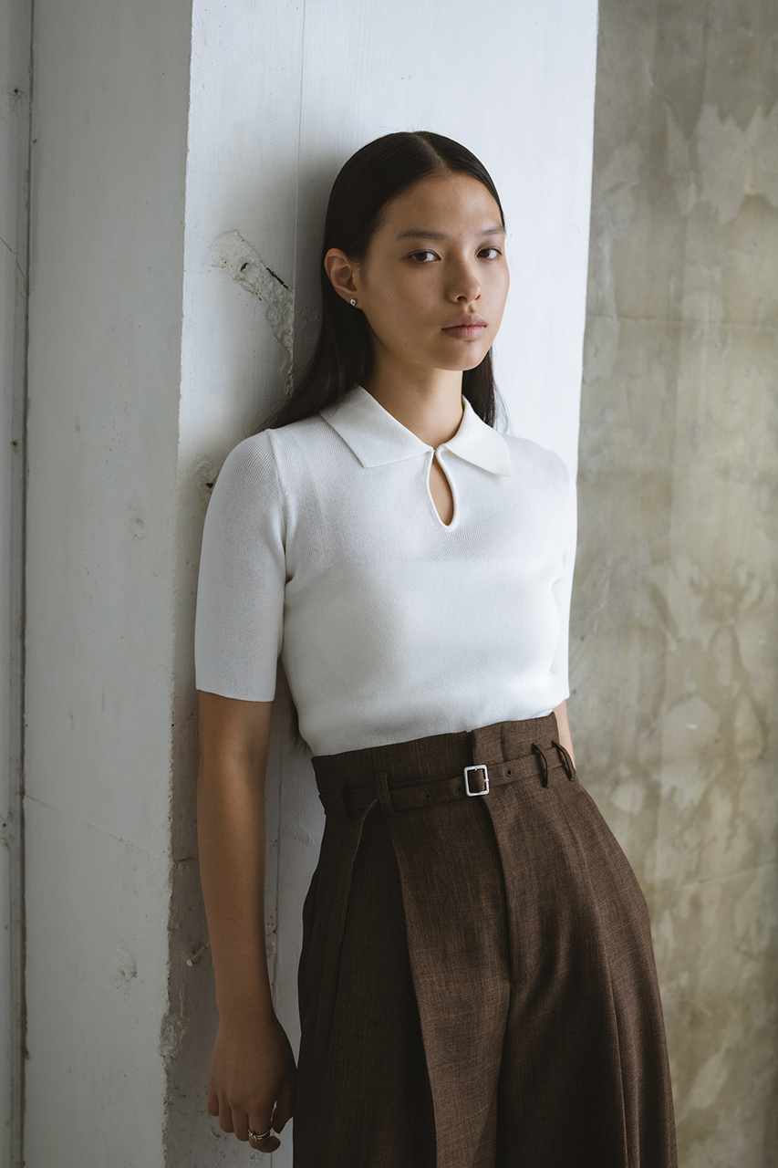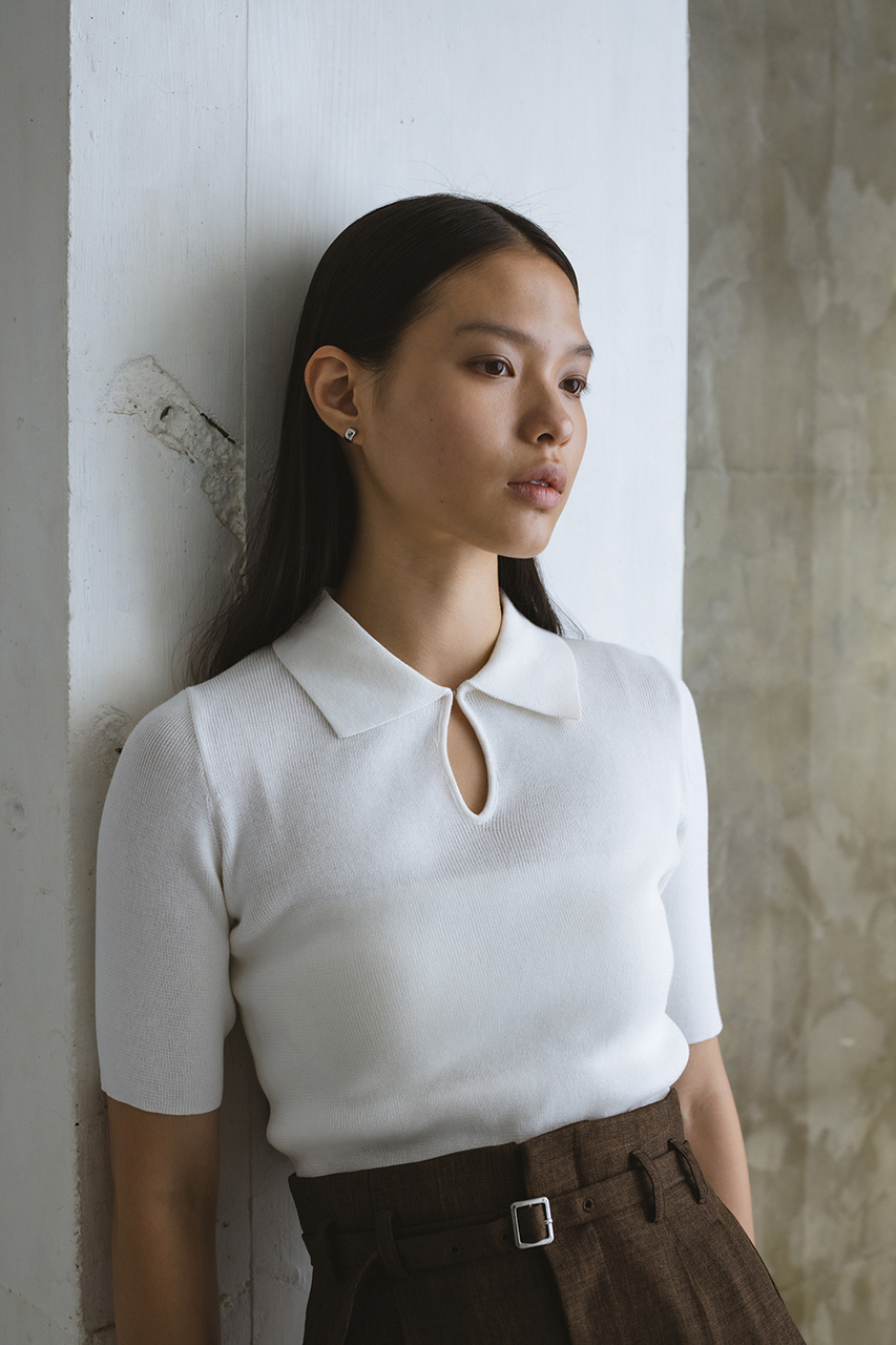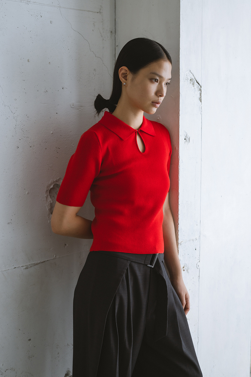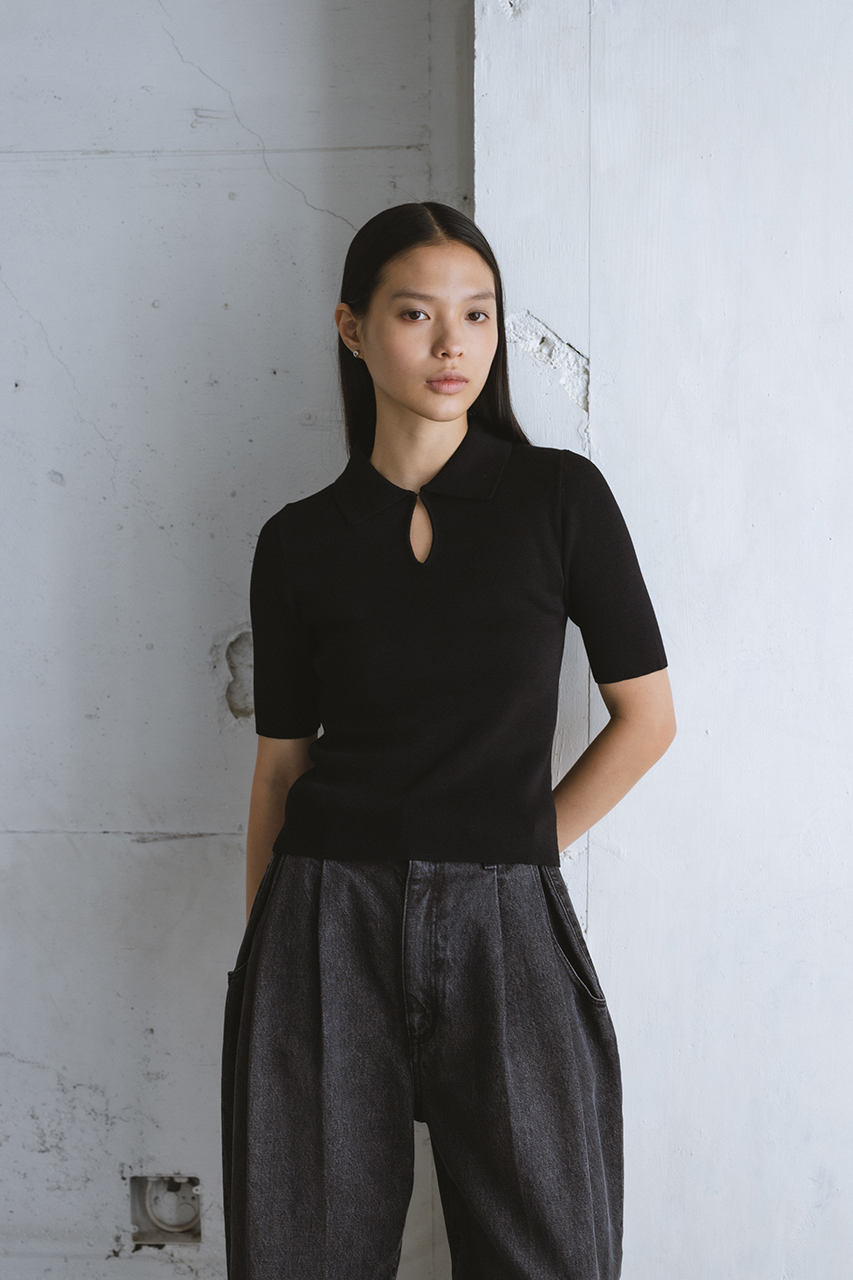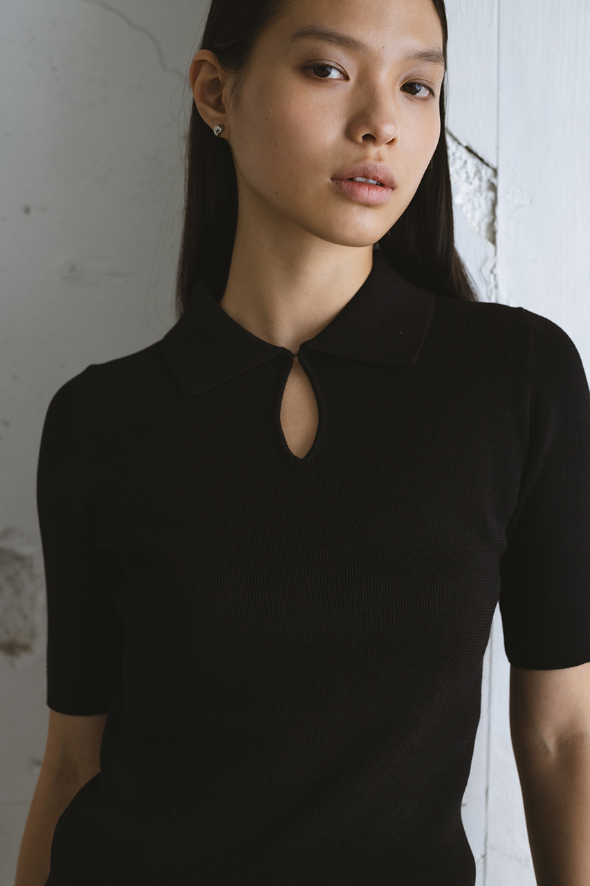 フロントホールがポイントのポロニット。すっきりとしたサイズ感でボトムスにインしてもアウトしても決まりやすい丈に仕上げました。ホール部分は鍵ホック開閉可能。ストレッチあり、透け感なし。