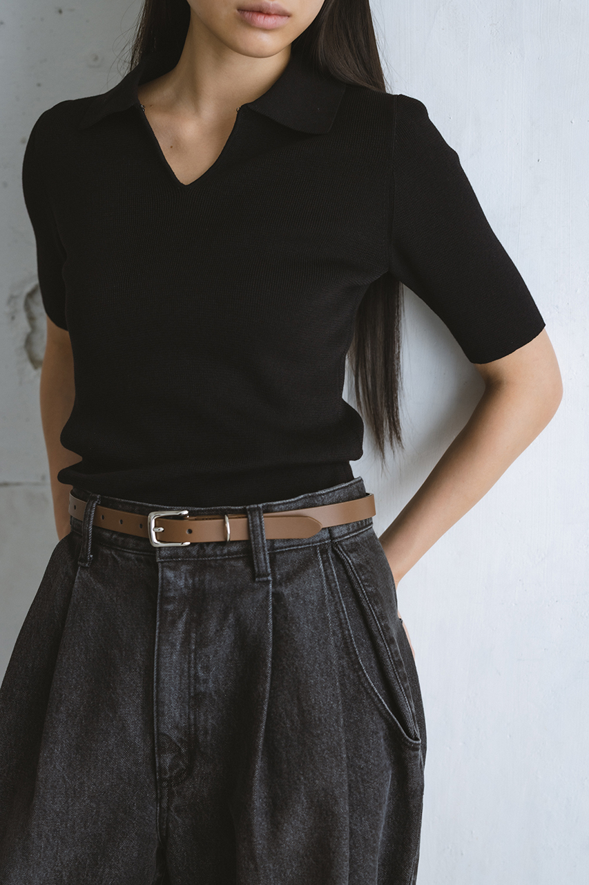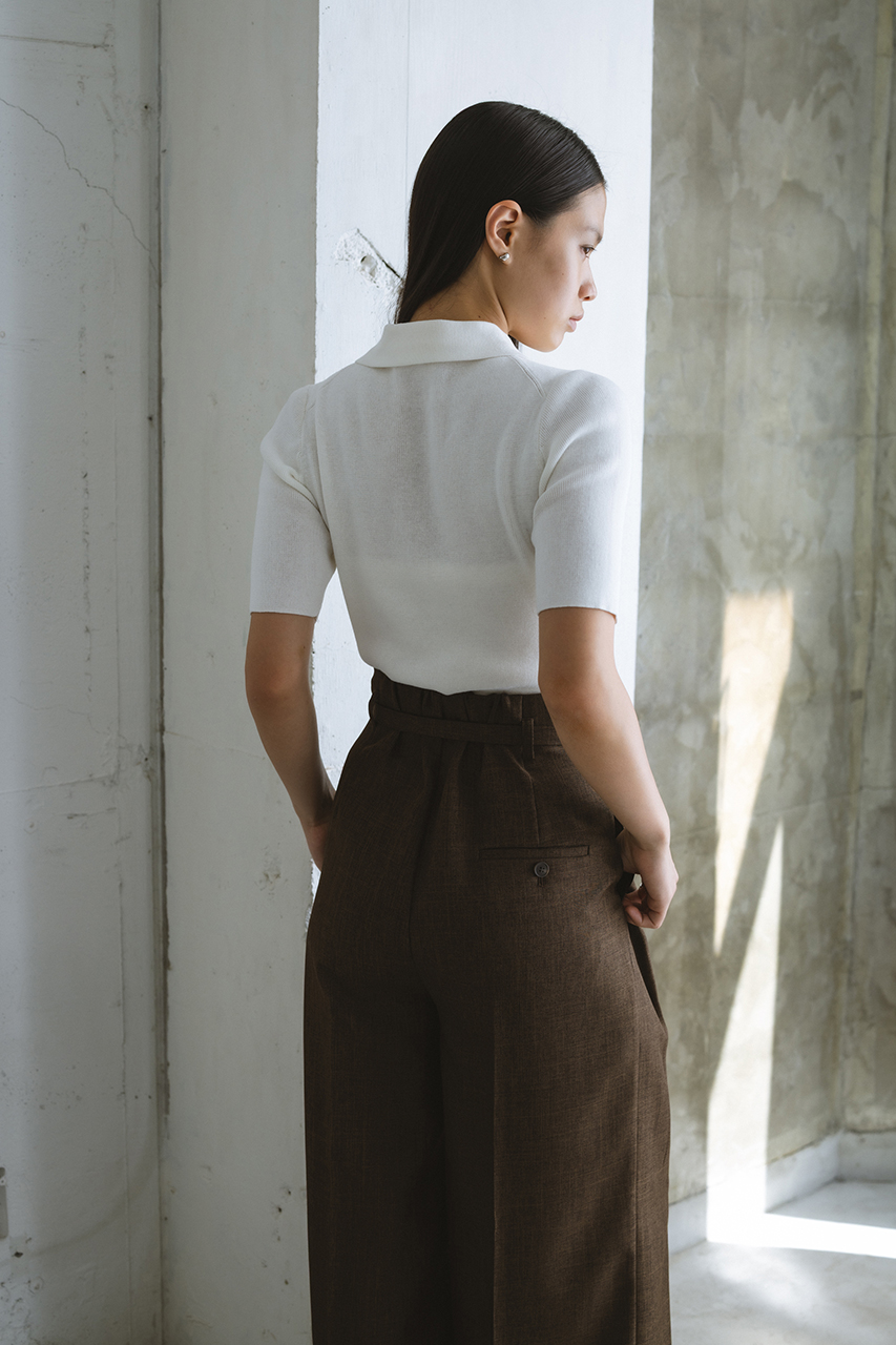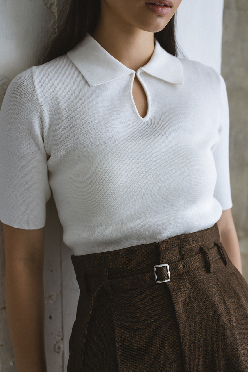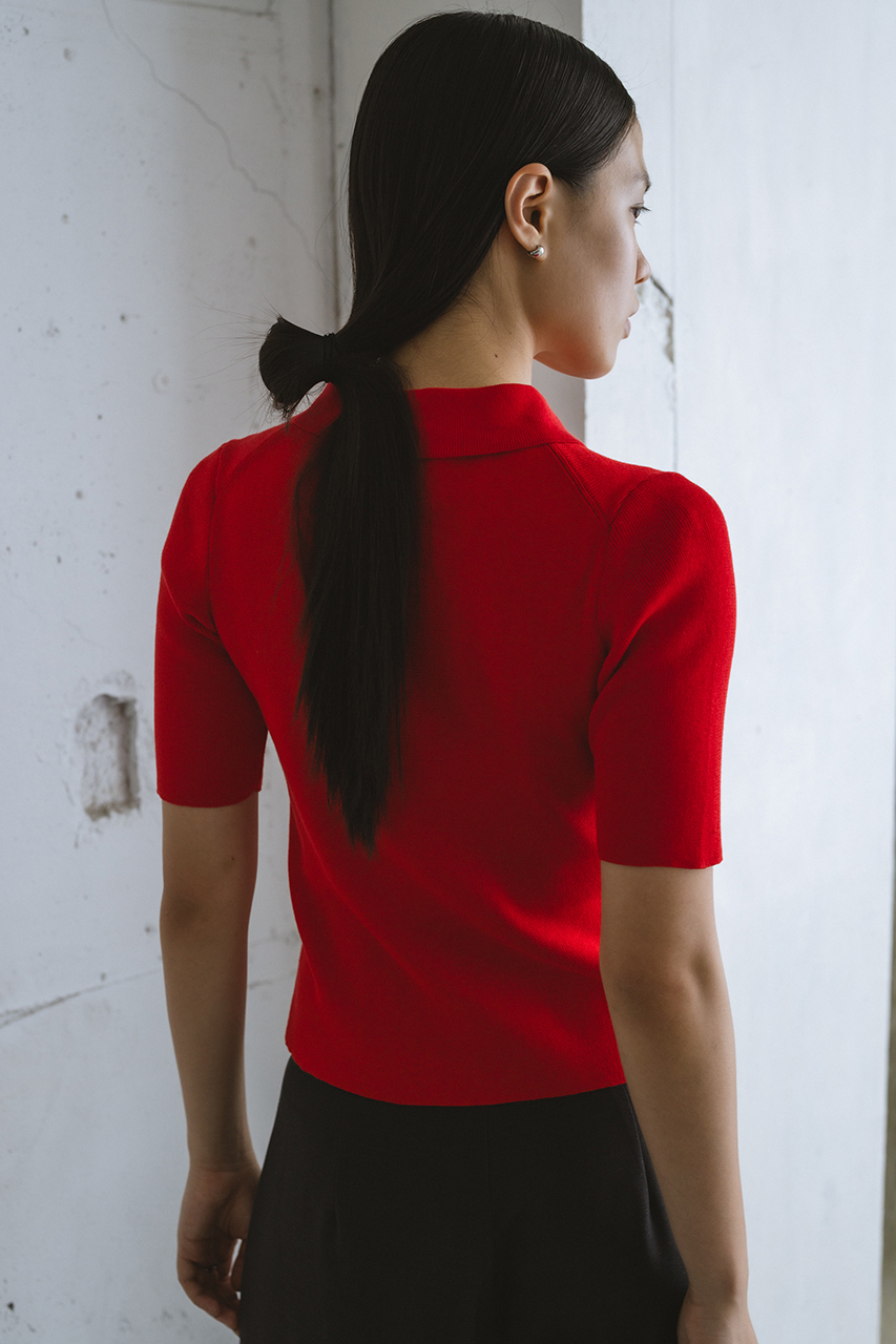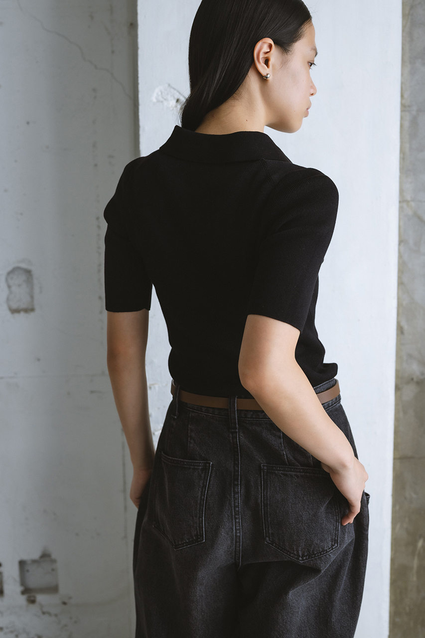フロントホールがポイントのポロニット。すっきりとしたサイズ感でボトムスにインしてもアウトしても決まりやすい丈に仕上げました。ホール部分は鍵ホック開閉可能。ストレッチあり、透け感なし。