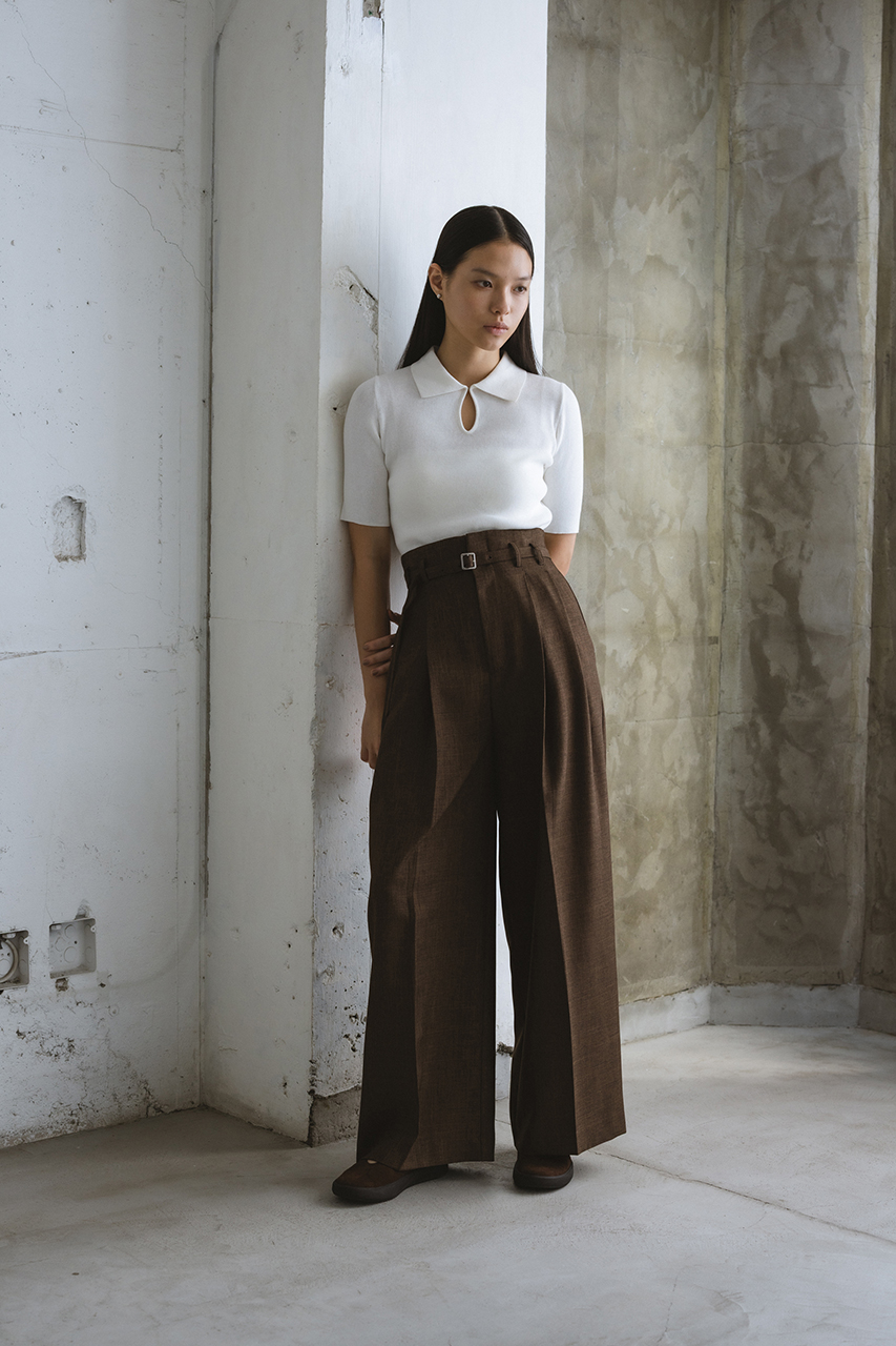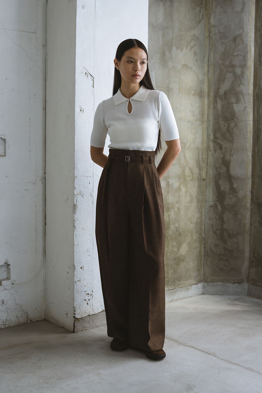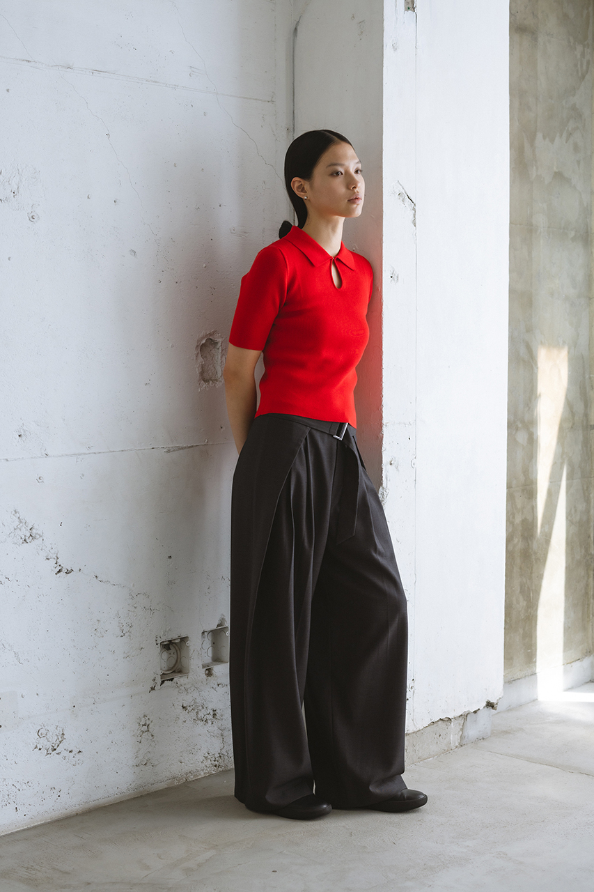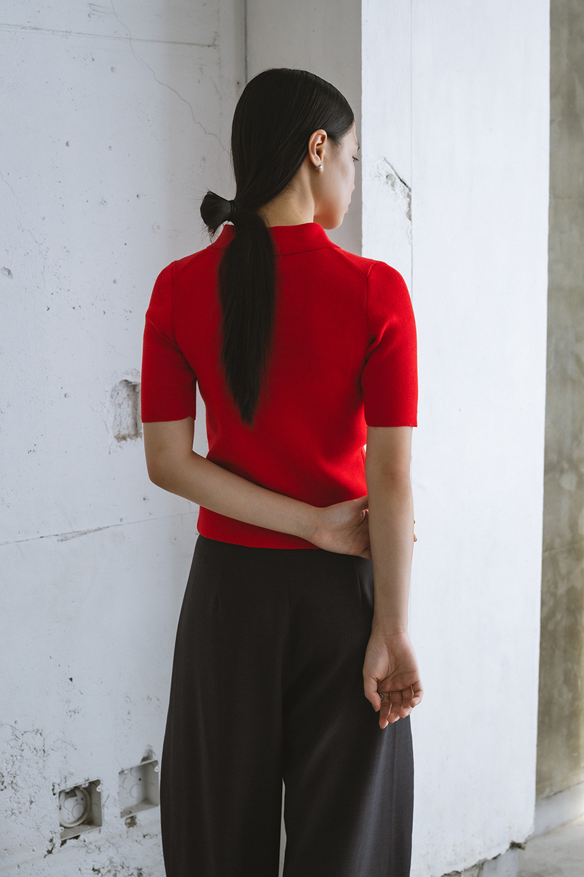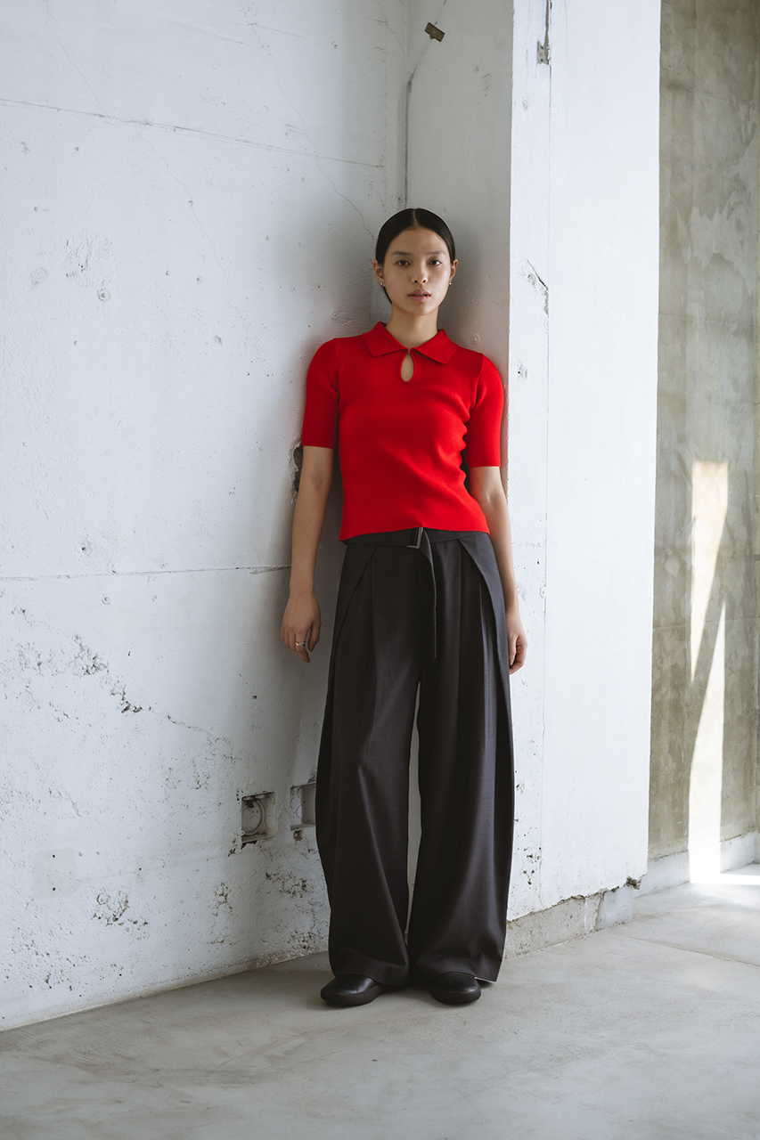 フロントホールがポイントのポロニット。すっきりとしたサイズ感でボトムスにインしてもアウトしても決まりやすい丈に仕上げました。ホール部分は鍵ホック開閉可能。ストレッチあり、透け感なし。
