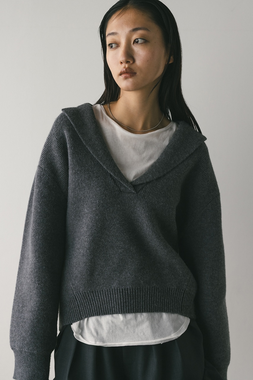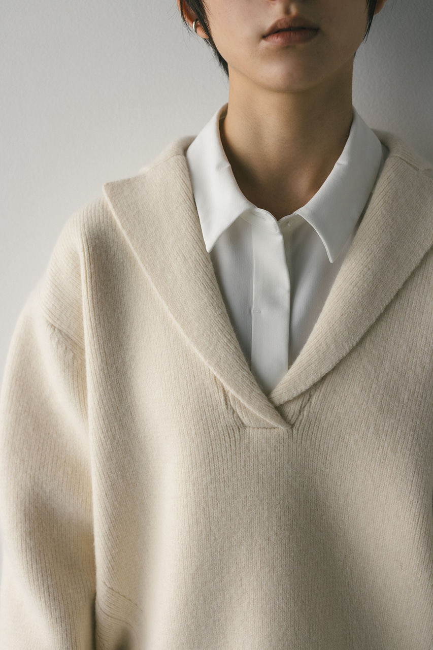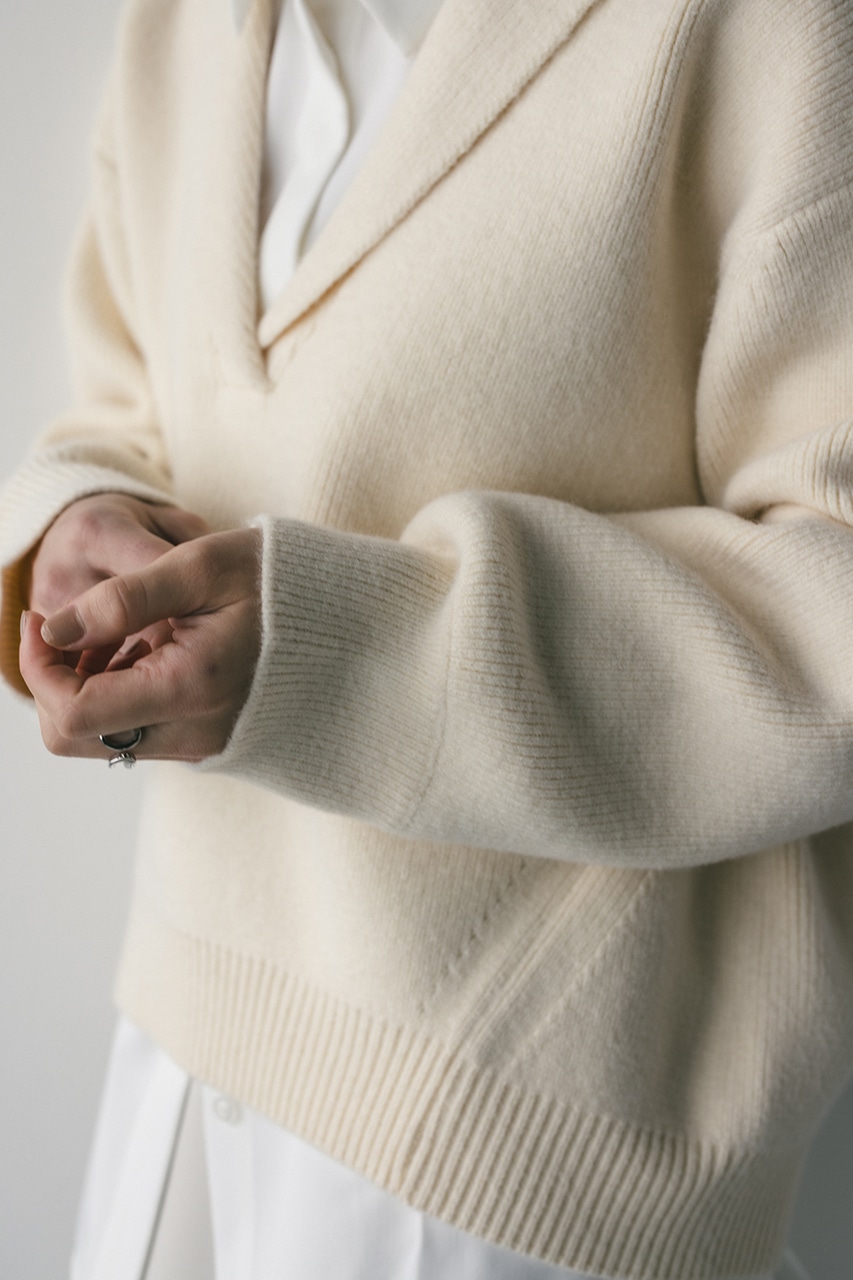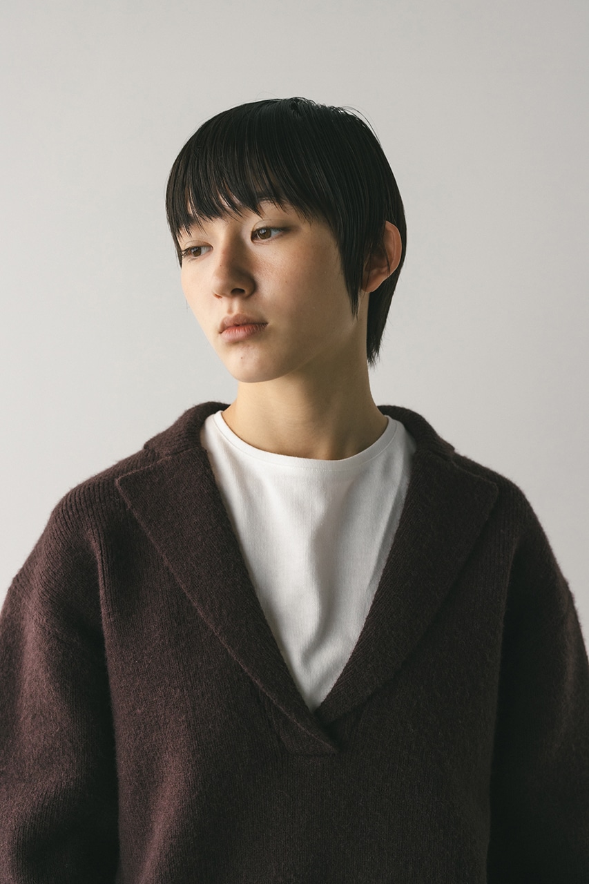 前下がりが深めにあいた抜け感のあるマニッシュなテーラーカラーニット。脇線を前に振り前後差をつけることで、シルエットにフォルム感がプラスされ、ボディラインを拾わずモードに着用していただけます。インナーにハイゲージニットやカットトップをレイヤードし、テーラーカラーを後ろに抜かしてスタイリングするのがおすすめ。ストレッチあり、透け感なし