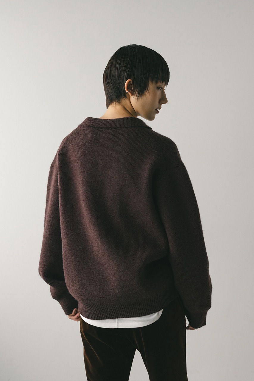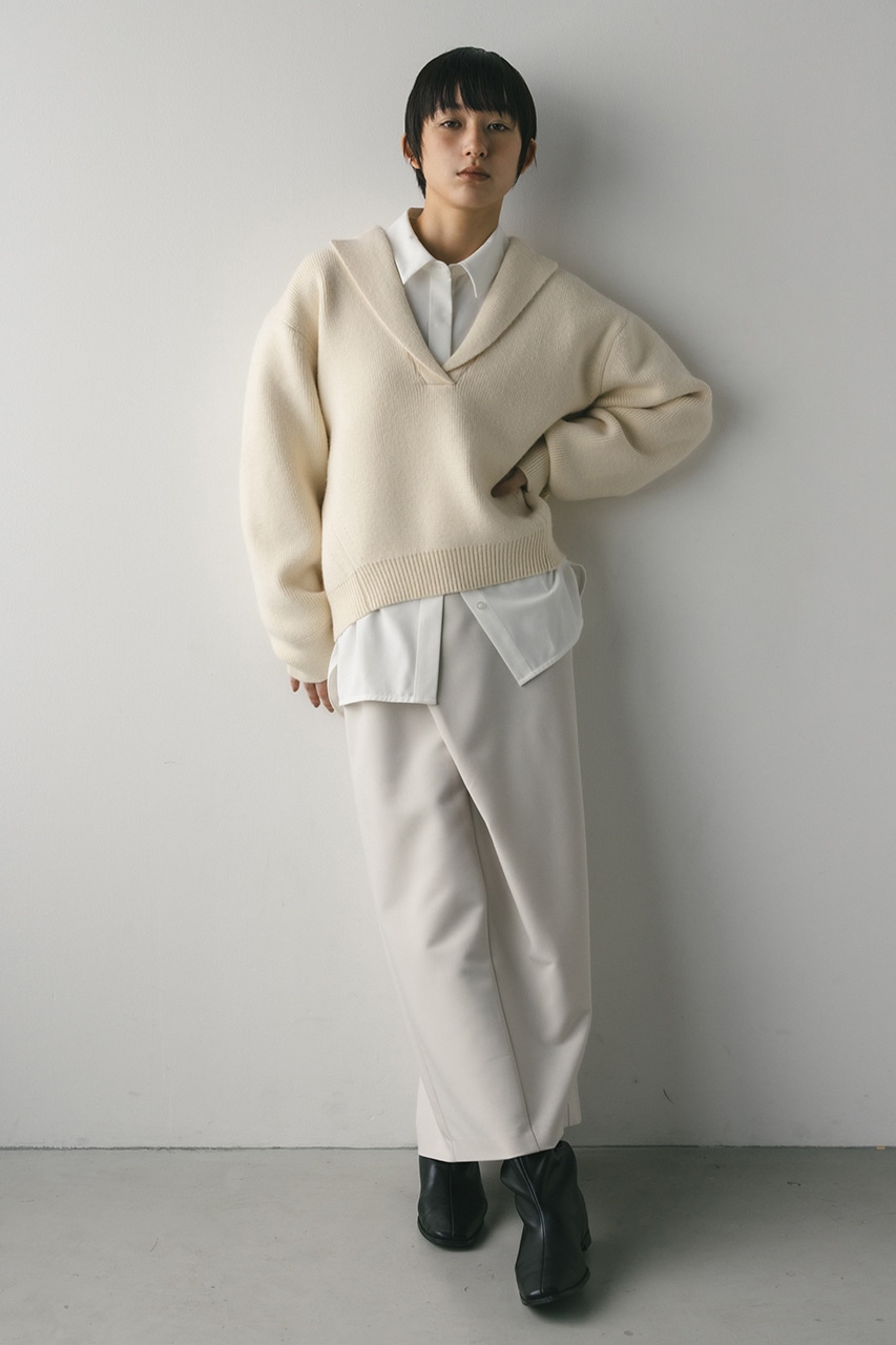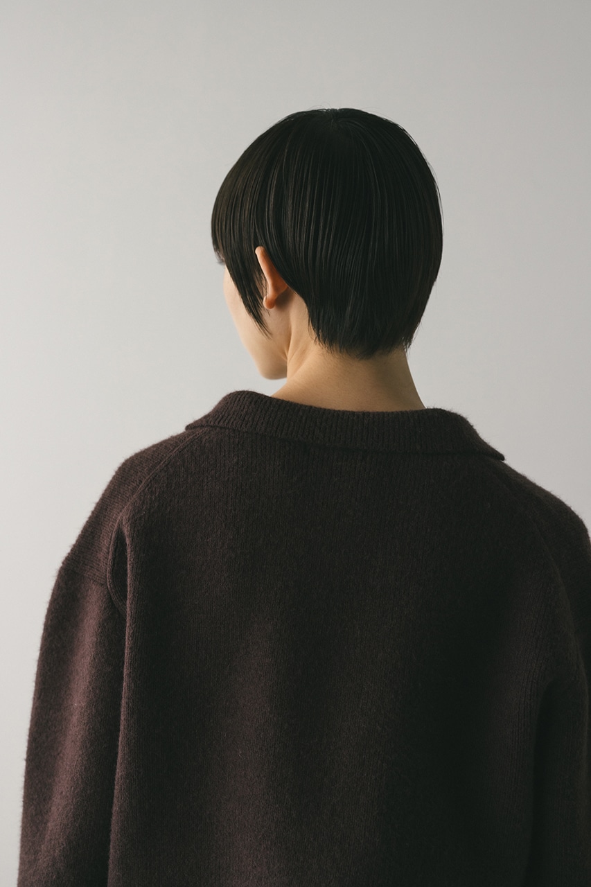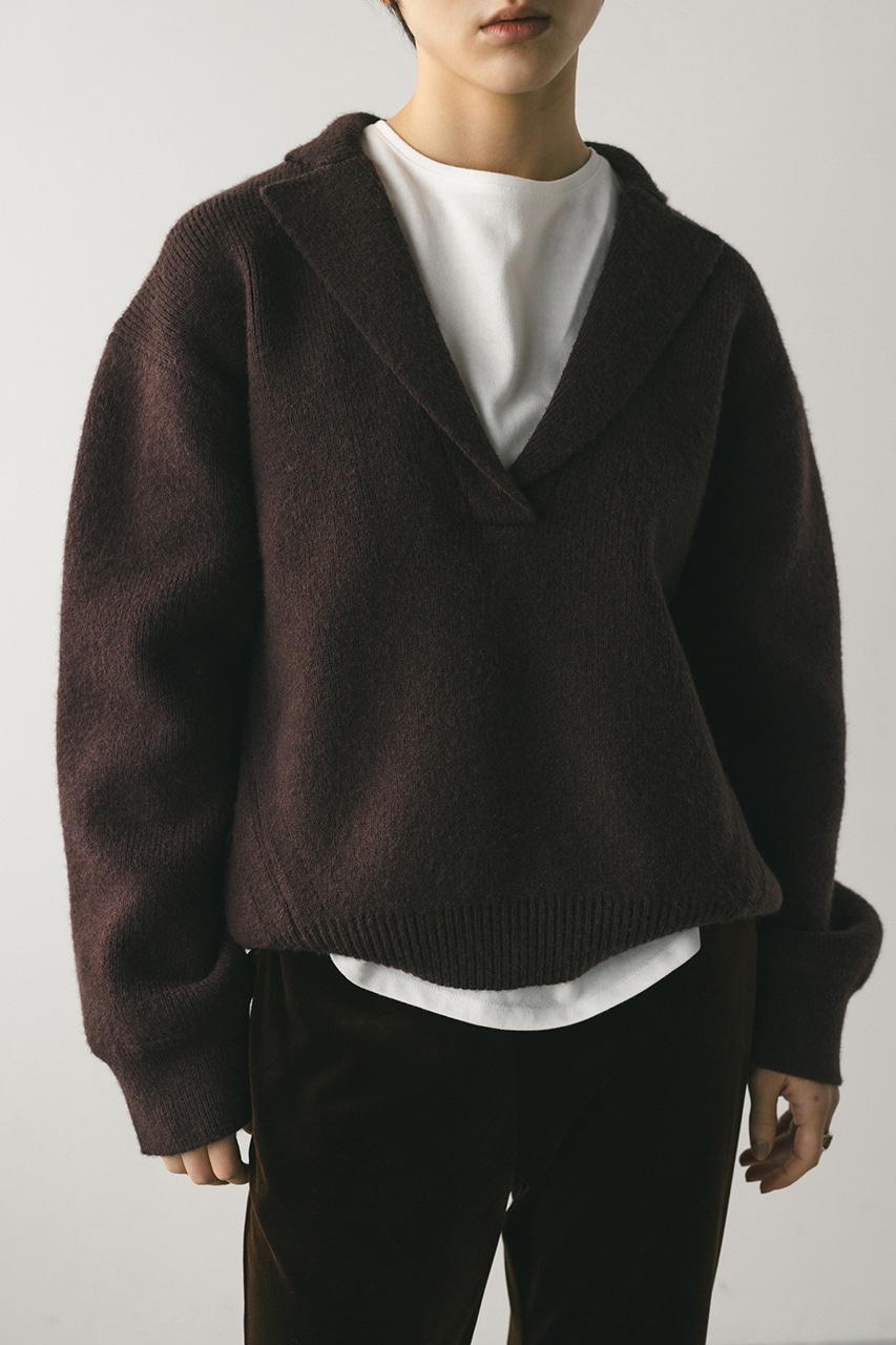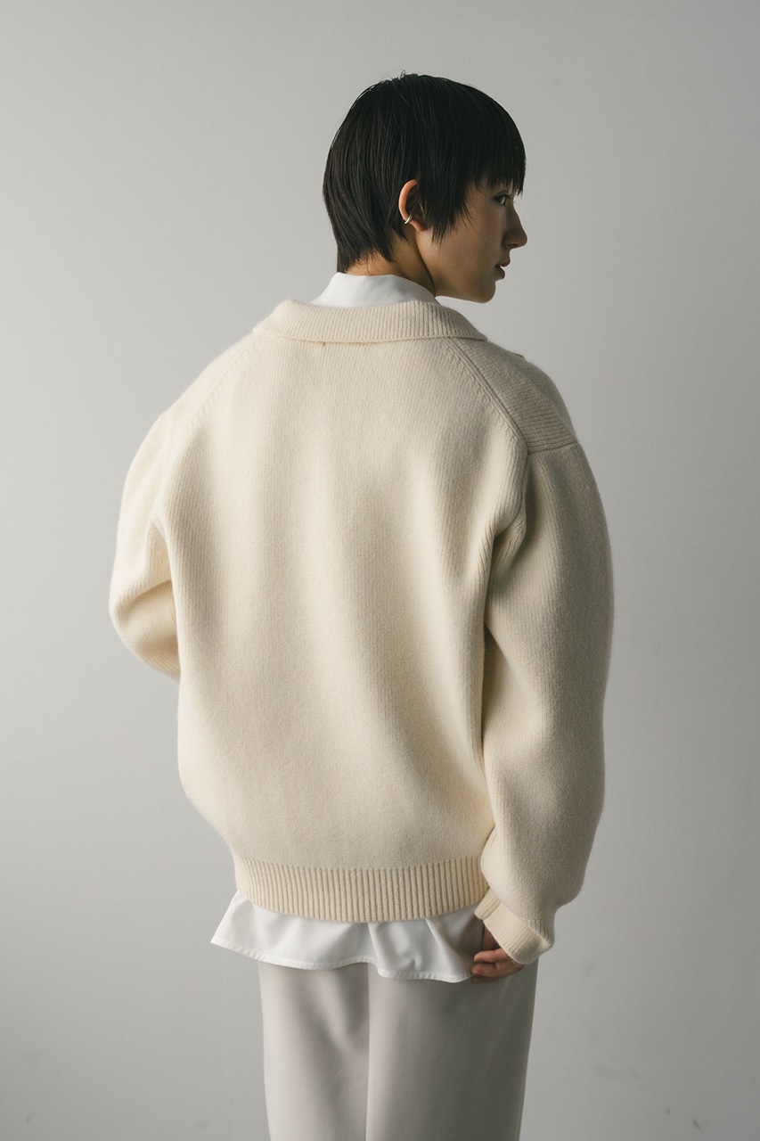 前下がりが深めにあいた抜け感のあるマニッシュなテーラーカラーニット。脇線を前に振り前後差をつけることで、シルエットにフォルム感がプラスされ、ボディラインを拾わずモードに着用していただけます。インナーにハイゲージニットやカットトップをレイヤードし、テーラーカラーを後ろに抜かしてスタイリングするのがおすすめ。ストレッチあり、透け感なし