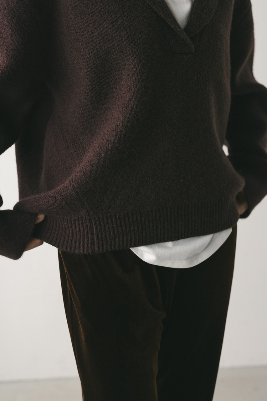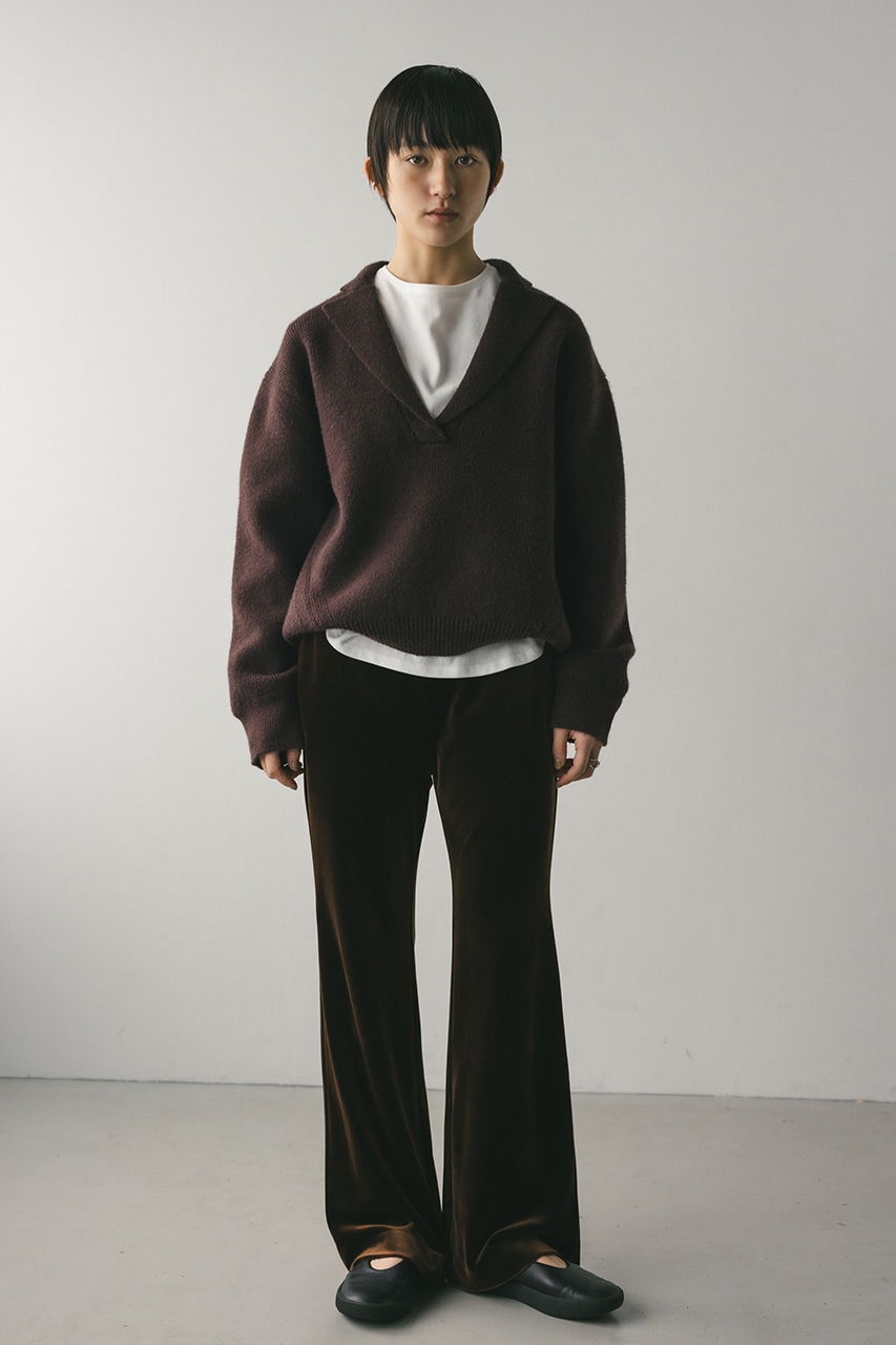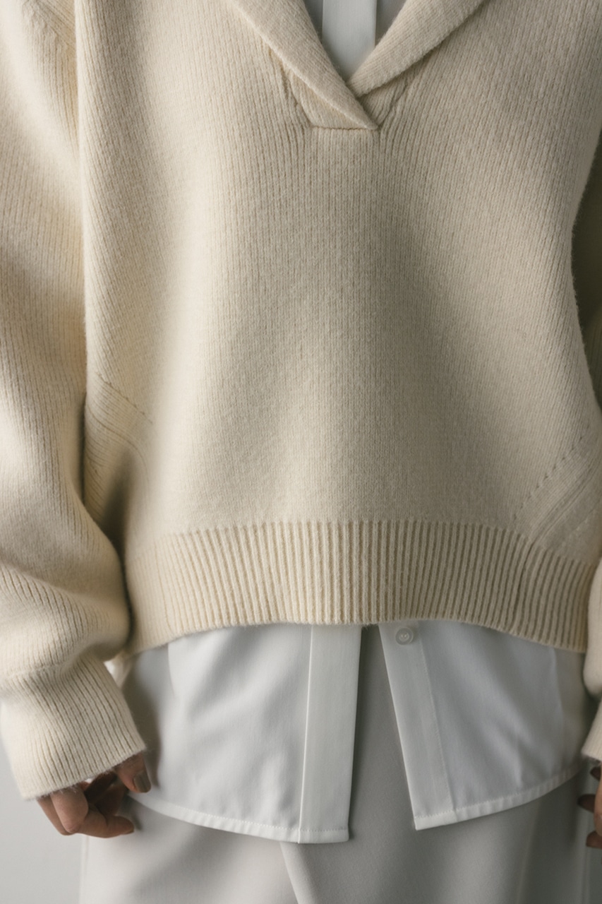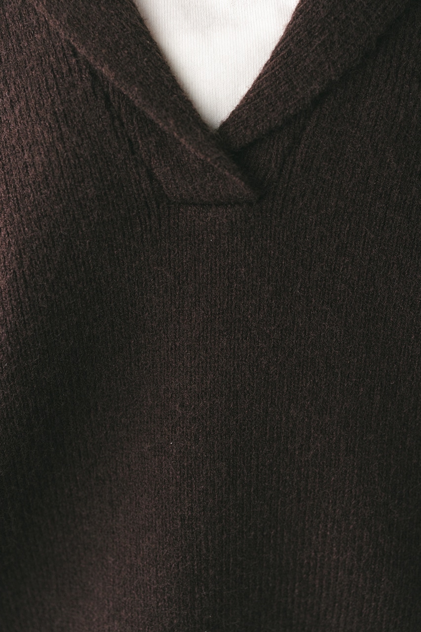 前下がりが深めにあいた抜け感のあるマニッシュなテーラーカラーニット。脇線を前に振り前後差をつけることで、シルエットにフォルム感がプラスされ、ボディラインを拾わずモードに着用していただけます。インナーにハイゲージニットやカットトップをレイヤードし、テーラーカラーを後ろに抜かしてスタイリングするのがおすすめ。ストレッチあり、透け感なし