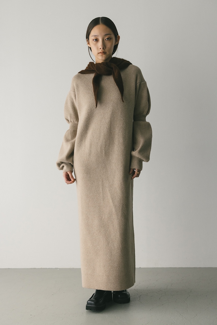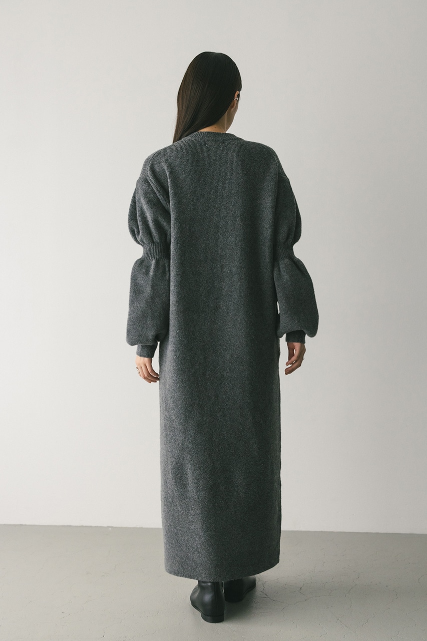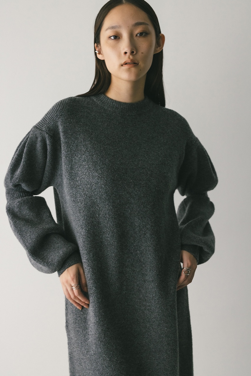 キャンディーのようにパフっとした袖がポイントのニットワンピース。身頃は片畦で編みたてることで、しっかりとした厚みがある身体のラインを拾いにくい仕様に仕上げました。あえて身頃はストレートシルエット、ロング丈にすることで、甘さの中にもスタミキらしいモードな雰囲気をプラスしています。透け感なし、ストレッチあり。