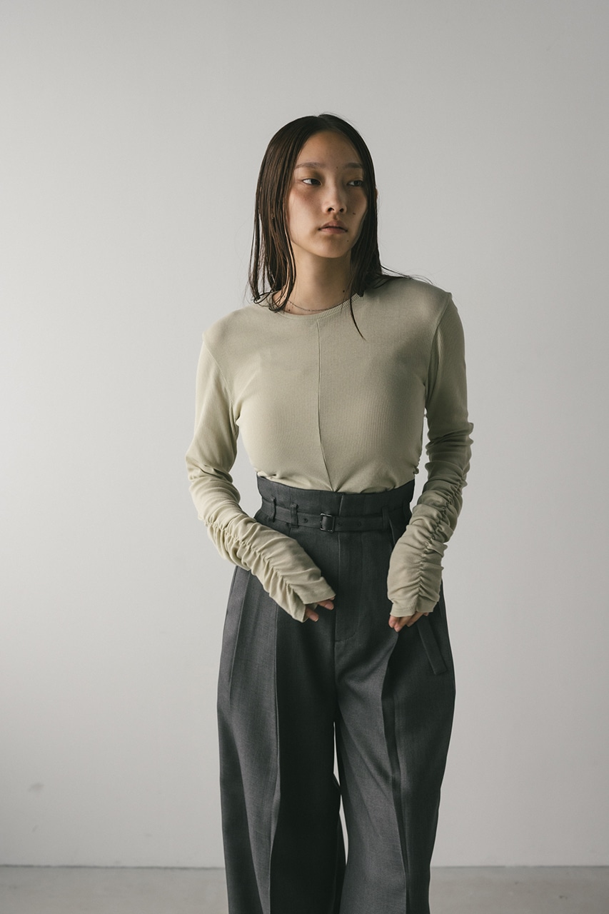 強撚糸で編みたてたドライタッチな長袖リブカットソー。ボディーと袖部分にたっぷりと入ったギャザーがデザインポイント。コンパクトのサイズ感なのでニットや羽織りのインナーとしても着用頂けます。ストレッチあり、透け感あり。