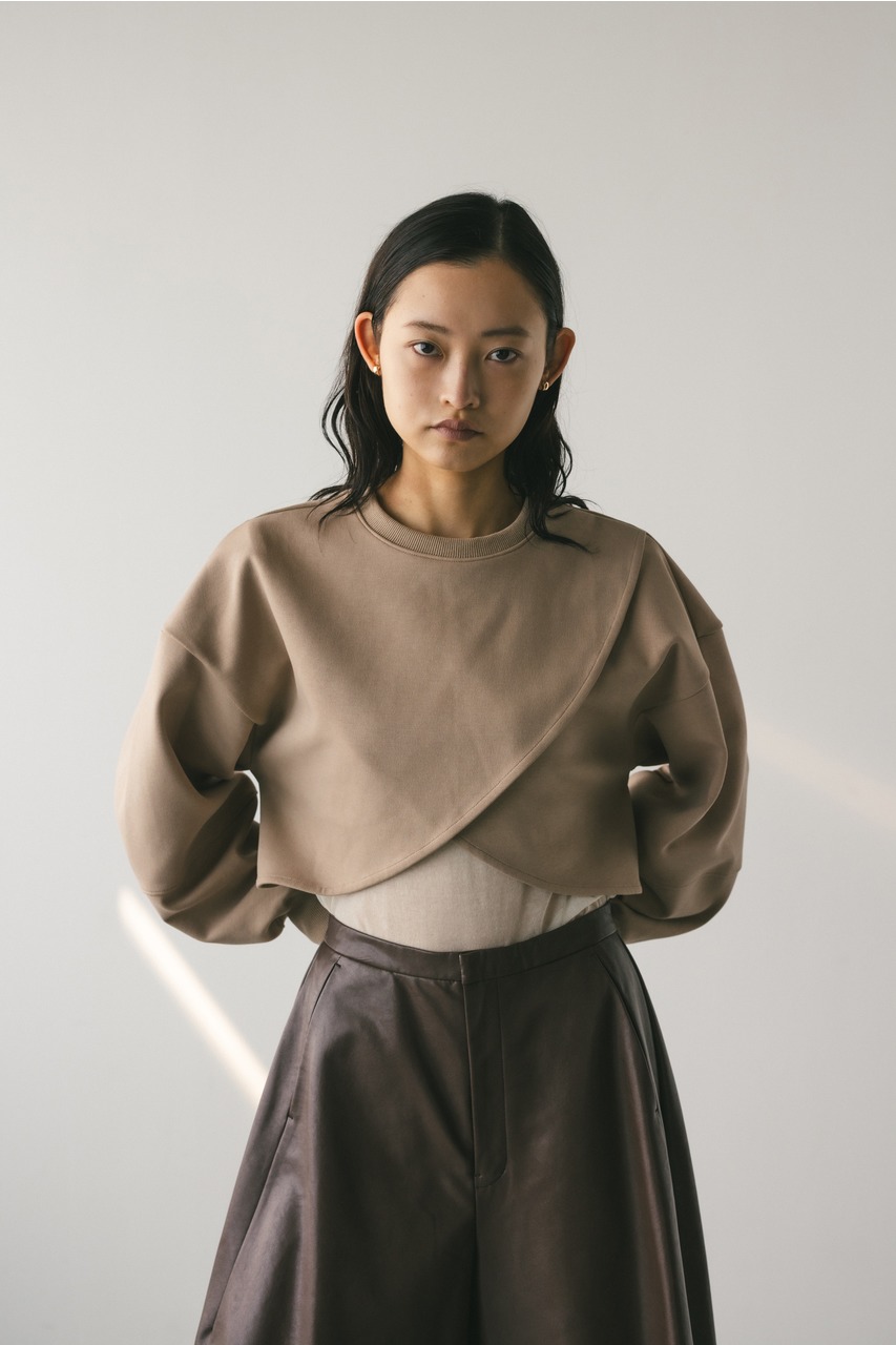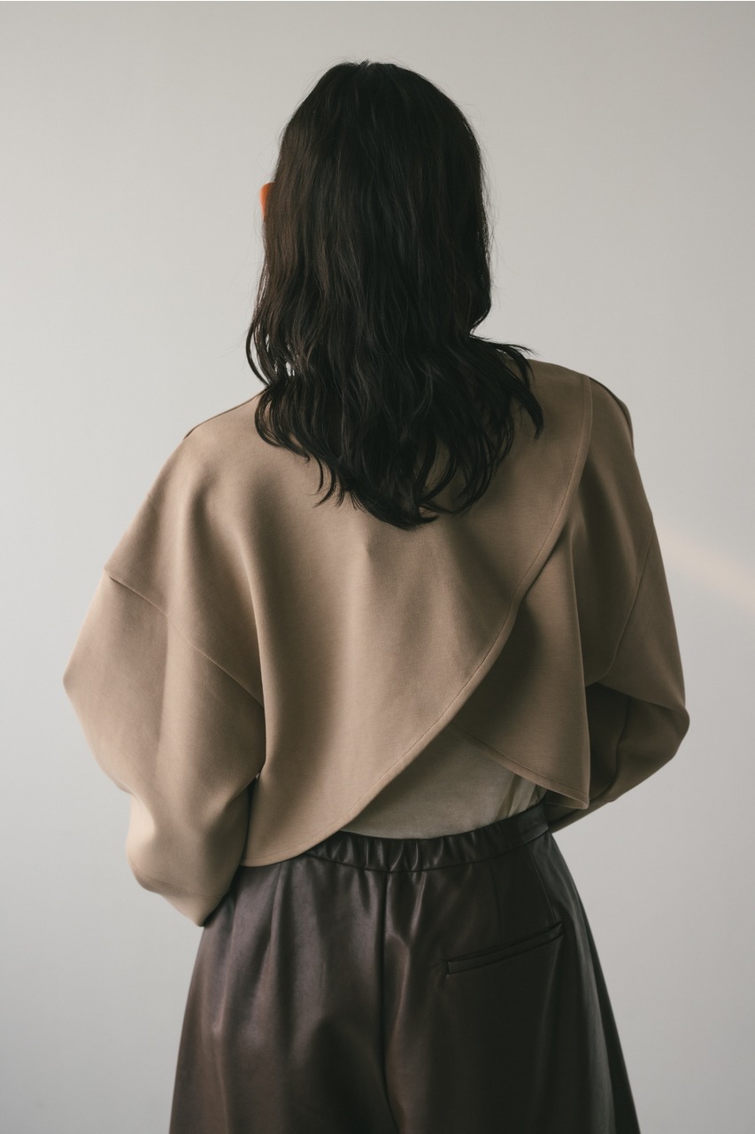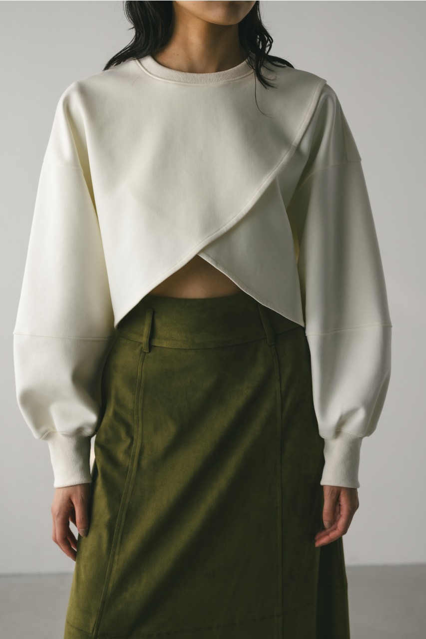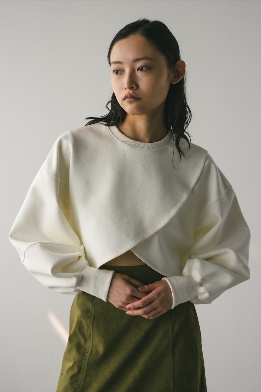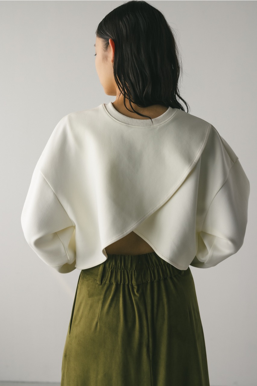 クロスデザインがポイントの前後2WAYで着用可能のダンボールトップ。バランスのとりやすいショート丈でボトムスを選ばず着用頂けます。ストレッチあり、透け感なし。