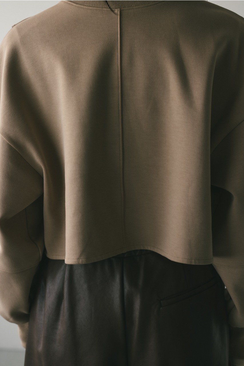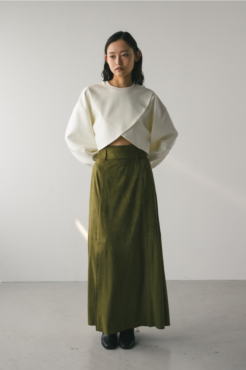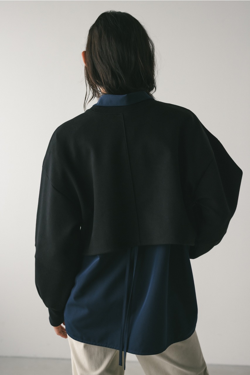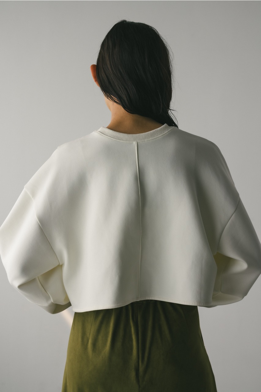 クロスデザインがポイントの前後2WAYで着用可能のダンボールトップ。バランスのとりやすいショート丈でボトムスを選ばず着用頂けます。ストレッチあり、透け感なし。