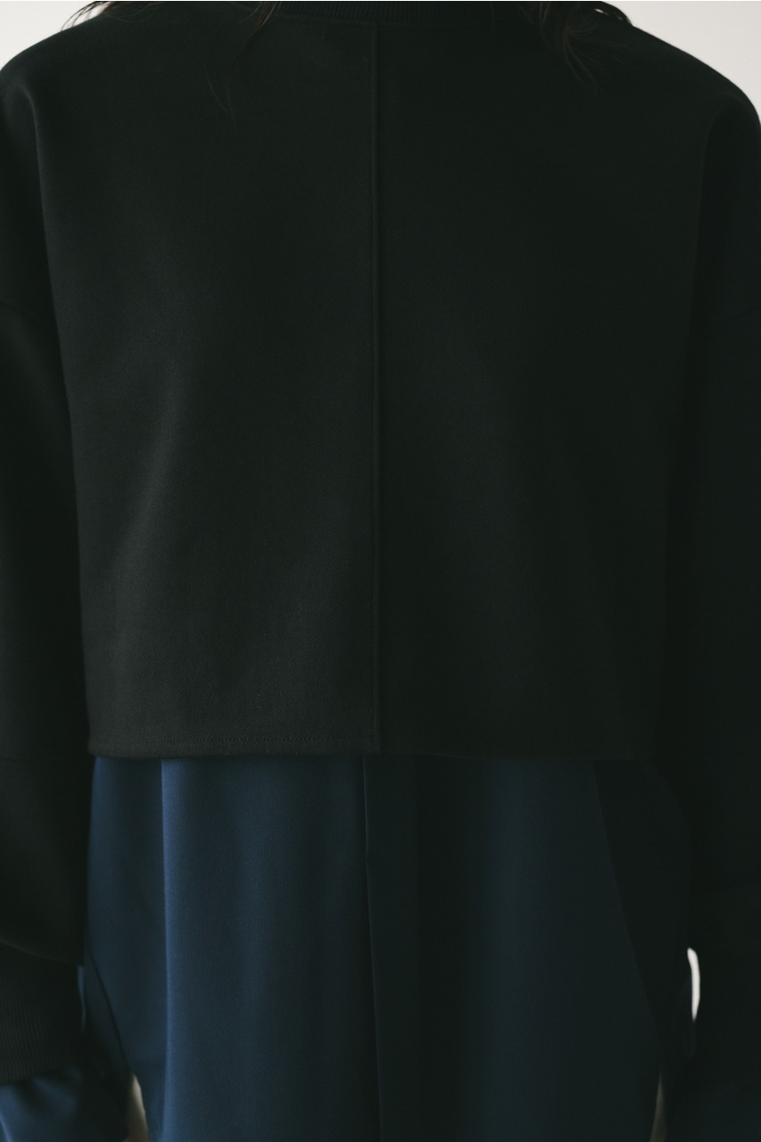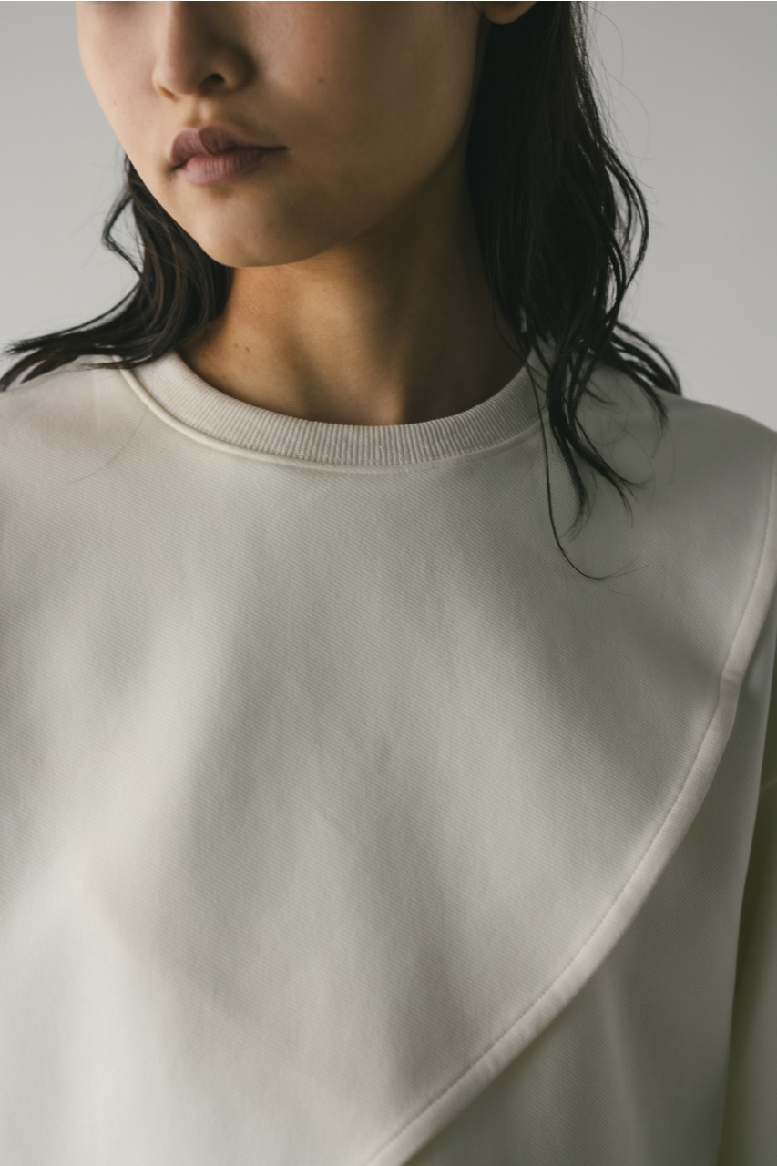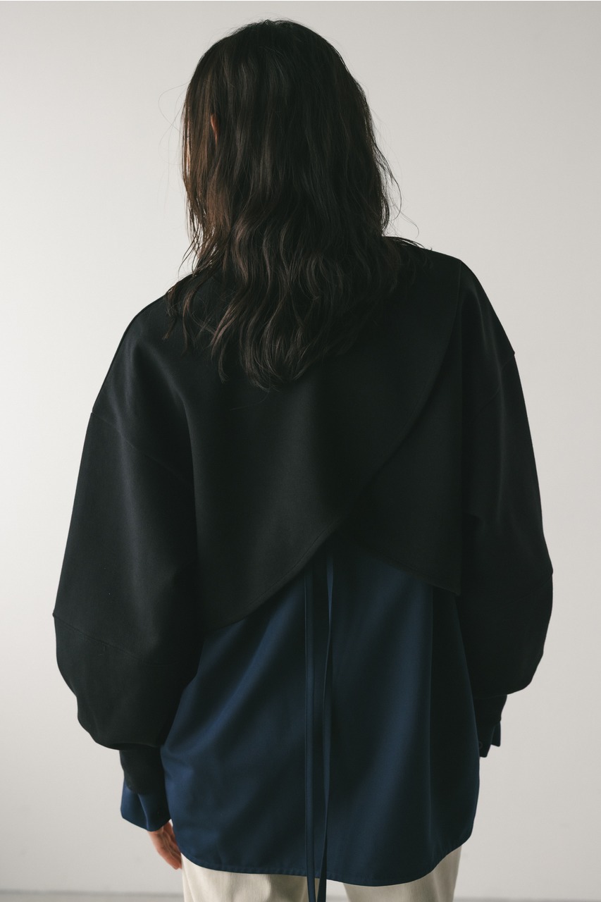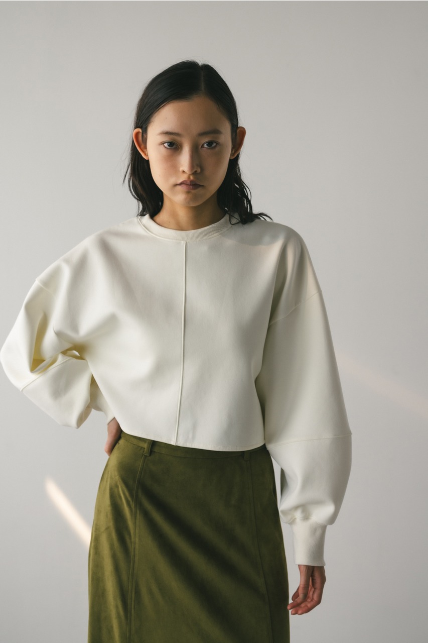 クロスデザインがポイントの前後2WAYで着用可能のダンボールトップ。バランスのとりやすいショート丈でボトムスを選ばず着用頂けます。ストレッチあり、透け感なし。