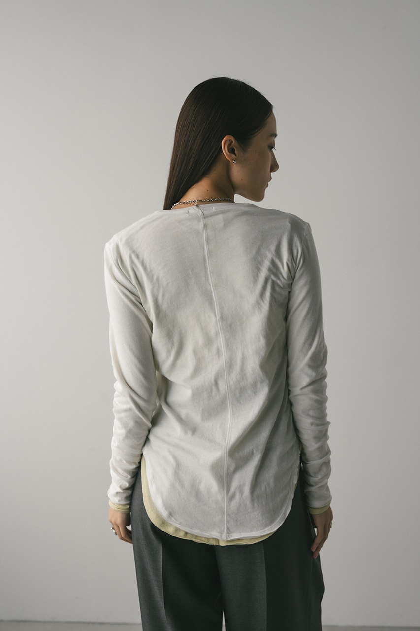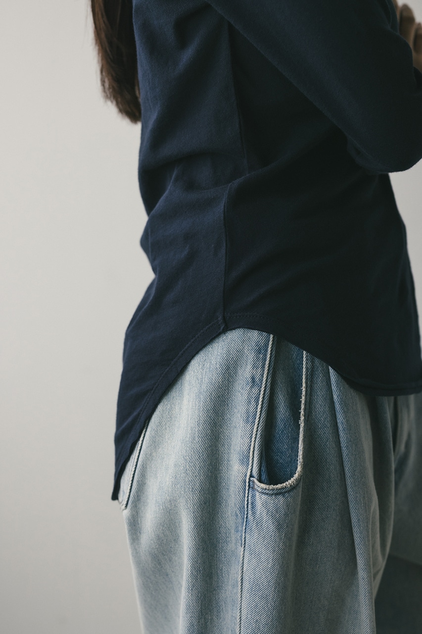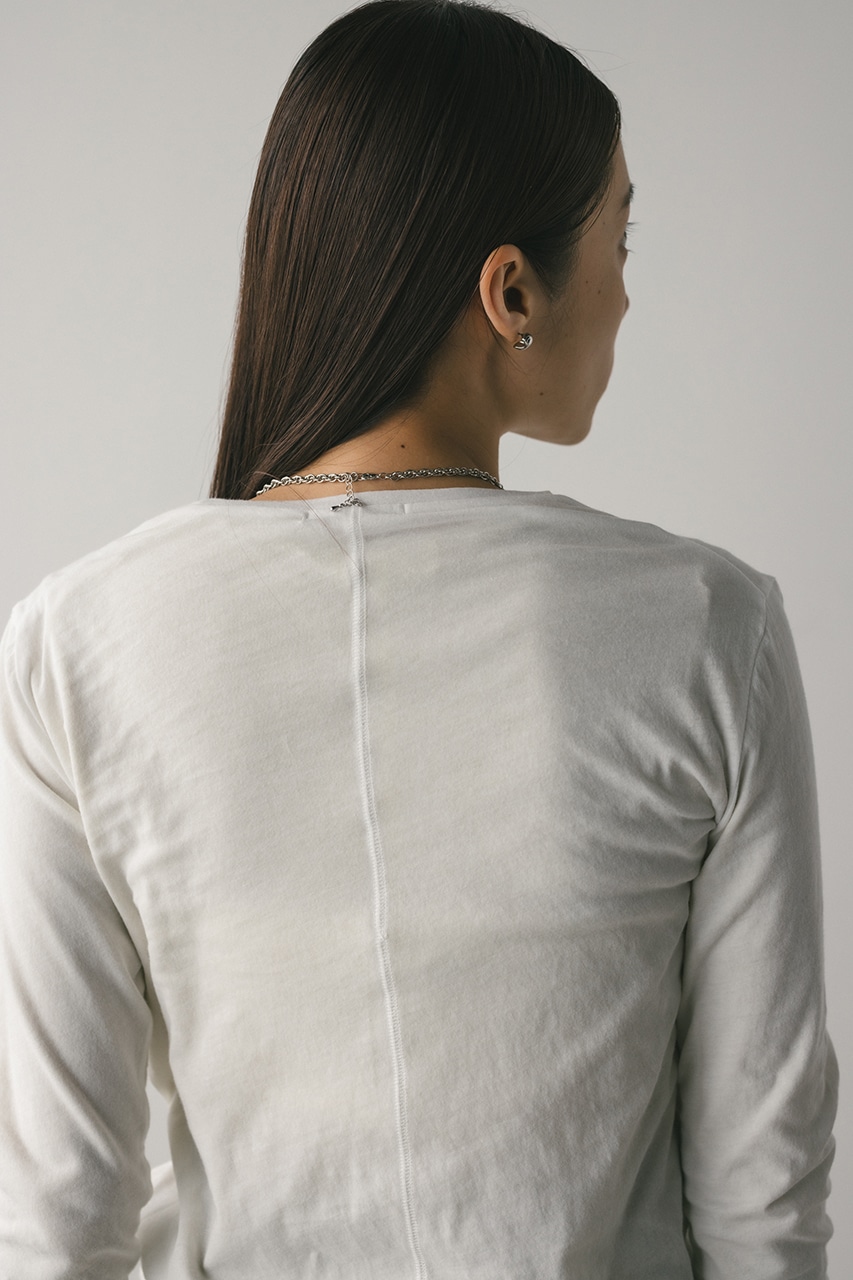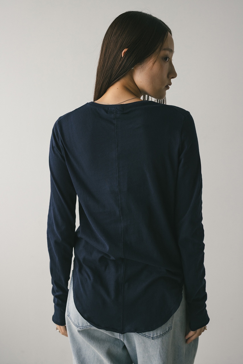 動きのあるヘムカーブラインとバックシームデザインがかわいいカットソー。肌なじみの良い薄めの天竺素材を使用した着心地の良いロンTです。ストレッチあり、透け感あり。