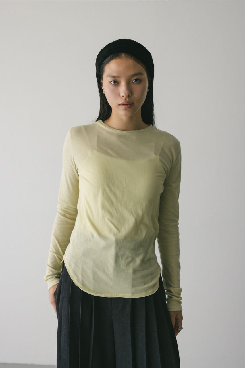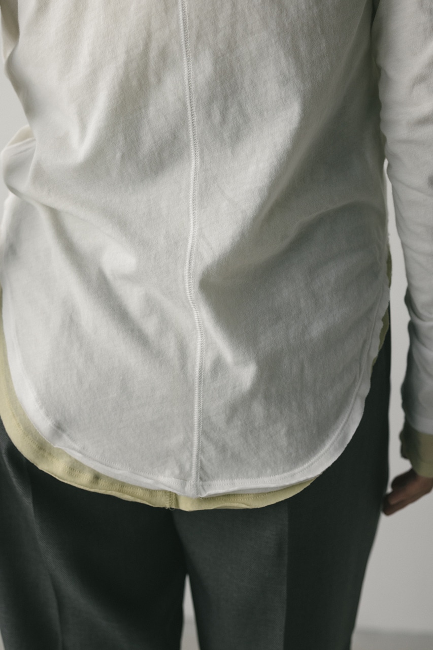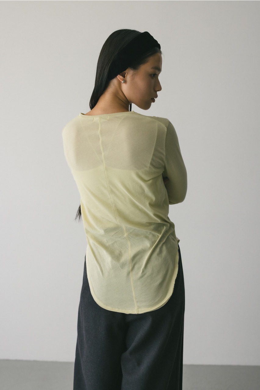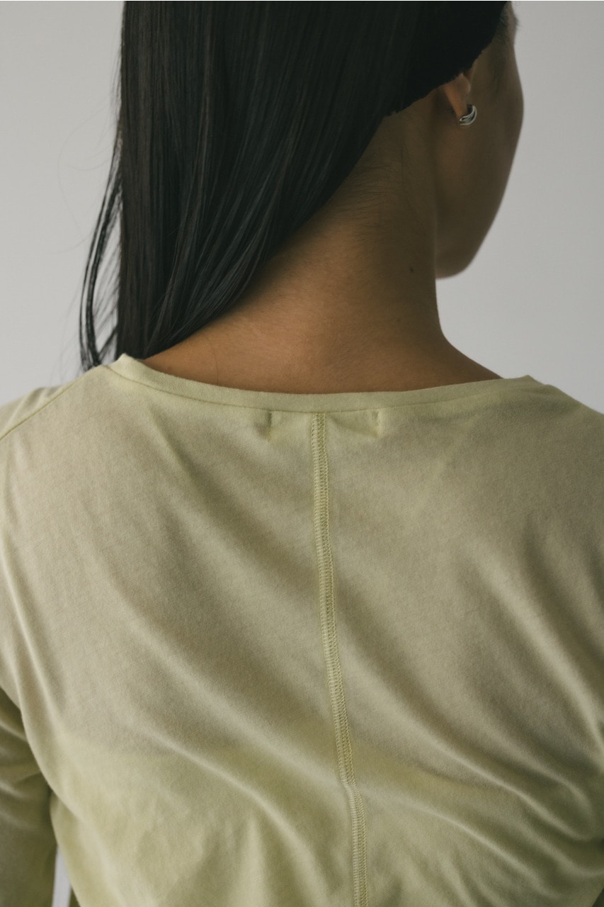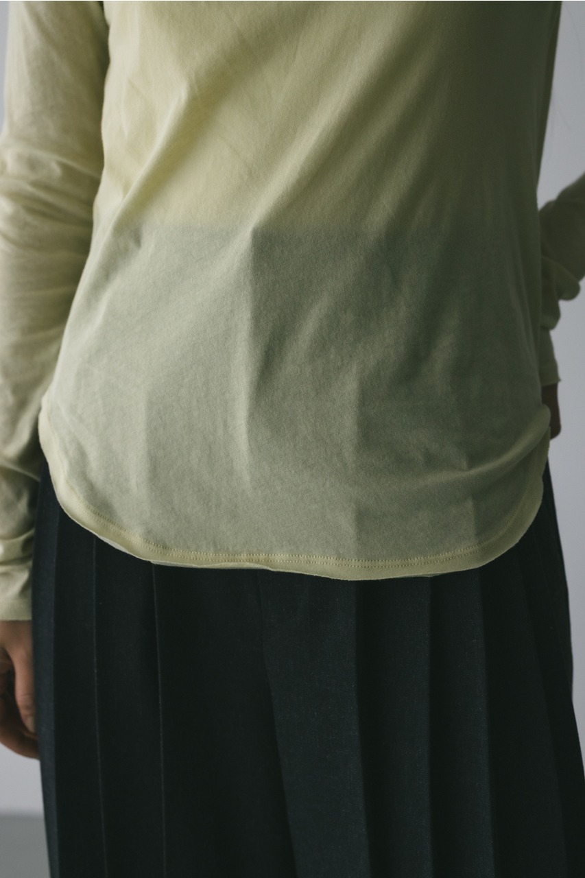 動きのあるヘムカーブラインとバックシームデザインがかわいいカットソー。肌なじみの良い薄めの天竺素材を使用した着心地の良いロンTです。ストレッチあり、透け感あり。