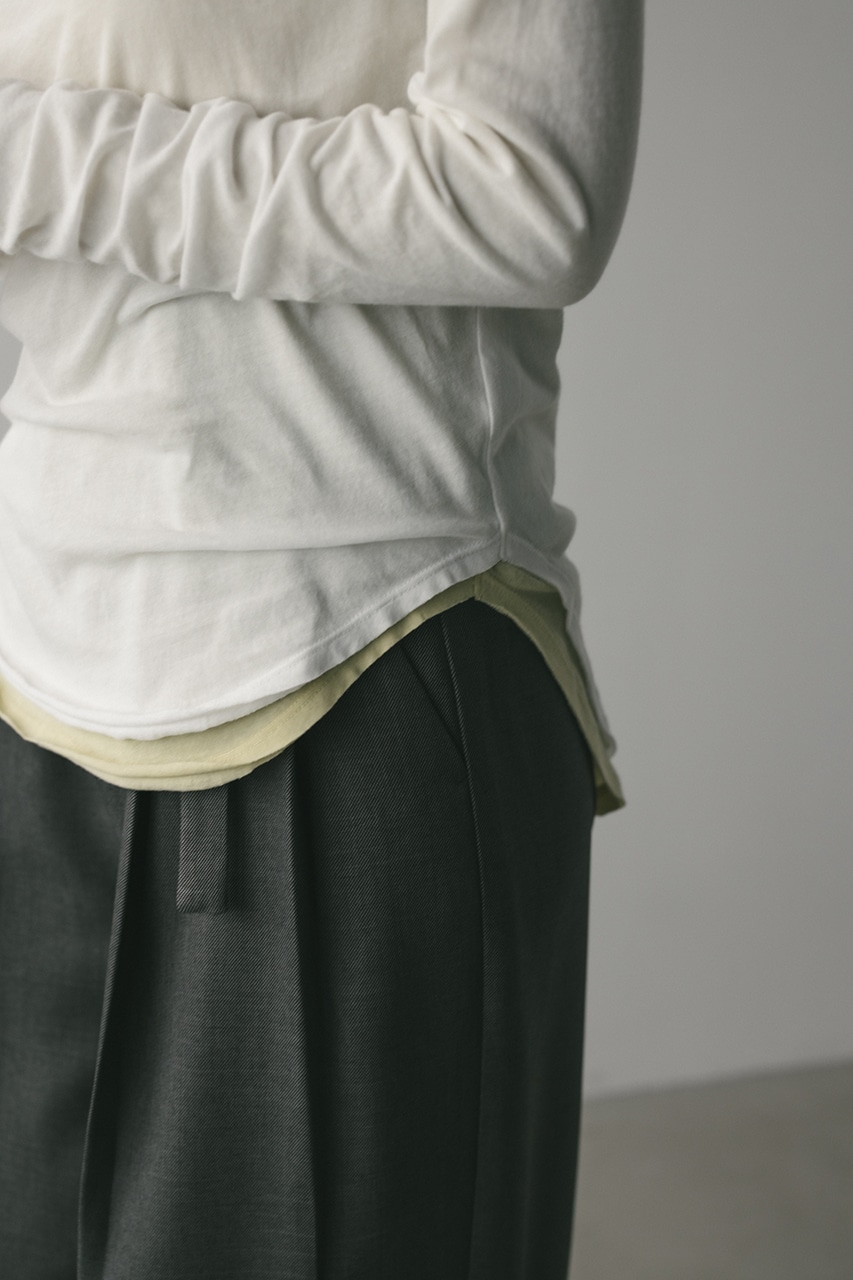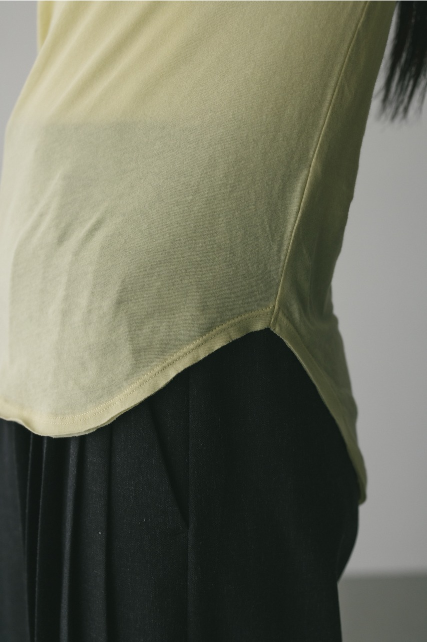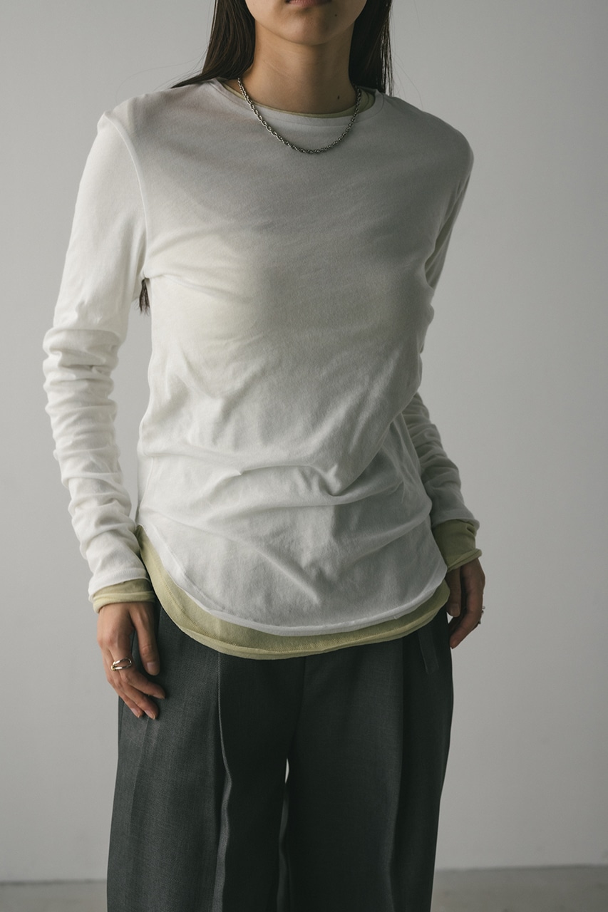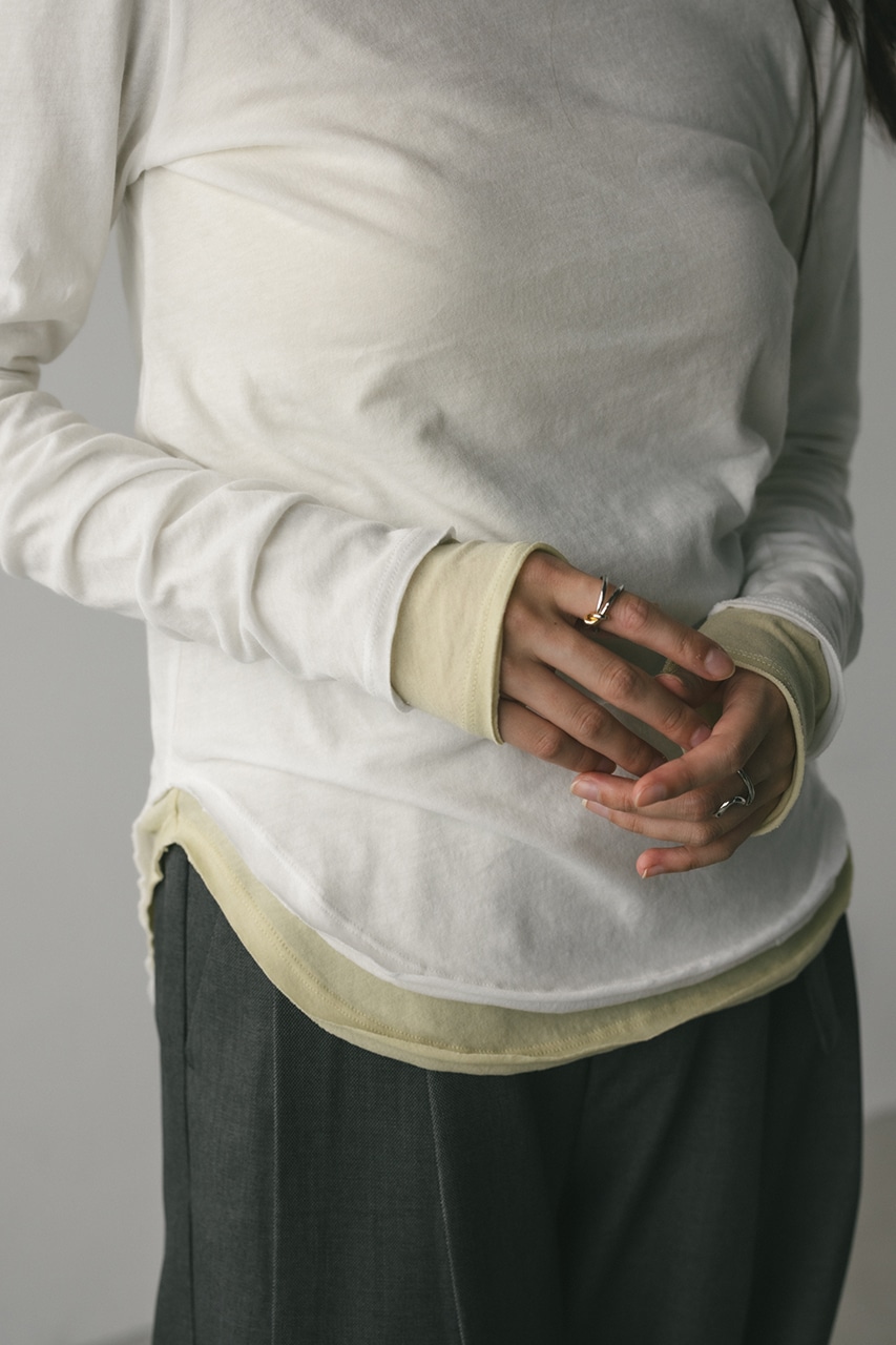動きのあるヘムカーブラインとバックシームデザインがかわいいカットソー。肌なじみの良い薄めの天竺素材を使用した着心地の良いロンTです。ストレッチあり、透け感あり。