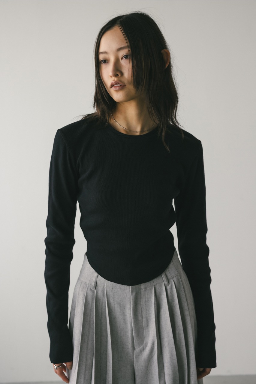 クリアで上品な印象の生地を使用したコンパクトなサイズ感で着回しやすいリブロンT。大きくラウンドしたヘムデザインがポイントでウエストをよりきれいに見せてくれる一枚。脇はぎを前に倒してサイドのもたつきをなくし、ショルダーハギは後ろに倒すことでショルダーラインをすっきり見せてくれます。ストレッチあり、透け感WHTややあり。