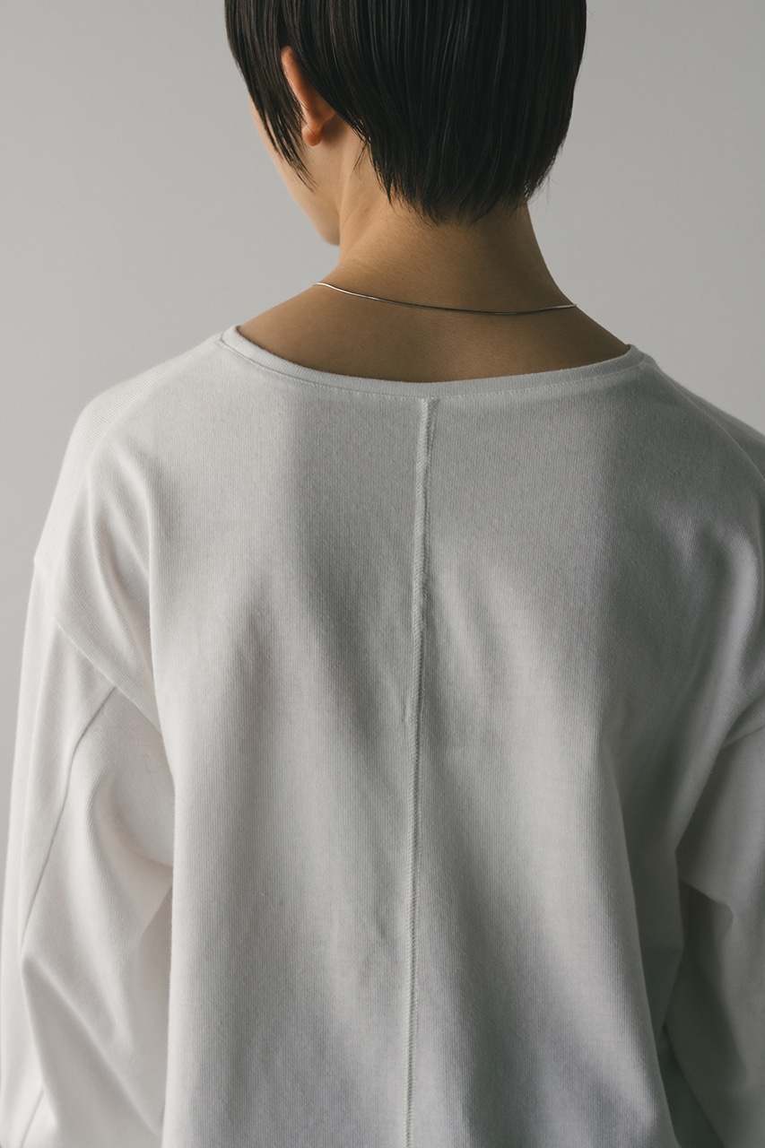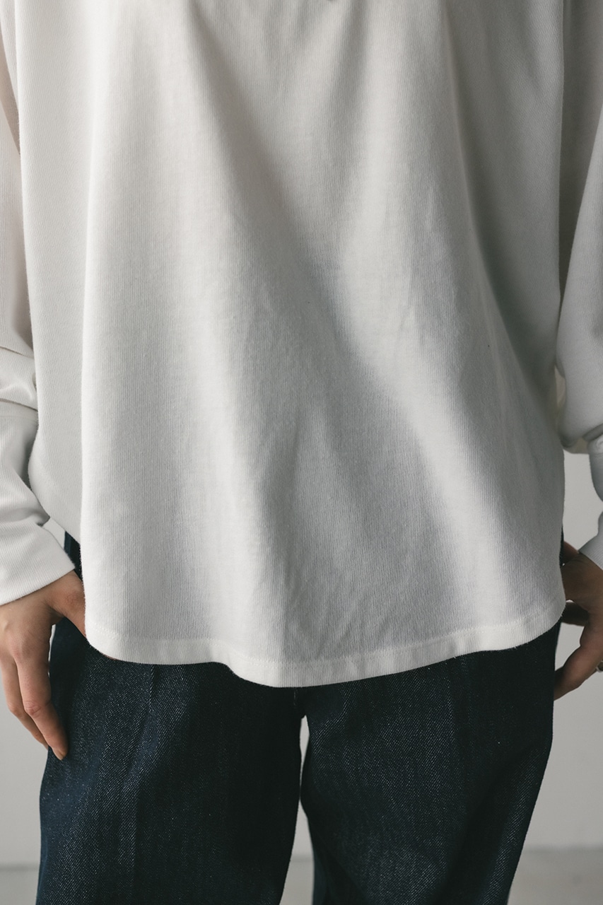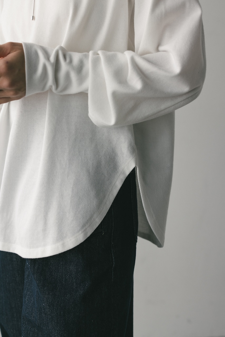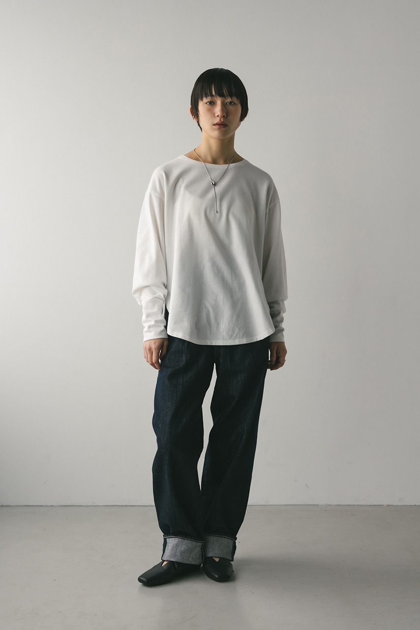程よく厚みがあり一枚でもインナーとしても使用しやすいコットン天竺Tシャツ。アームホールラインをあえてシャープなスクエア状にし、袖に丸みフォルムを加えたモードなシルエットがスタミキらしいデザインカットトップ。ラウンドヘムなので裾をインでもアウトでもさまになる一枚です。ストレッチあり、透け感ややあり。