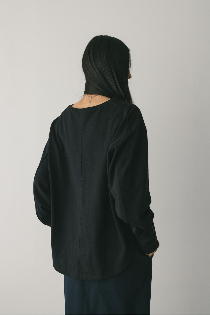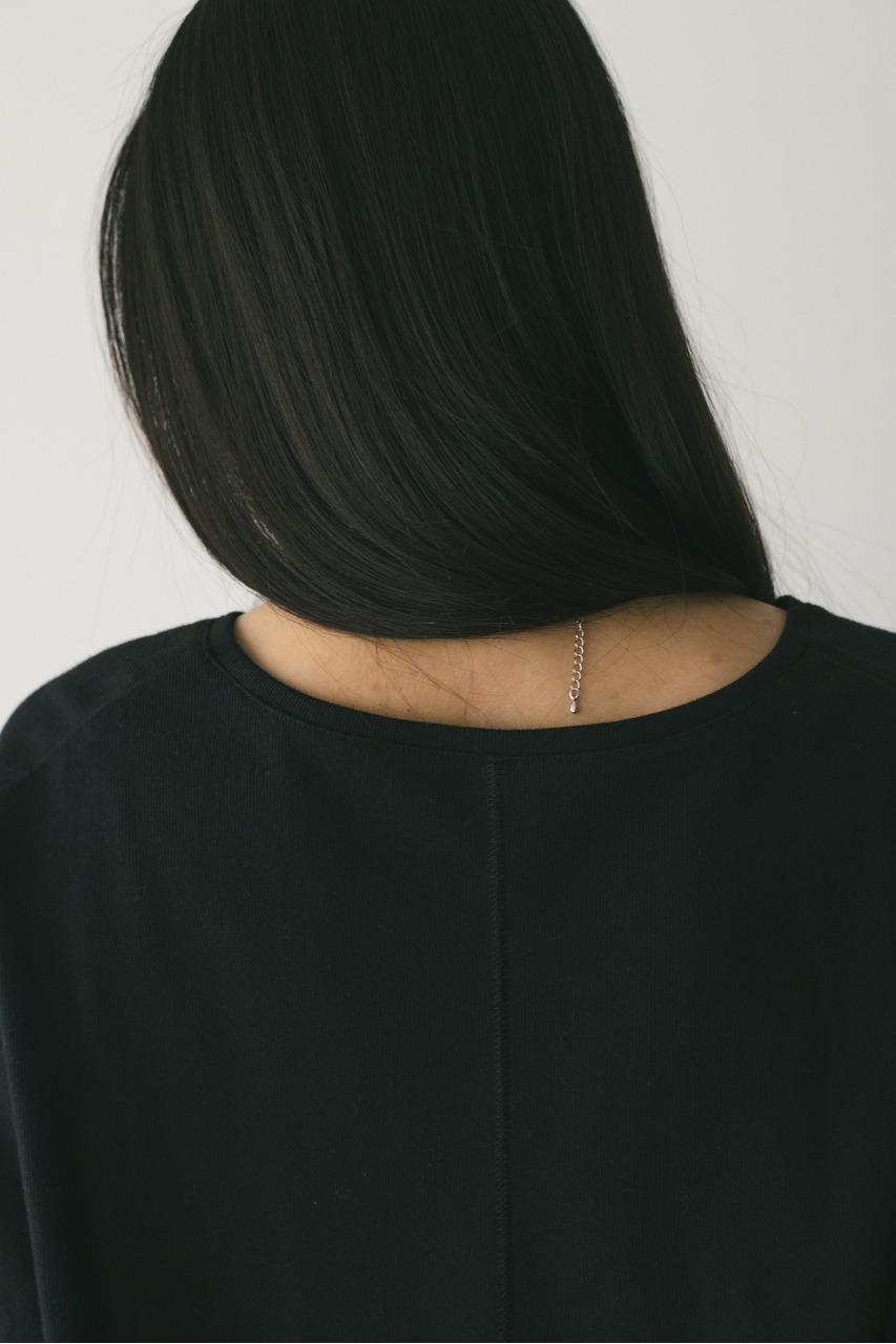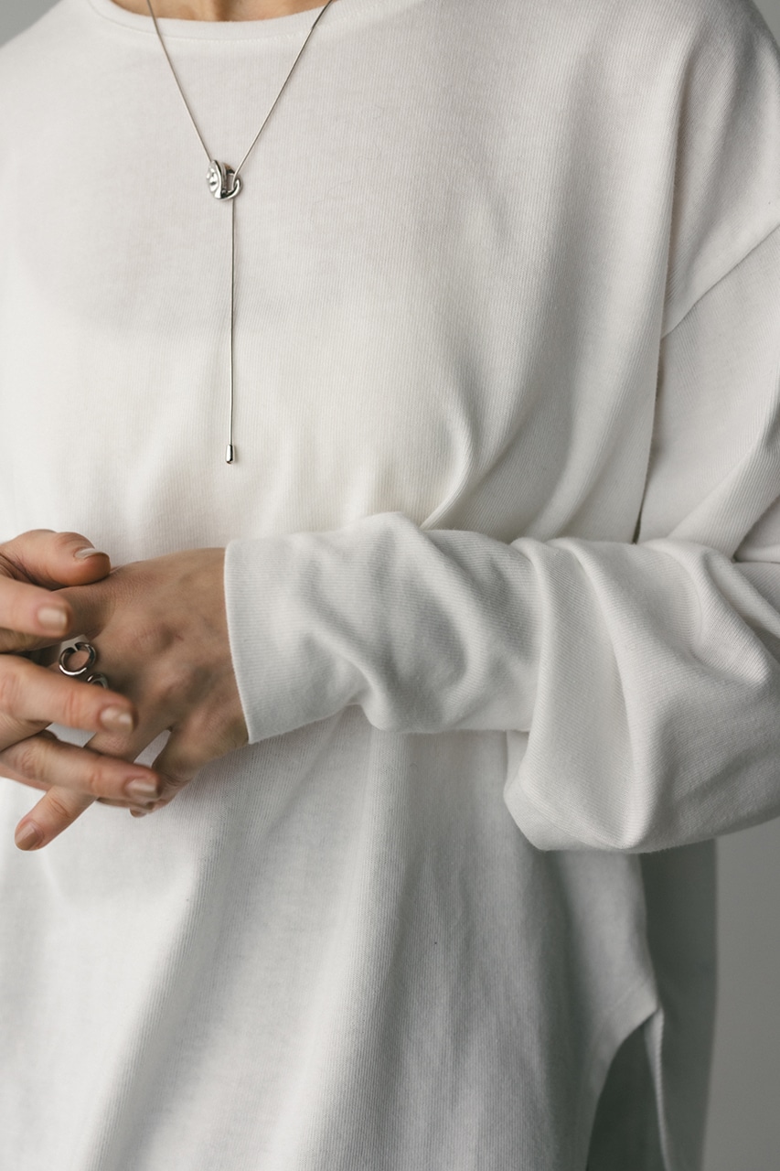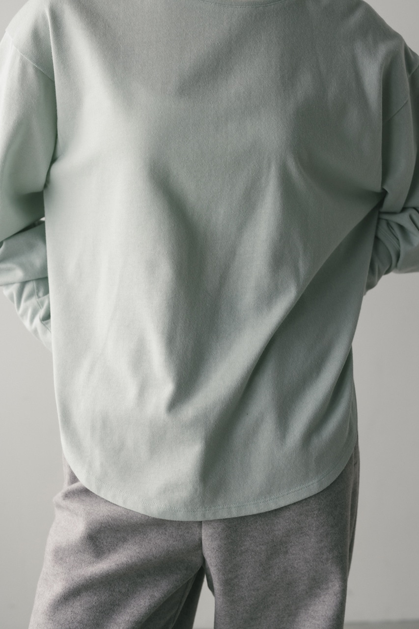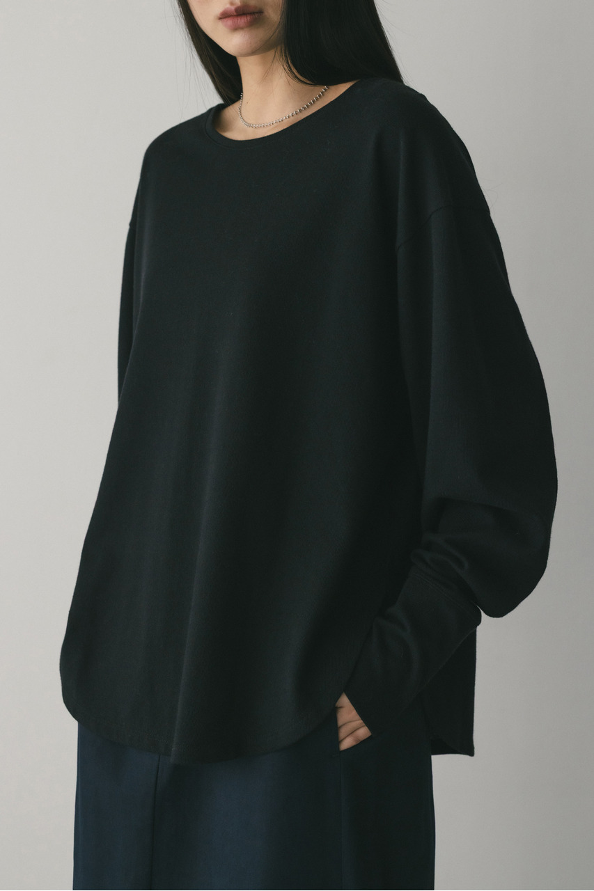 程よく厚みがあり一枚でもインナーとしても使用しやすいコットン天竺Tシャツ。アームホールラインをあえてシャープなスクエア状にし、袖に丸みフォルムを加えたモードなシルエットがスタミキらしいデザインカットトップ。ラウンドヘムなので裾をインでもアウトでもさまになる一枚です。ストレッチあり、透け感ややあり。