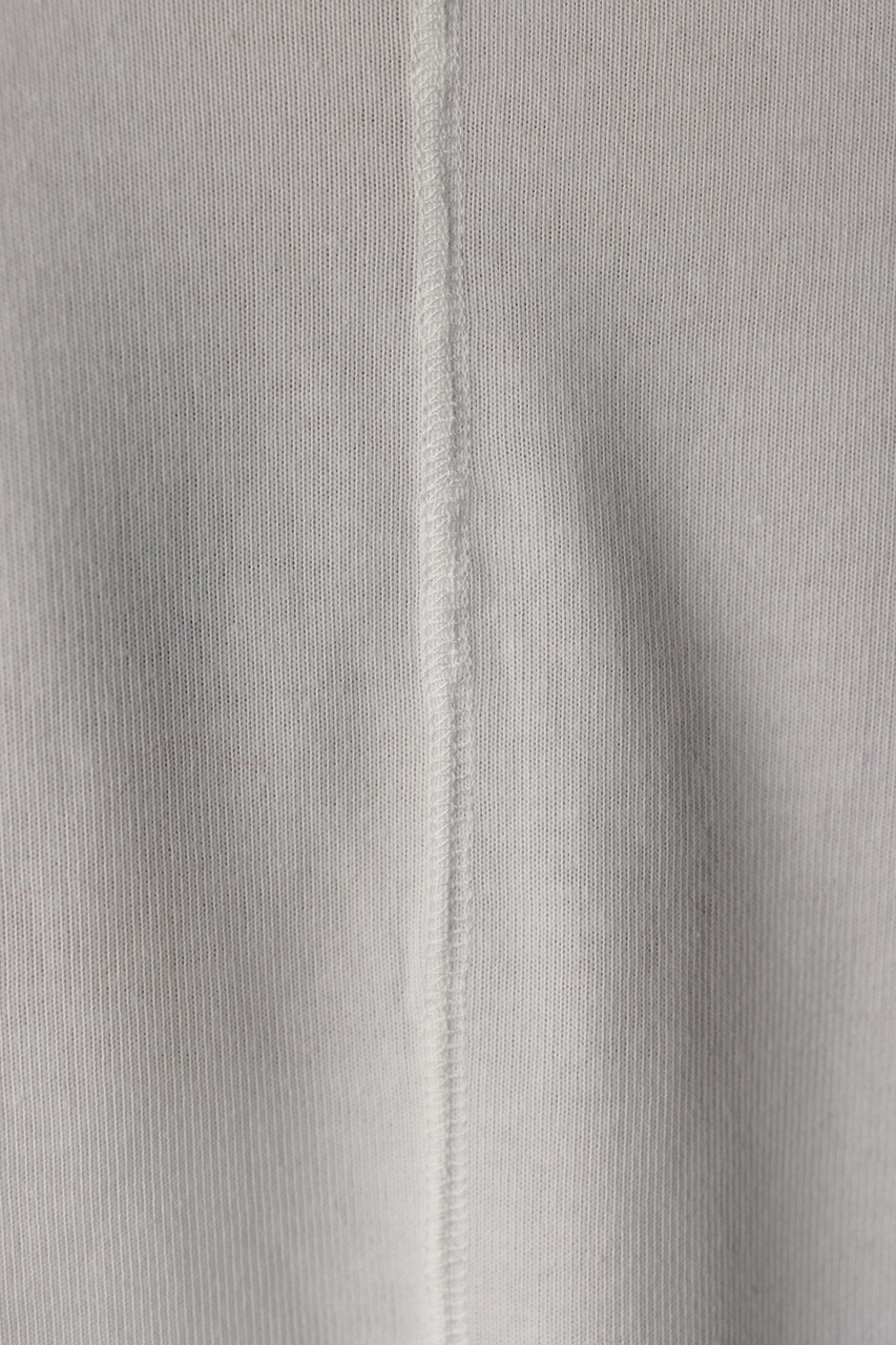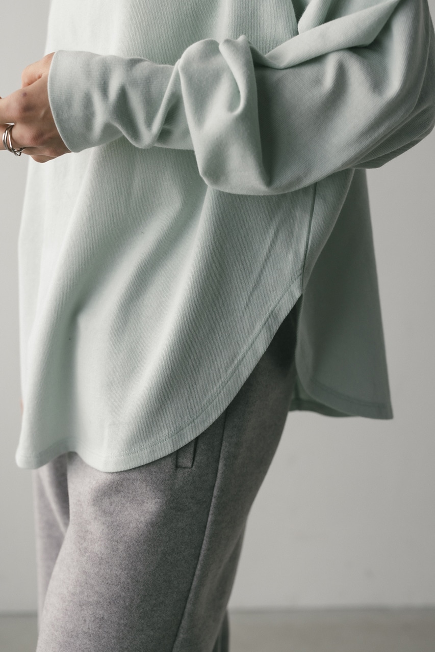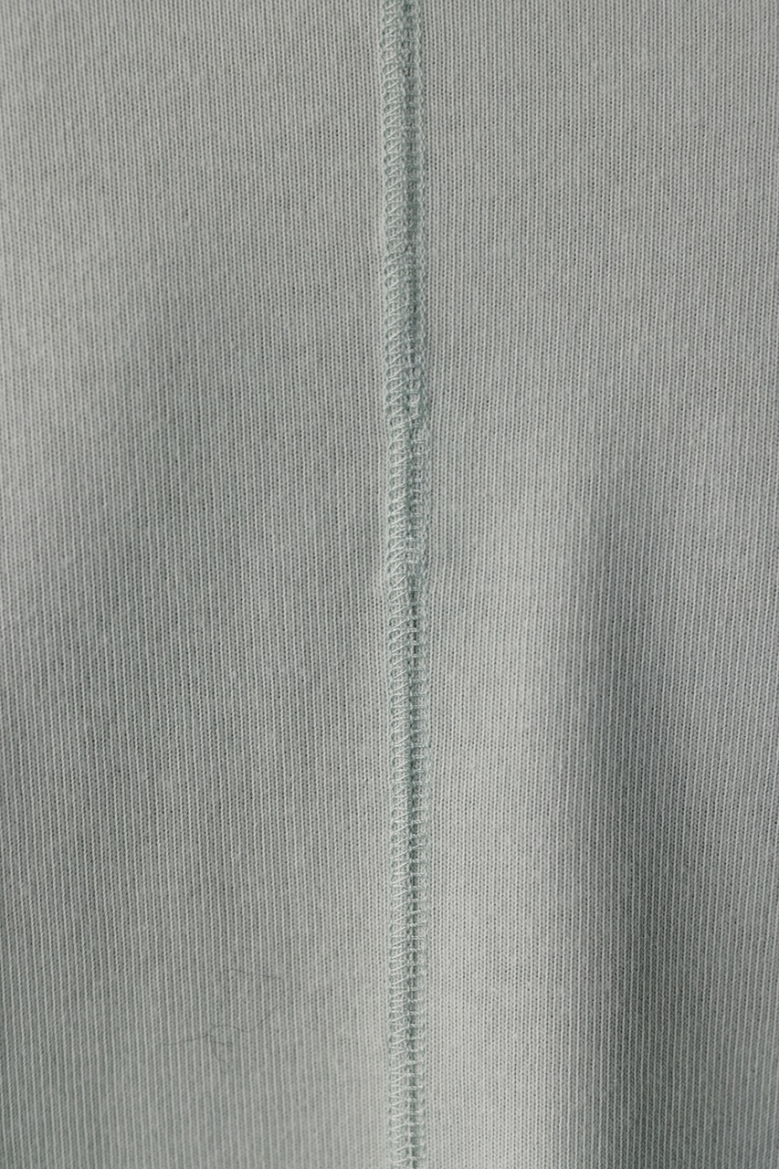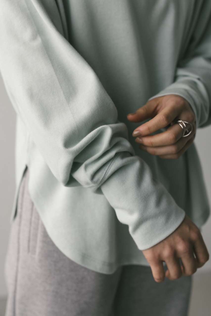 程よく厚みがあり一枚でもインナーとしても使用しやすいコットン天竺Tシャツ。アームホールラインをあえてシャープなスクエア状にし、袖に丸みフォルムを加えたモードなシルエットがスタミキらしいデザインカットトップ。ラウンドヘムなので裾をインでもアウトでもさまになる一枚です。ストレッチあり、透け感ややあり。
