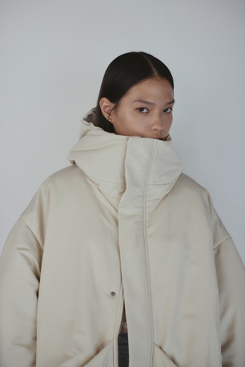 小顔と女性らしさを叶えるノンステッチパッファーコート。防寒性とデザイン性を兼ね揃えた小ぶりのフードがポイント。モードにもカジュアルにも着用頂けるマットな素材感が魅力です。ゆったりとしたオーバーなサイズ感とハーフ丈設定でボトムスを選ばず着用頂ける一枚です。透け感なし、ストレッチなし。