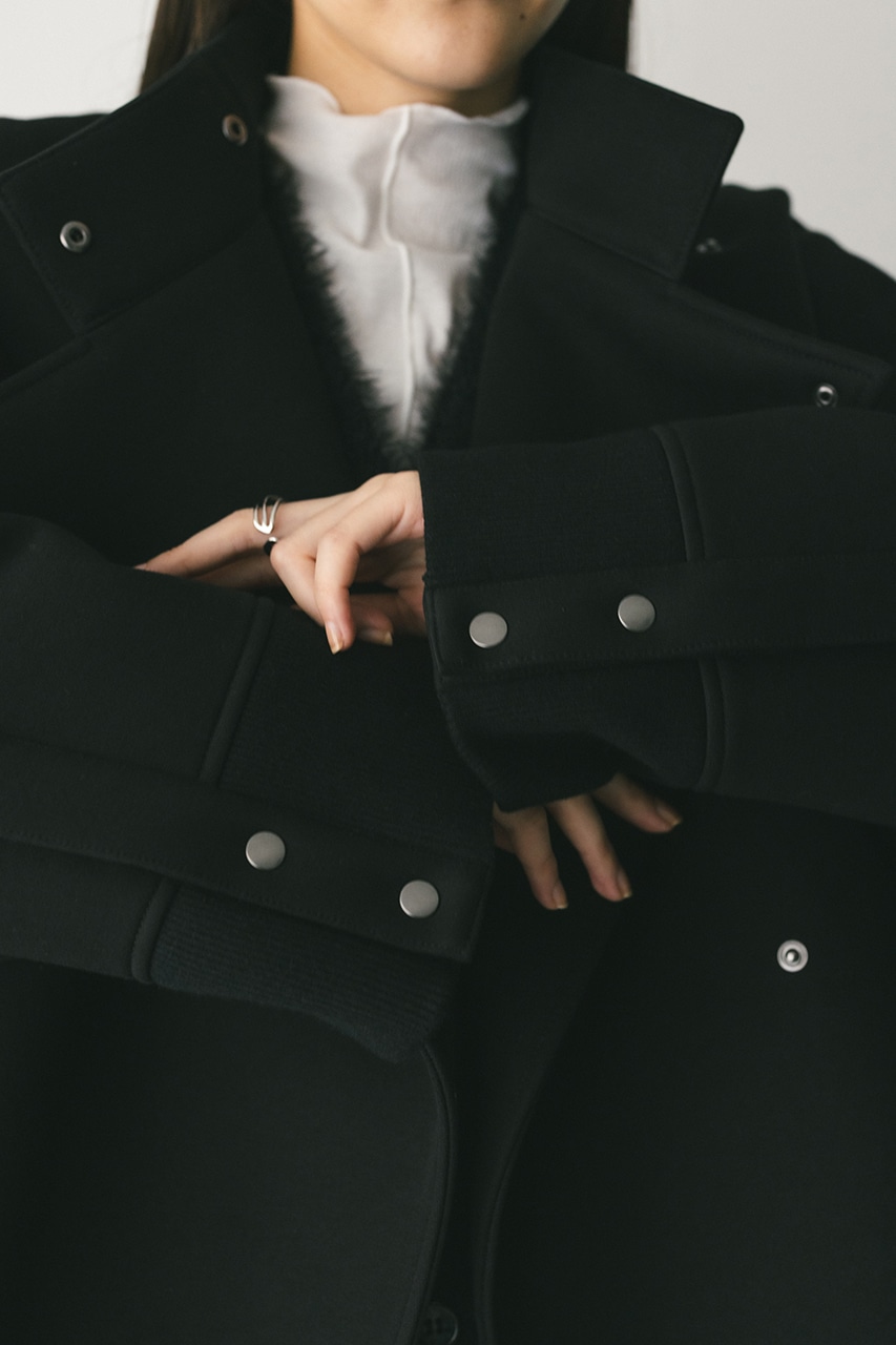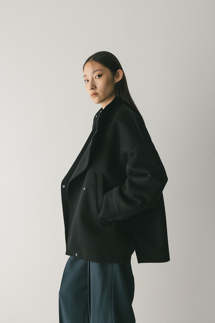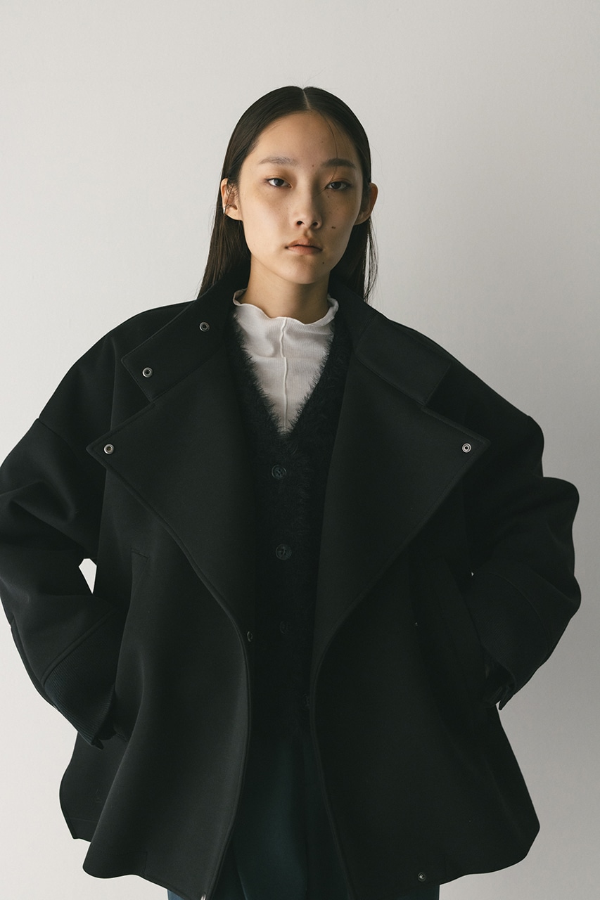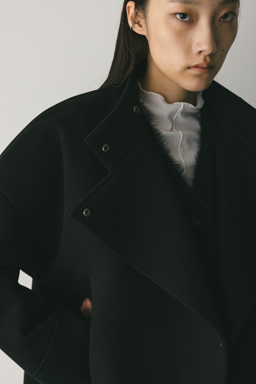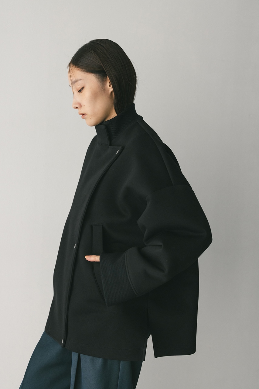 カット素材と布帛素材をボンディングしたハリのあるボリューム感がモードで上品見えするミドル丈のジャケットコート。トレンドのボンディング素材を使用することで、独特のハリ感を保ち、ボディラインを拾いにくいシルエットに仕上げた一枚。程よく厚みのある立体的なフォルムながらも、保温性もあり中にしっかり着込めるオーバーサイズがポイントです。開けて着ていただくと大きめな襟元が顔周りを華やかに見せてくれます。袖のボリューム感と、襟元と袖口のリブ素材で大人カジュアルなこなれた印象に導きます。サイドポケット付き。ストレッチなし、透け感なし。