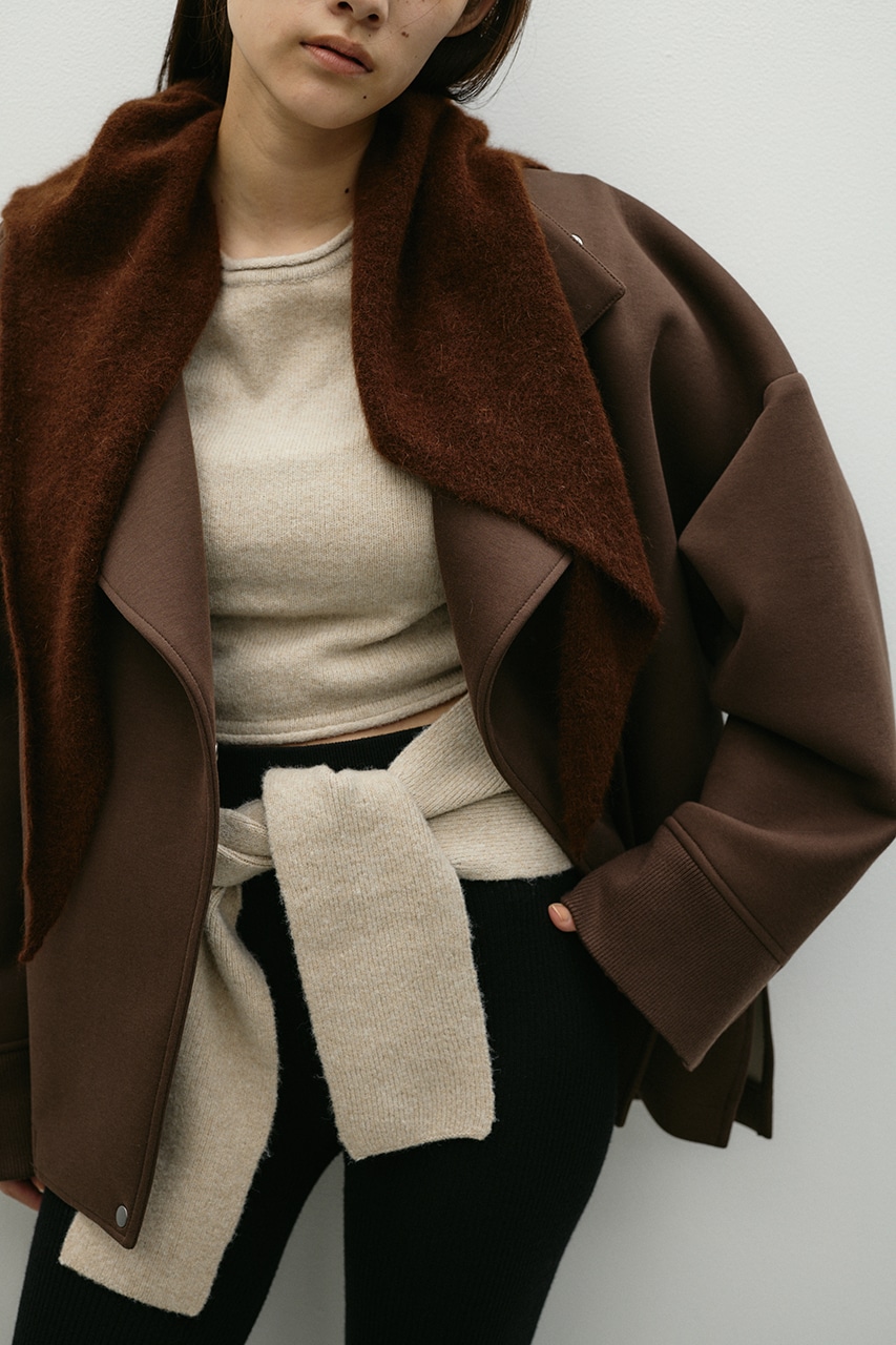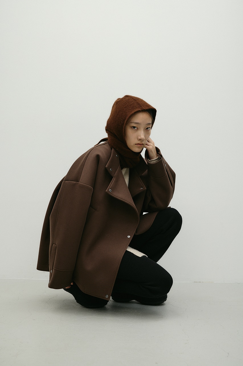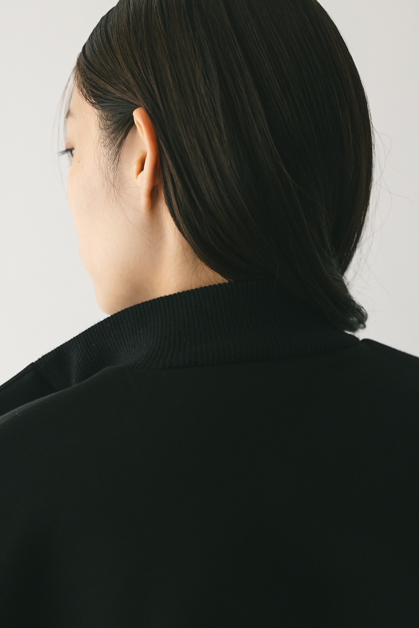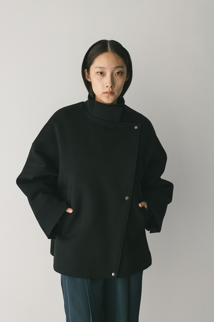 カット素材と布帛素材をボンディングしたハリのあるボリューム感がモードで上品見えするミドル丈のジャケットコート。トレンドのボンディング素材を使用することで、独特のハリ感を保ち、ボディラインを拾いにくいシルエットに仕上げた一枚。程よく厚みのある立体的なフォルムながらも、保温性もあり中にしっかり着込めるオーバーサイズがポイントです。開けて着ていただくと大きめな襟元が顔周りを華やかに見せてくれます。袖のボリューム感と、襟元と袖口のリブ素材で大人カジュアルなこなれた印象に導きます。サイドポケット付き。ストレッチなし、透け感なし。