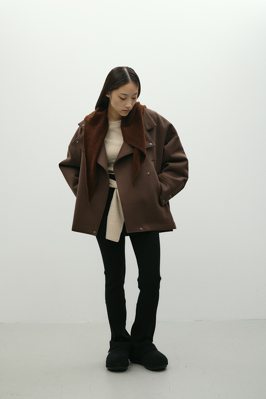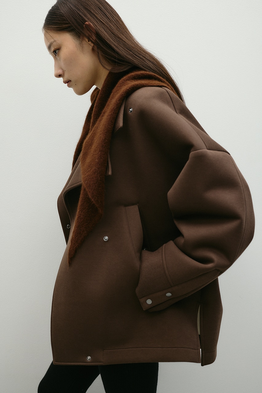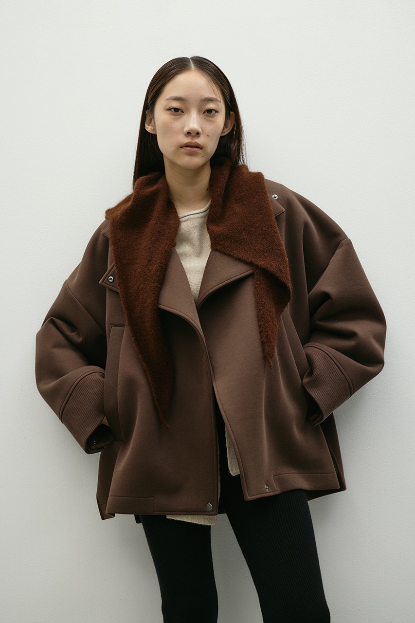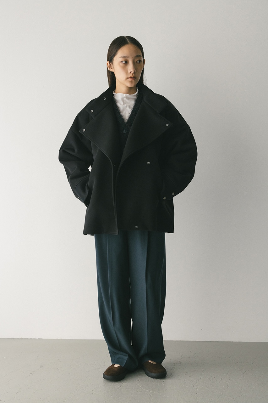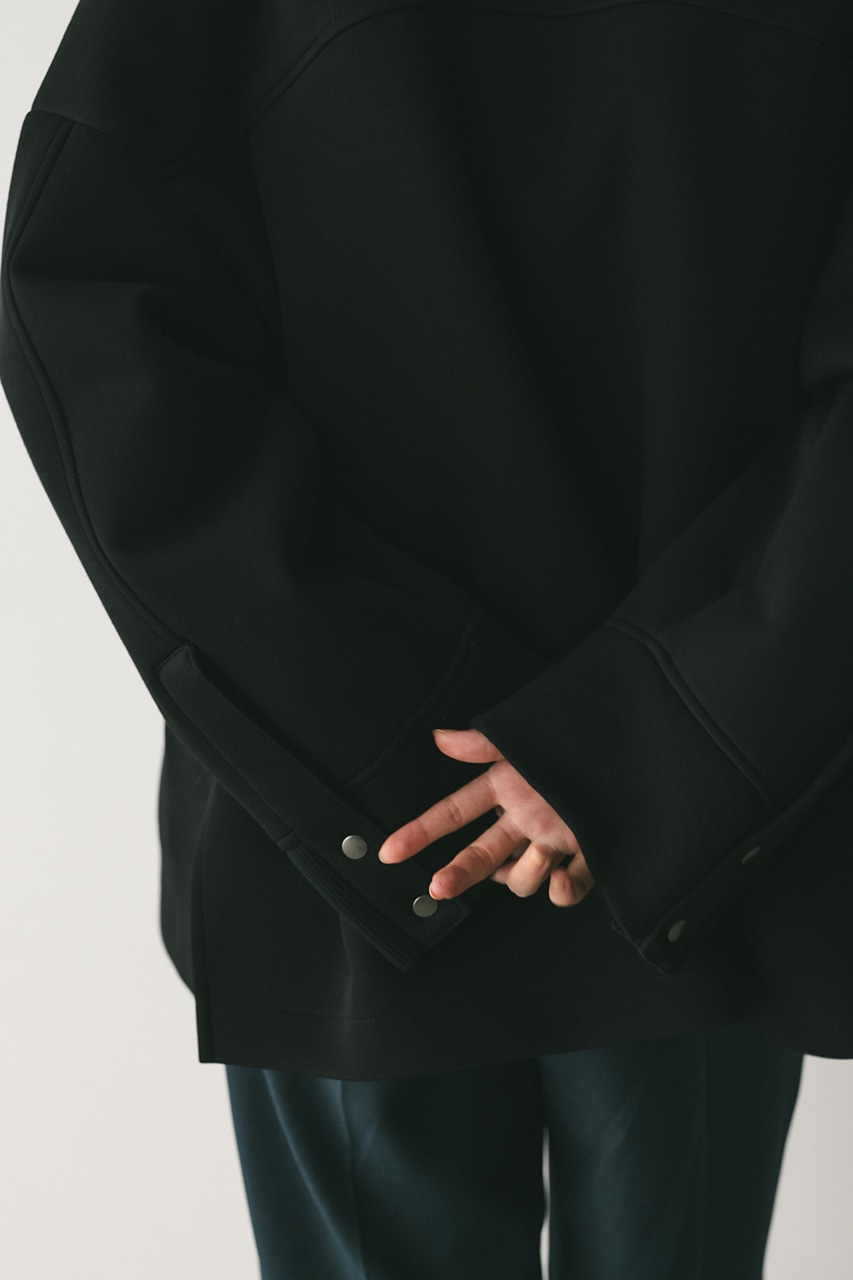 カット素材と布帛素材をボンディングしたハリのあるボリューム感がモードで上品見えするミドル丈のジャケットコート。トレンドのボンディング素材を使用することで、独特のハリ感を保ち、ボディラインを拾いにくいシルエットに仕上げた一枚。程よく厚みのある立体的なフォルムながらも、保温性もあり中にしっかり着込めるオーバーサイズがポイントです。開けて着ていただくと大きめな襟元が顔周りを華やかに見せてくれます。袖のボリューム感と、襟元と袖口のリブ素材で大人カジュアルなこなれた印象に導きます。サイドポケット付き。ストレッチなし、透け感なし。