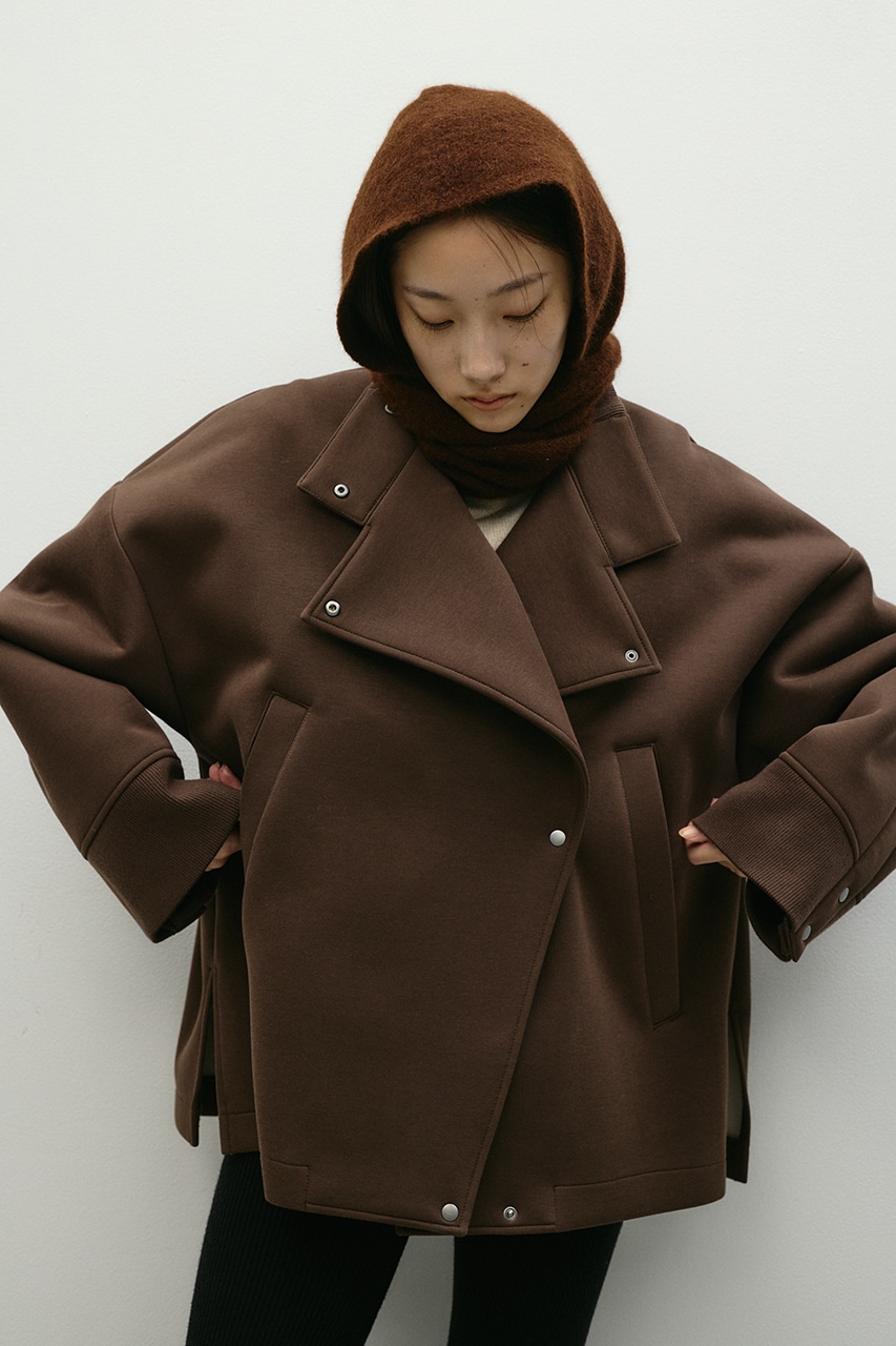 カット素材と布帛素材をボンディングしたハリのあるボリューム感がモードで上品見えするミドル丈のジャケットコート。トレンドのボンディング素材を使用することで、独特のハリ感を保ち、ボディラインを拾いにくいシルエットに仕上げた一枚。程よく厚みのある立体的なフォルムながらも、保温性もあり中にしっかり着込めるオーバーサイズがポイントです。開けて着ていただくと大きめな襟元が顔周りを華やかに見せてくれます。袖のボリューム感と、襟元と袖口のリブ素材で大人カジュアルなこなれた印象に導きます。サイドポケット付き。ストレッチなし、透け感なし。