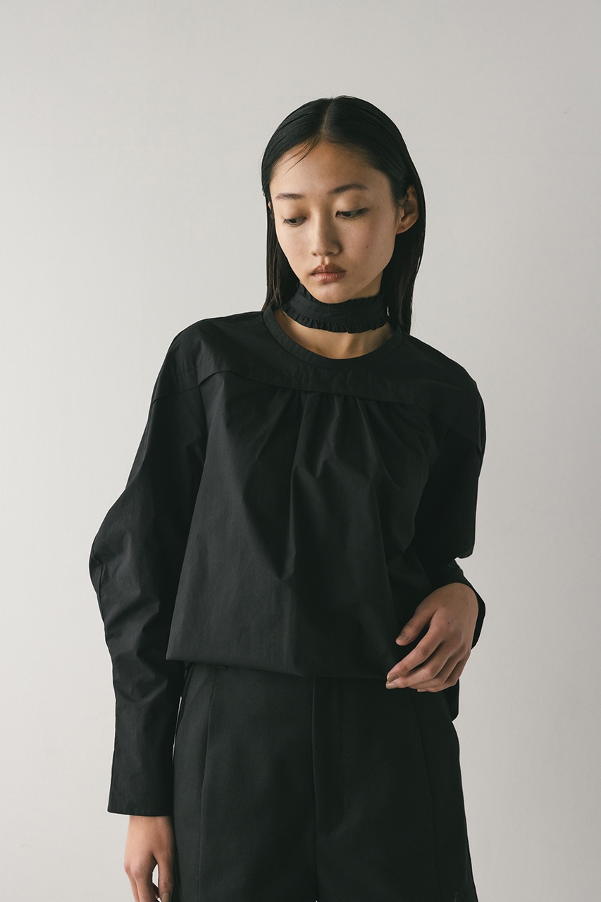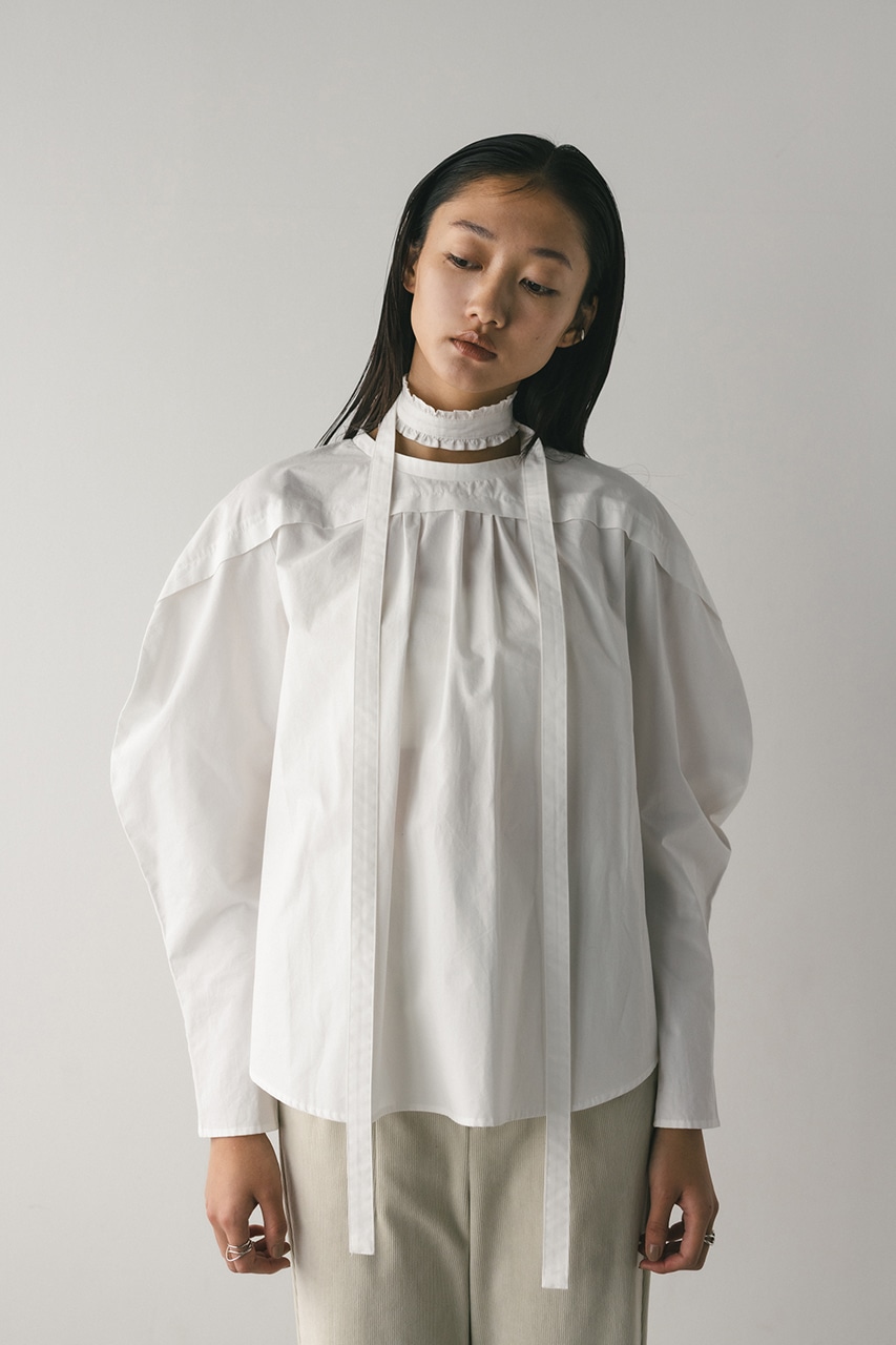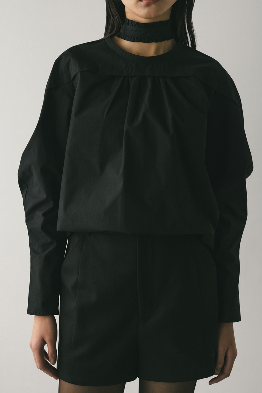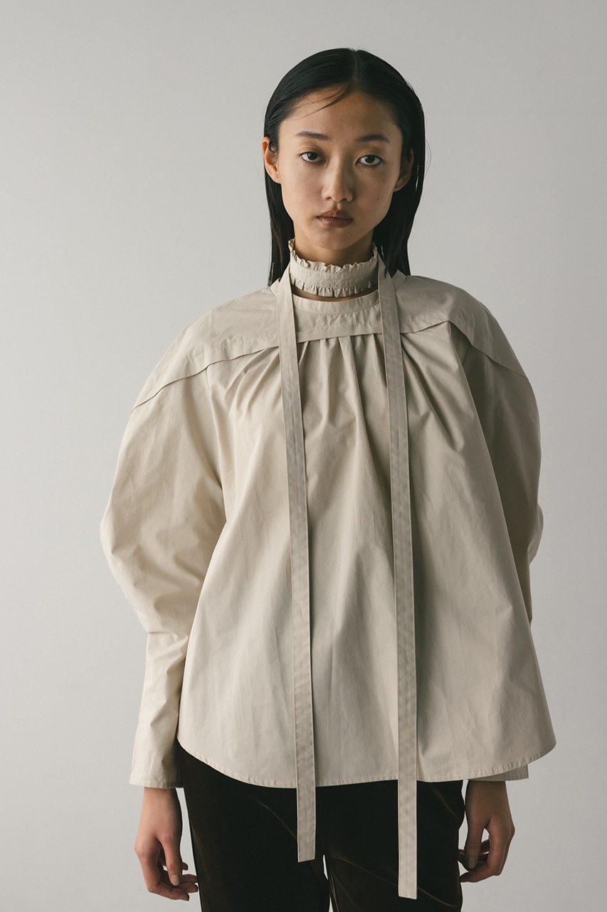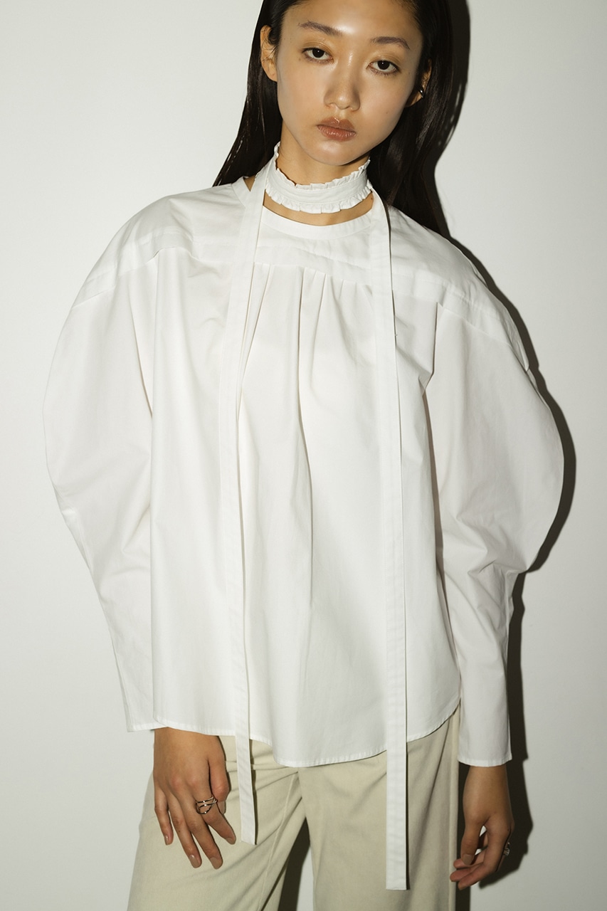 立体的なスリーブが印象的なフリルチョーカー付きブラウス。程よいハリ感でシルエットがきれいに出る一枚。袖デザインがポイントでインナー使いにもおすすめです。部分的にフリルをあしらったチョーカーは、フロントで結んでボウタイにしたり、バックで結んで後ろにタイを垂らしてみたり様々な結び方を楽しめます。ストレッチなし、透け感なし。