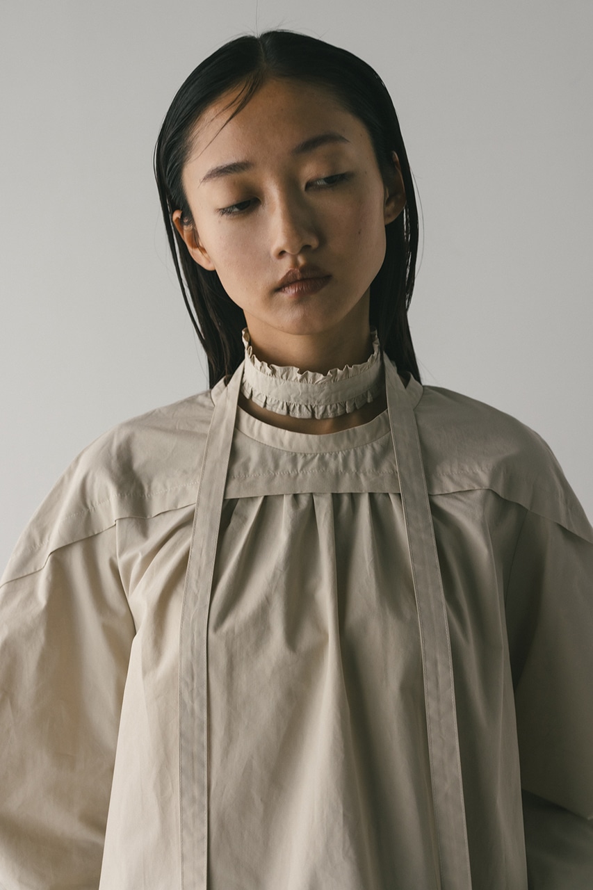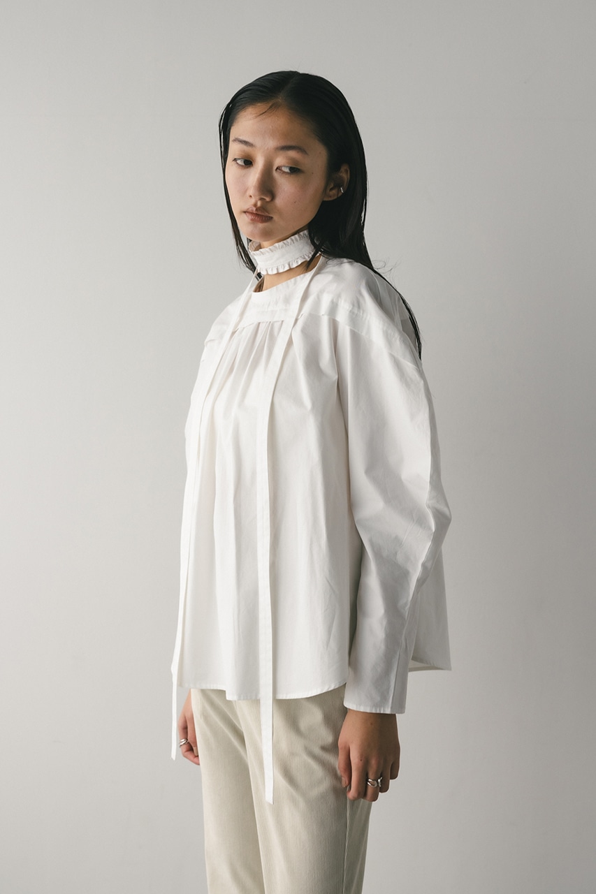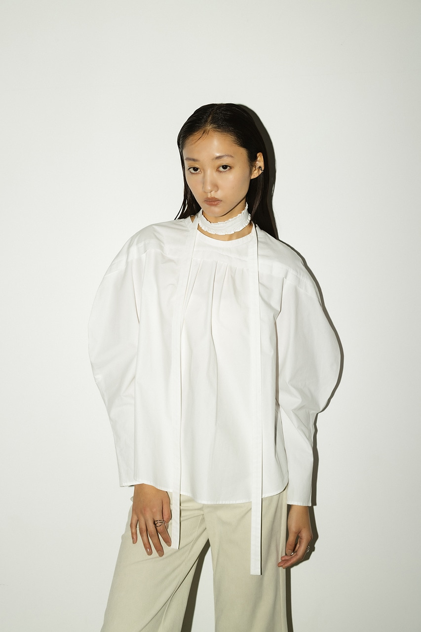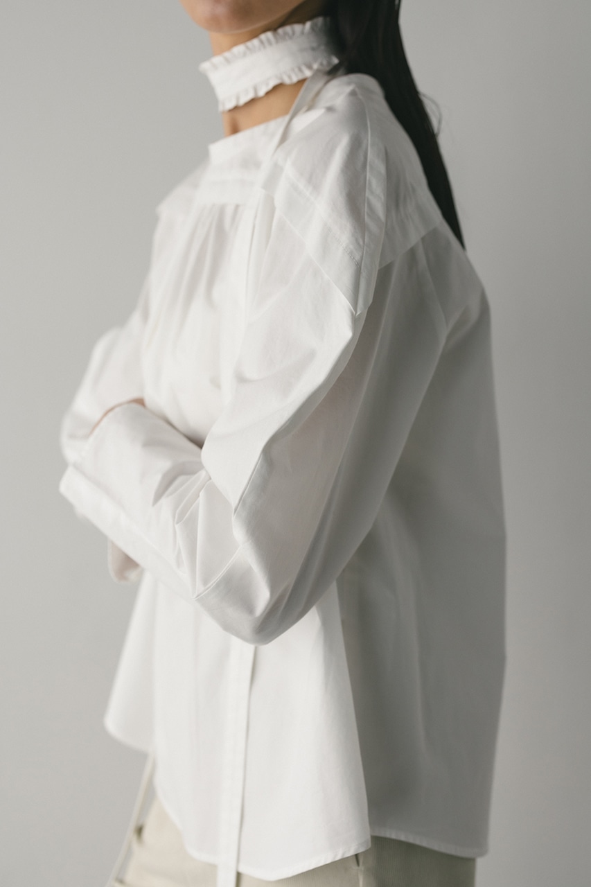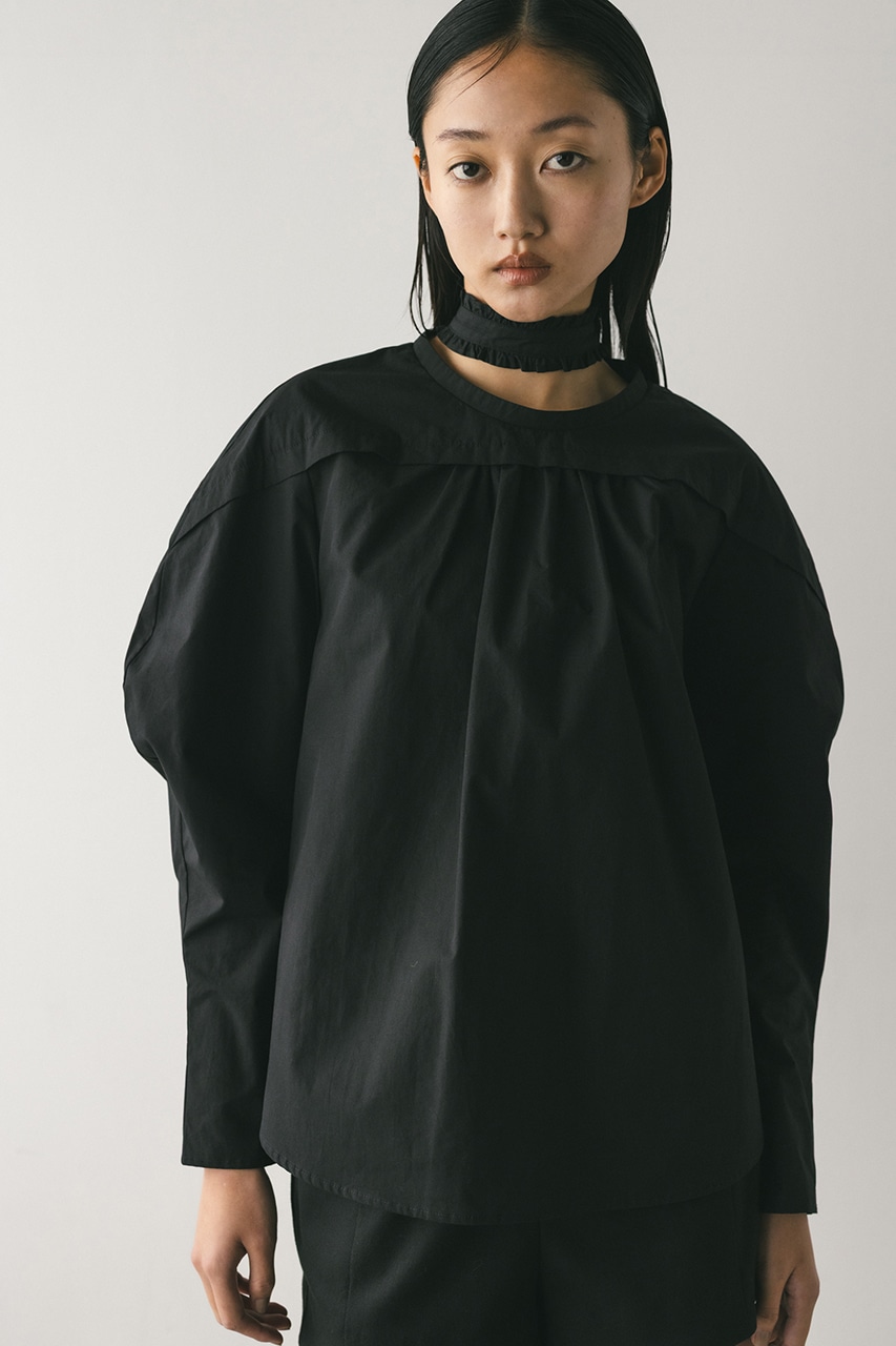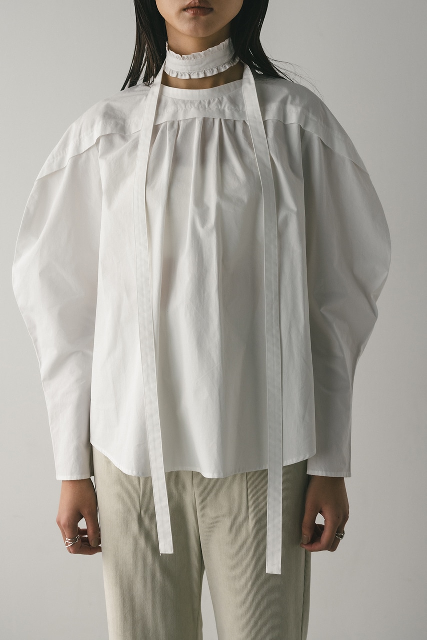 立体的なスリーブが印象的なフリルチョーカー付きブラウス。程よいハリ感でシルエットがきれいに出る一枚。袖デザインがポイントでインナー使いにもおすすめです。部分的にフリルをあしらったチョーカーは、フロントで結んでボウタイにしたり、バックで結んで後ろにタイを垂らしてみたり様々な結び方を楽しめます。ストレッチなし、透け感なし。