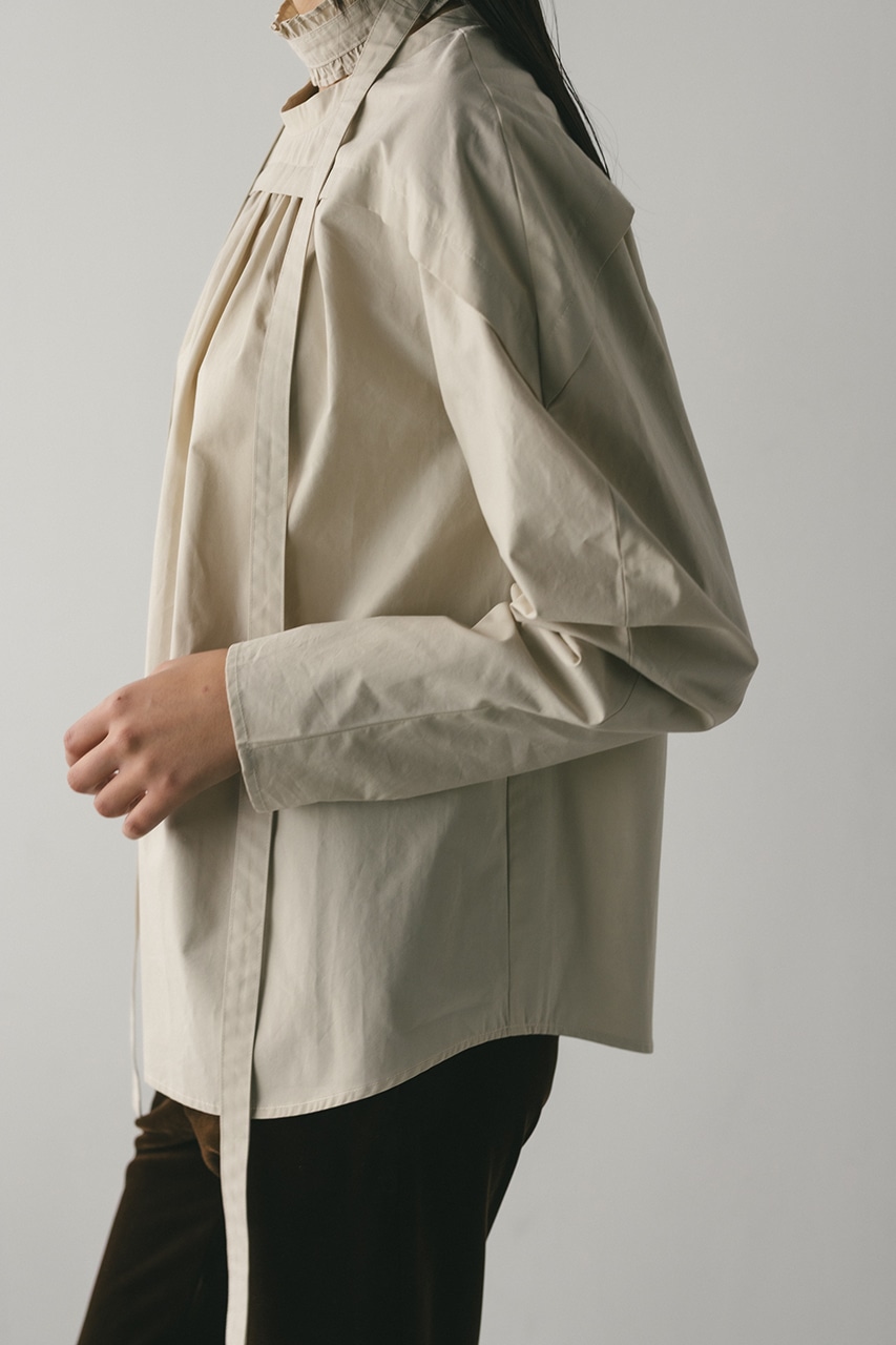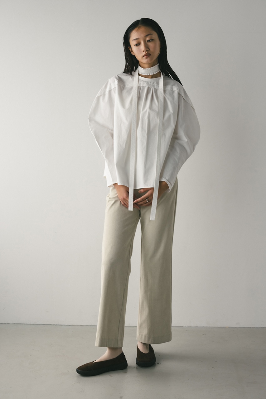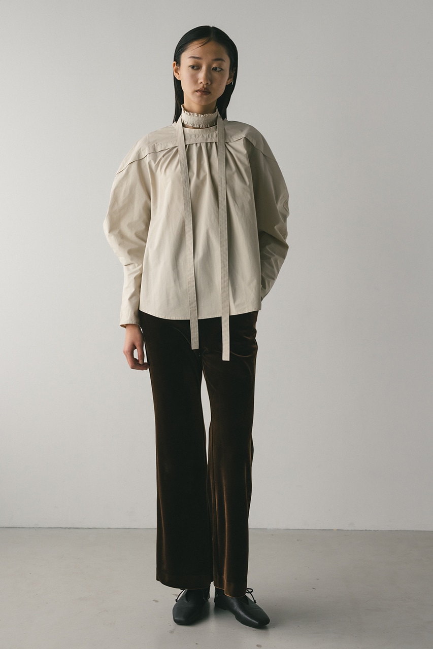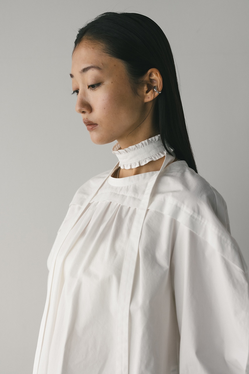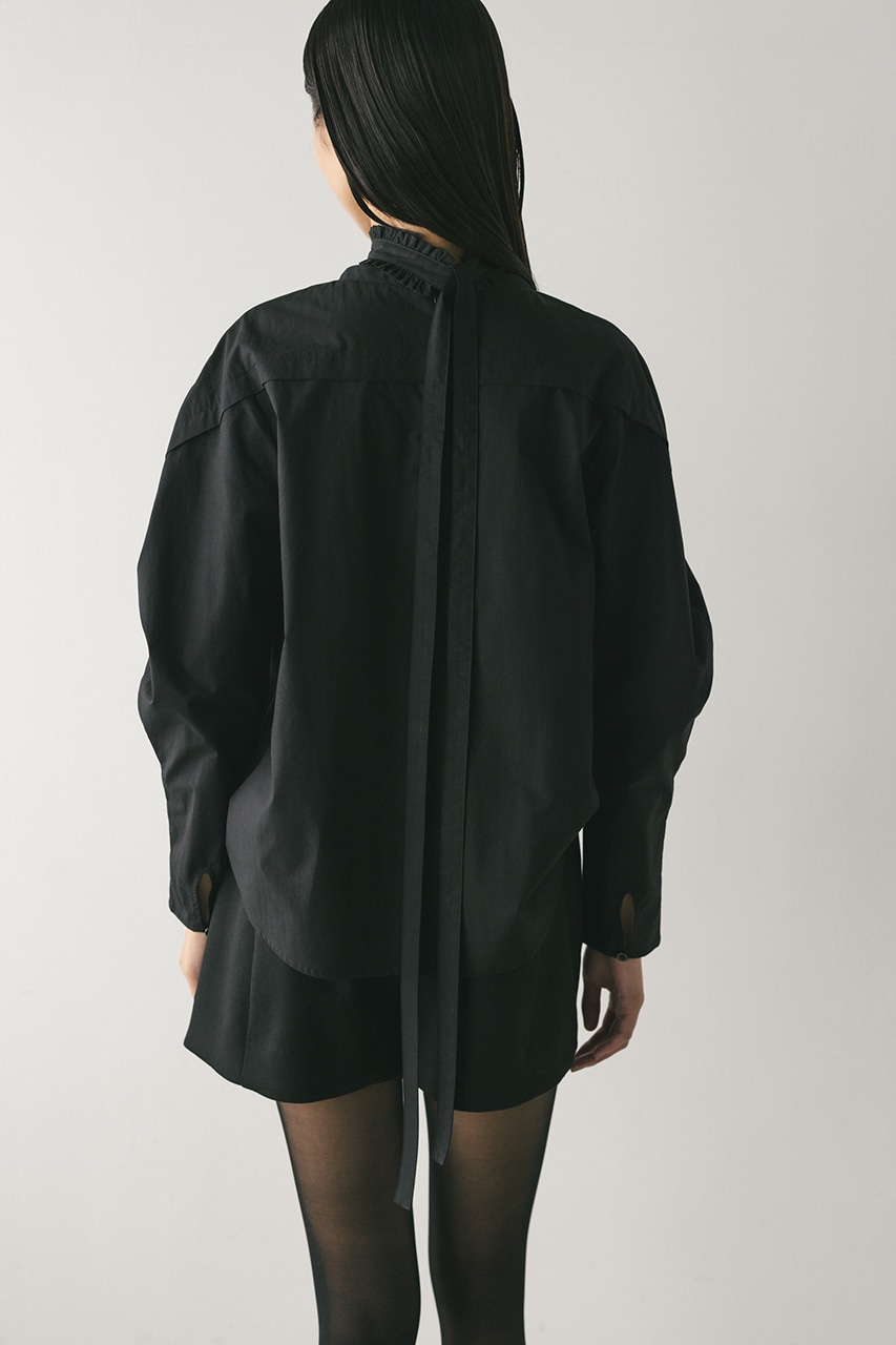 立体的なスリーブが印象的なフリルチョーカー付きブラウス。程よいハリ感でシルエットがきれいに出る一枚。袖デザインがポイントでインナー使いにもおすすめです。部分的にフリルをあしらったチョーカーは、フロントで結んでボウタイにしたり、バックで結んで後ろにタイを垂らしてみたり様々な結び方を楽しめます。ストレッチなし、透け感なし。