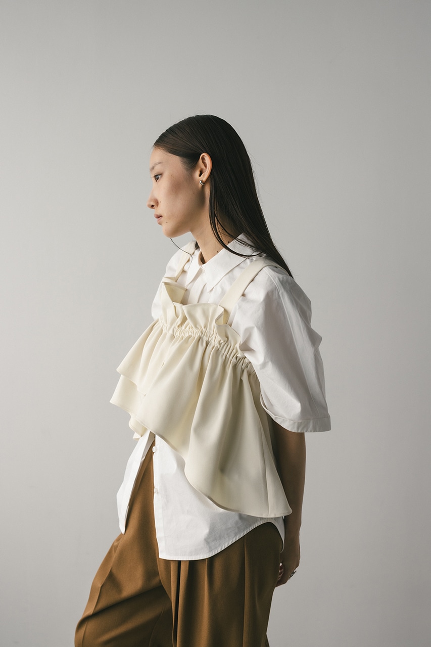 アシンメトリーなデザインがポイントのフリルビスチェ。バスト部分はゴム使用で着脱もしやすい一枚。コーディネートの幅が広がるプラスワンアイテムです。ストレッチなし、透け感なし。