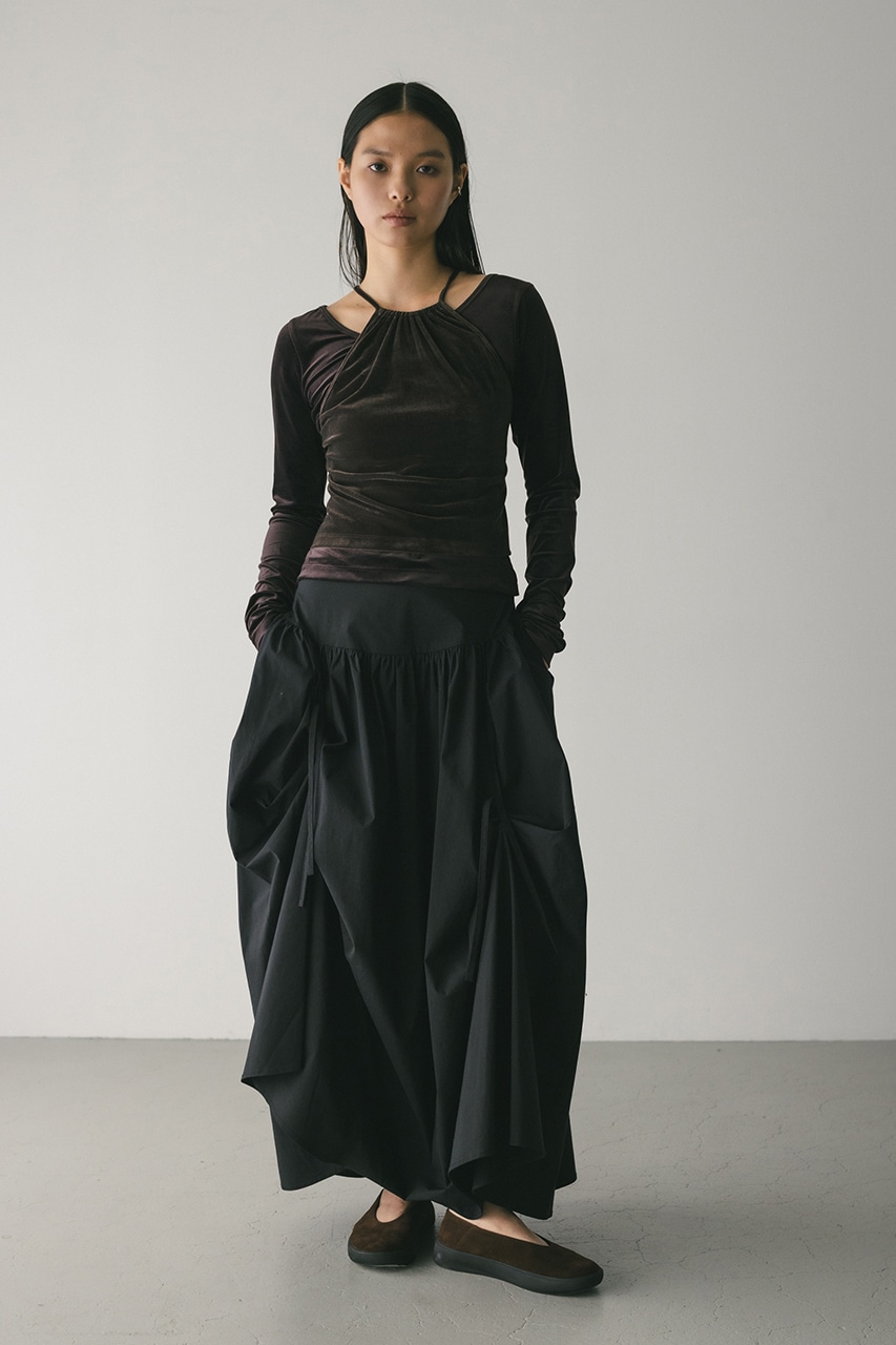 トレンド感のあるボリュームとポイントになるリボン結びで作られるタックがユニークなデザインに導くロングスカート。ウエストゴム仕様で楽に着用頂けます。シンプルなコーデにプラスするだけでスタイリングが映える一枚です。透け感なし、ストレッチなし。