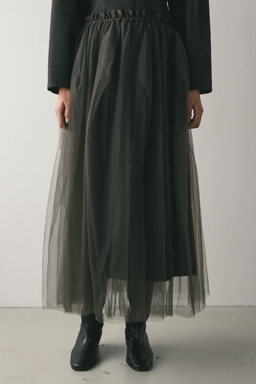 たっぷりなボリュームに目を奪われるチュールスカート。ウエスト部分から立体的にボリュームが出るようにタックを入れることでスタイルアップに導きます。いつものコーデにプラスすることで華やかなモードな印象になるアイテムです。ボトムやワンピースとレイヤードして着ていただくレイヤード用のスカートです。裏地なし。ウエストゴム仕様。500IAB33-3451(ショルダータックフォルムワンピース)とセットアップ着用可能。ストレッチあり、透け感あり。