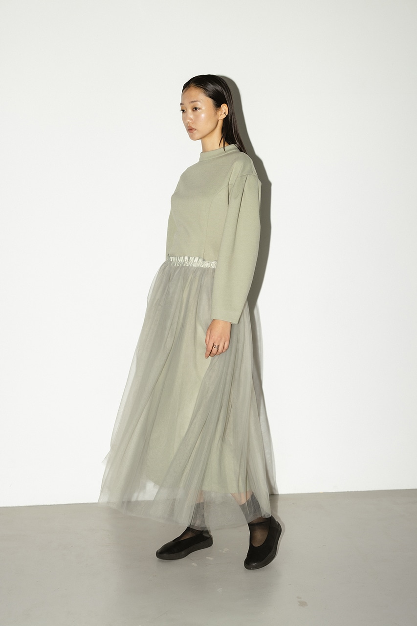 袖の丸みのある立体感とウエストタックが身体のラインをすっきりと見せてくれるエレガントな印象のワンピース。身体のラインを拾わない程よく厚みと膨らみと温かみのあるジャージ素材を使用。デイリーシーンではもちろん、オケージョンのシーンでも着用いただけます。500IAB31-4231(チュールレイヤードスカート)とセットアップ着用可能。ストレッチあり、透け感なし。