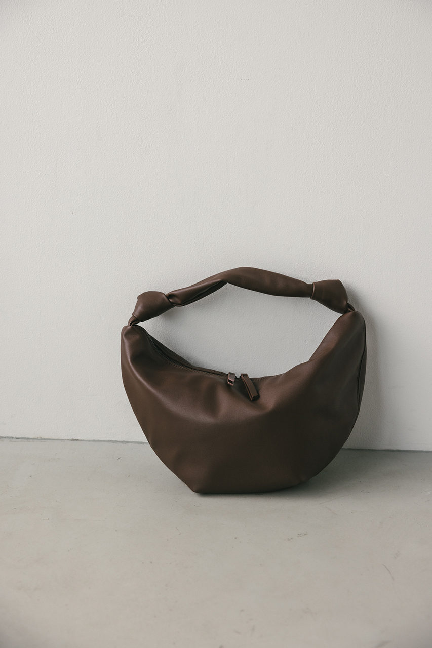三日月のようなシルエットが肩にかけると身体に沿うように馴染むショルダーバッグ。柔らかなフェイクレザーが大きめのバッグでもハード過ぎない印象です。しっかりと容量があるので、荷物が多めの方にもおすすめです。様々なシーンで使いやすいシンプルで飽きのこないデザインに仕上げました。内ポケット2つ付き。