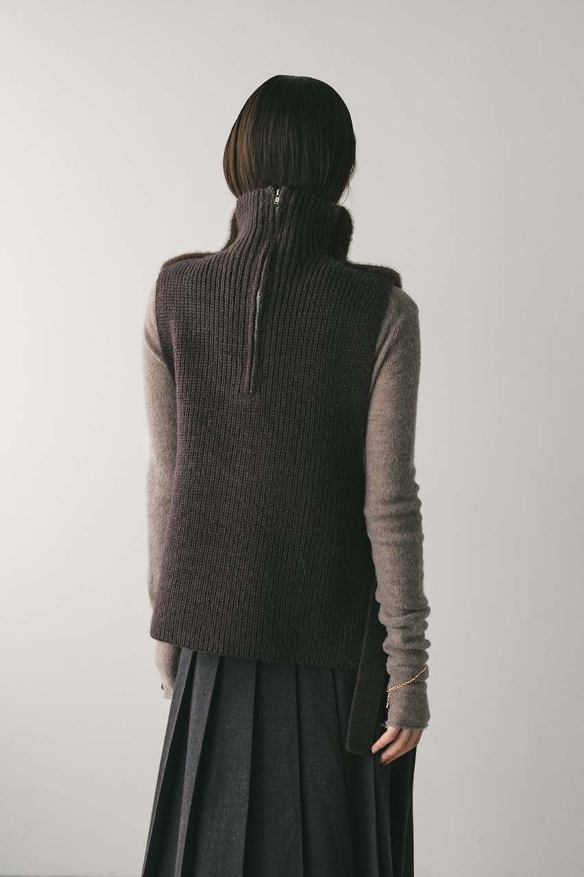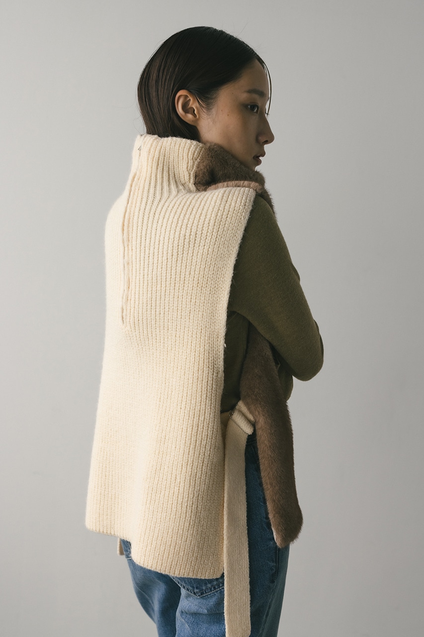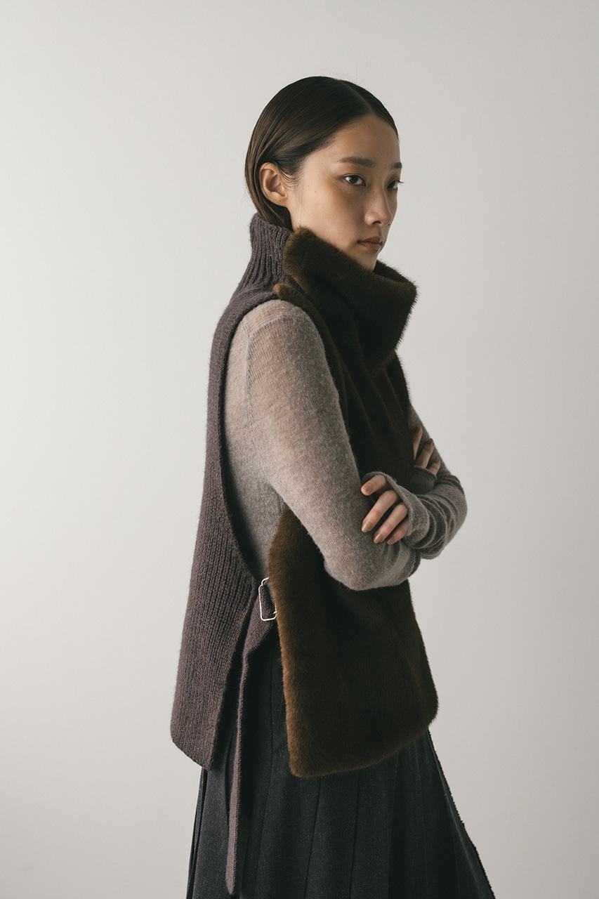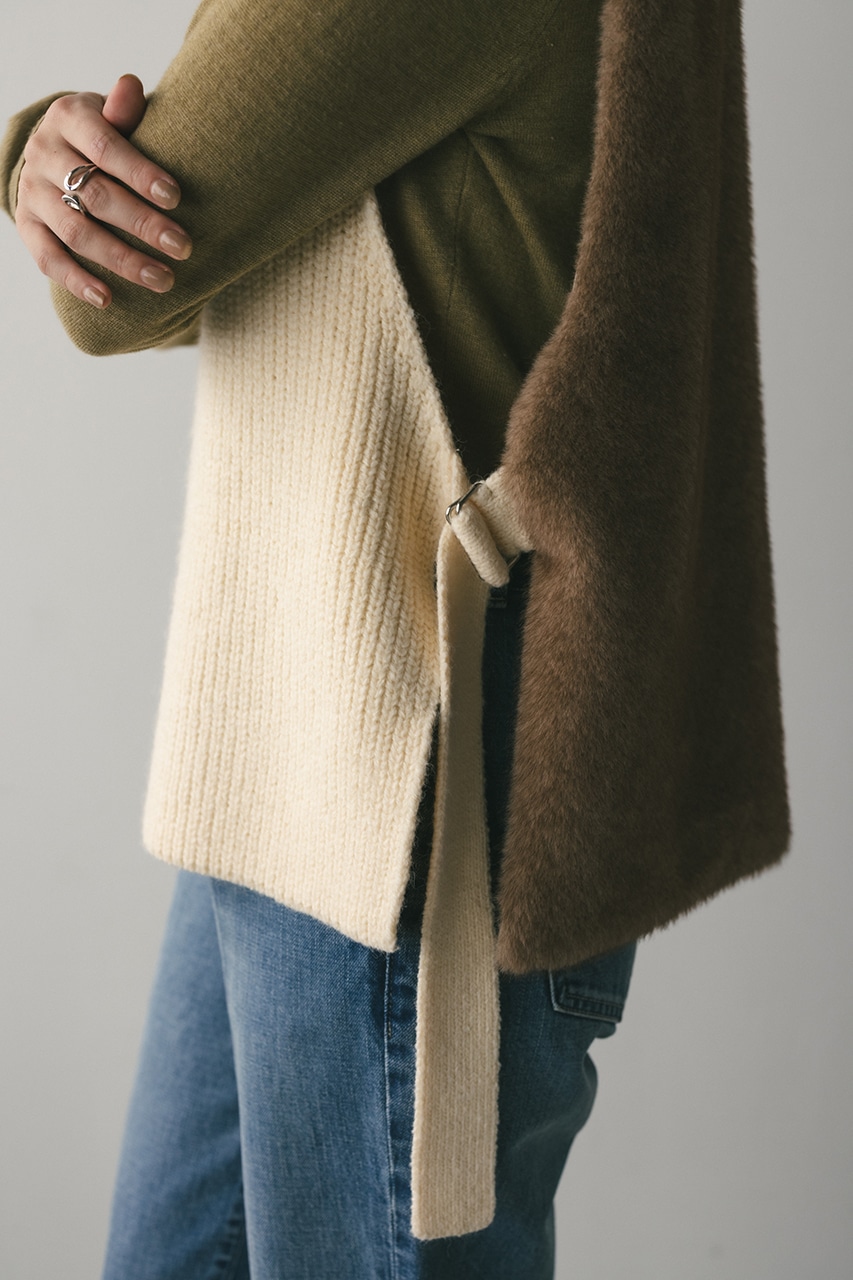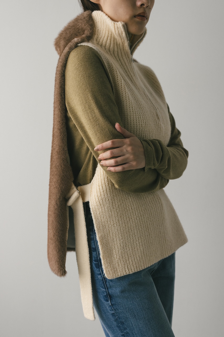 ニットとフェイクファーの前後2WAYで着用できるベスト。スタンドネックにもでき、トレンドライクな着こなしに欠かせないこなれアイテムです。フェイクファーは細い毛足のなめらかな肌触りと艶やかさが特徴。暖かさはもちろん着心地にも優れた一枚です。立体感のあるニットには着脱に優れ、コーデの幅も広がる襟元ファスナーデザインを施しました。両サイドはベルトでレイヤードを楽しんでいただけます。透け感なし、ストレッチなし。