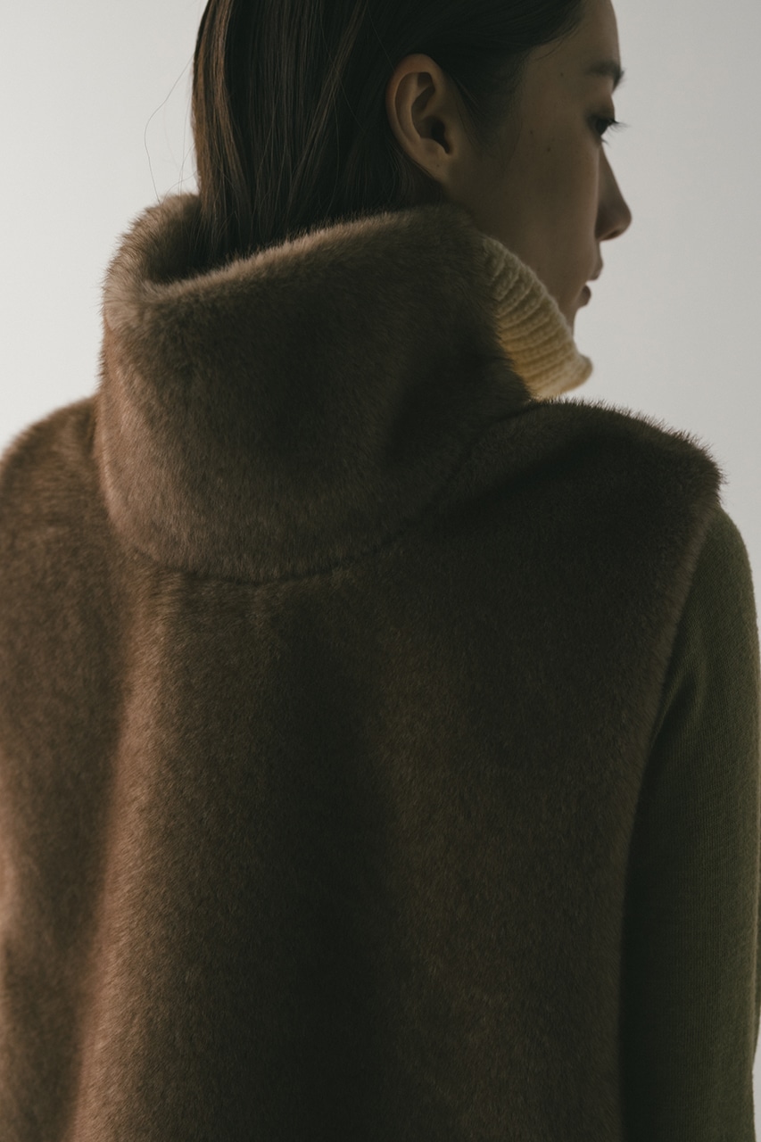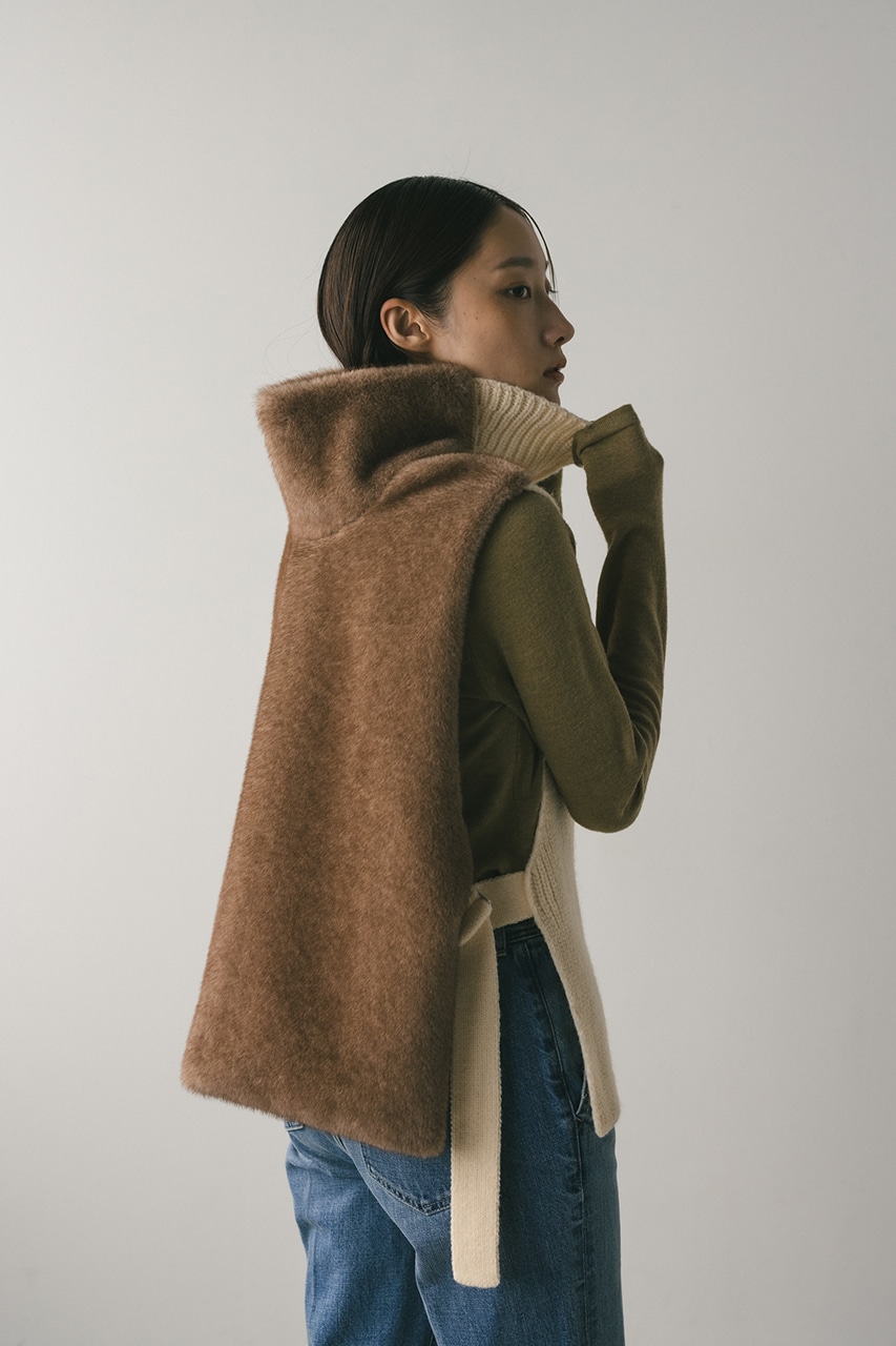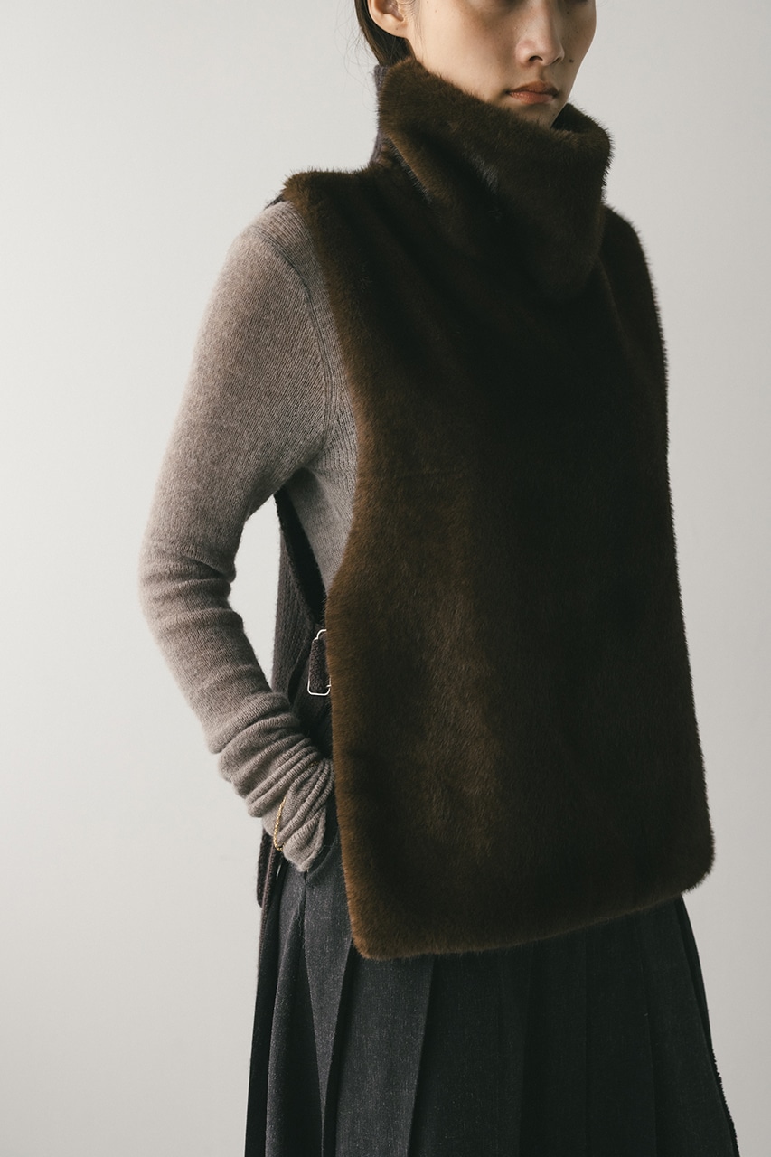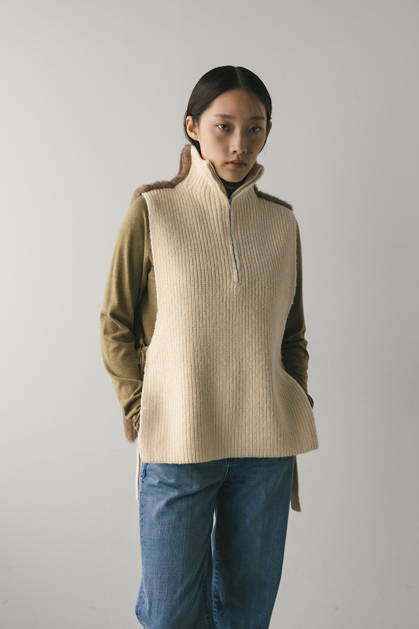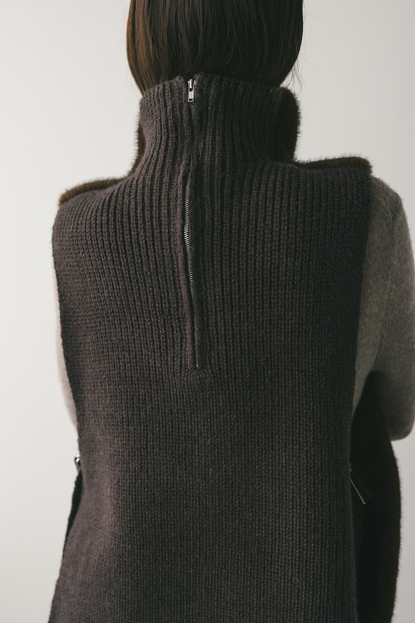 ニットとフェイクファーの前後2WAYで着用できるベスト。スタンドネックにもでき、トレンドライクな着こなしに欠かせないこなれアイテムです。フェイクファーは細い毛足のなめらかな肌触りと艶やかさが特徴。暖かさはもちろん着心地にも優れた一枚です。立体感のあるニットには着脱に優れ、コーデの幅も広がる襟元ファスナーデザインを施しました。両サイドはベルトでレイヤードを楽しんでいただけます。透け感なし、ストレッチなし。