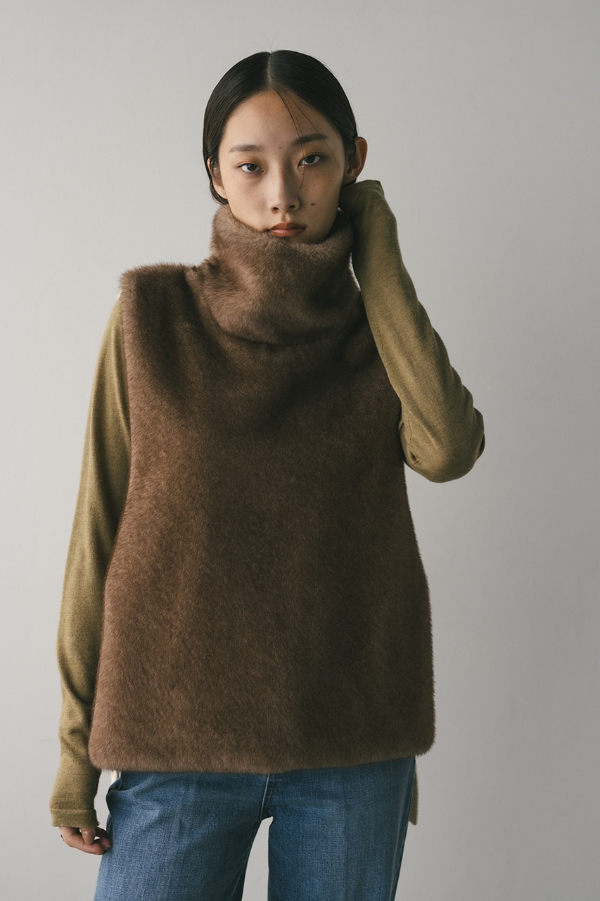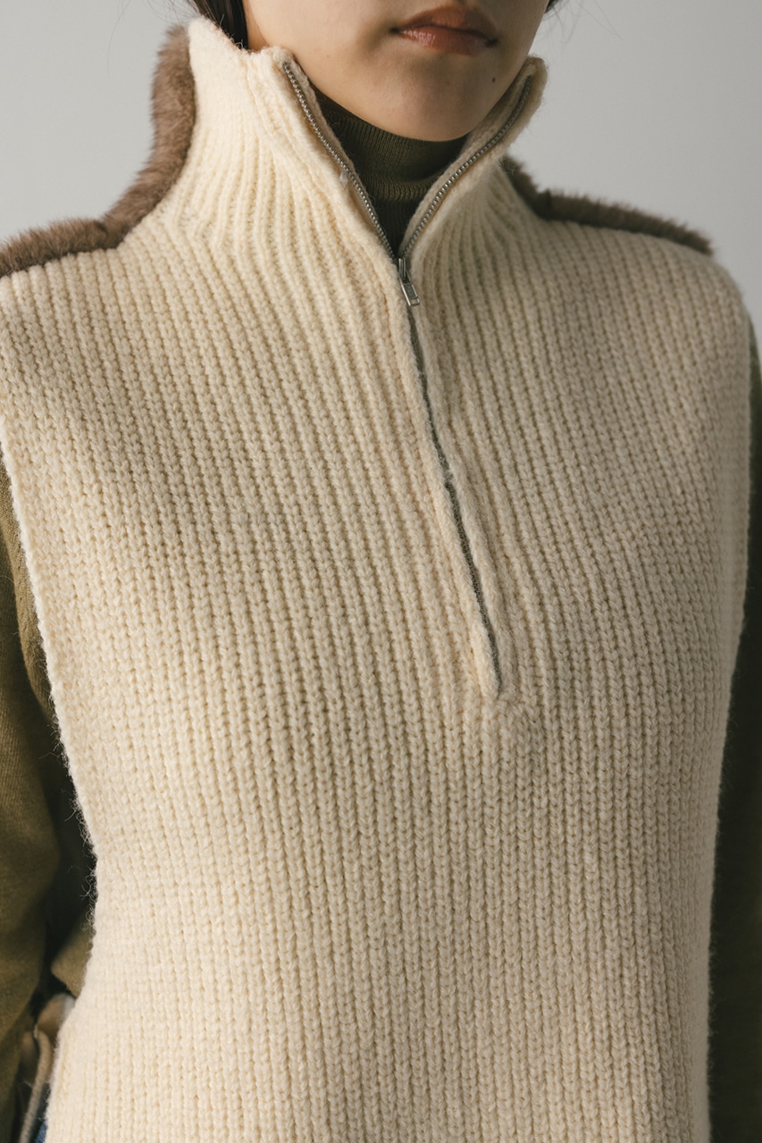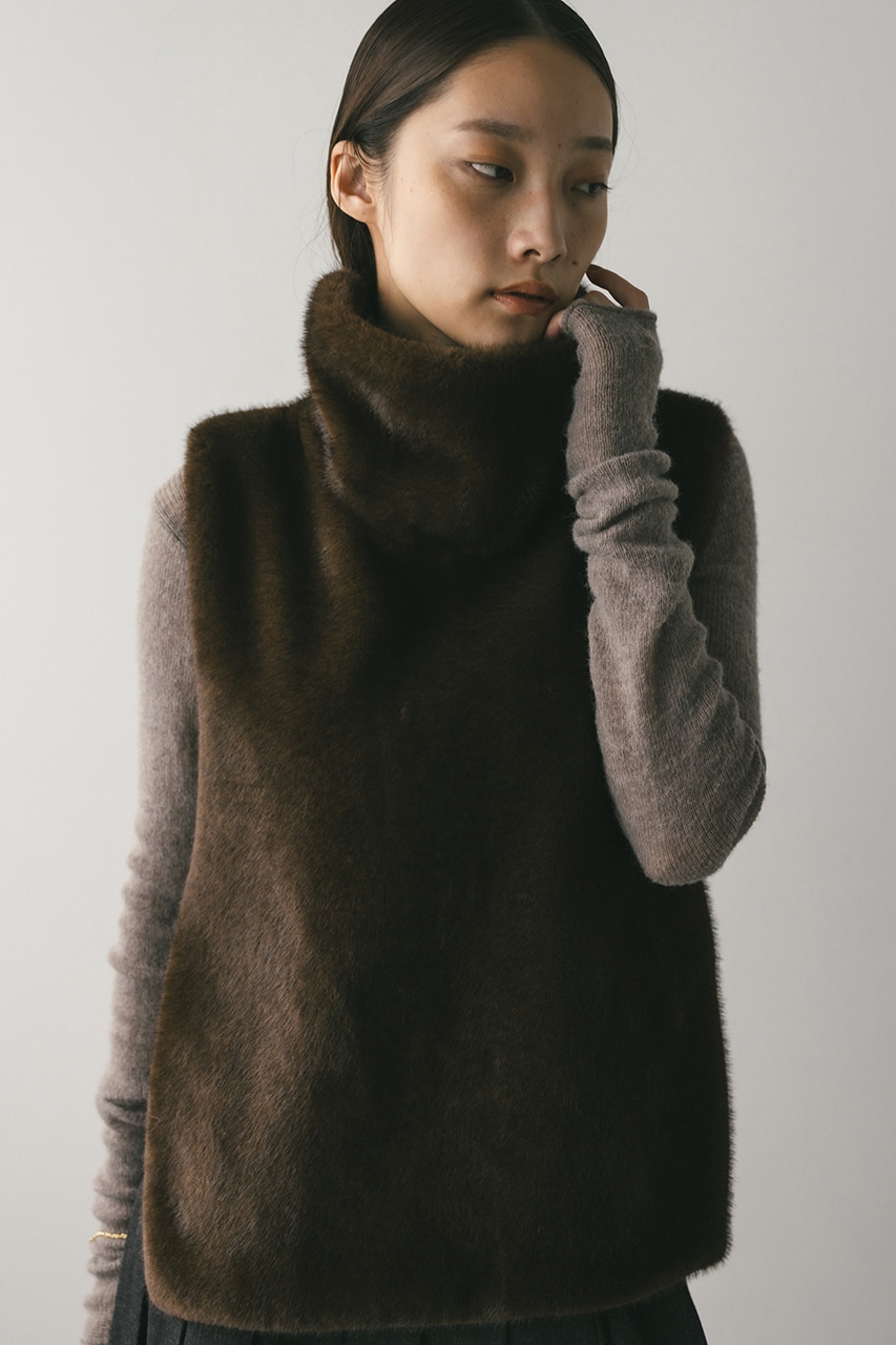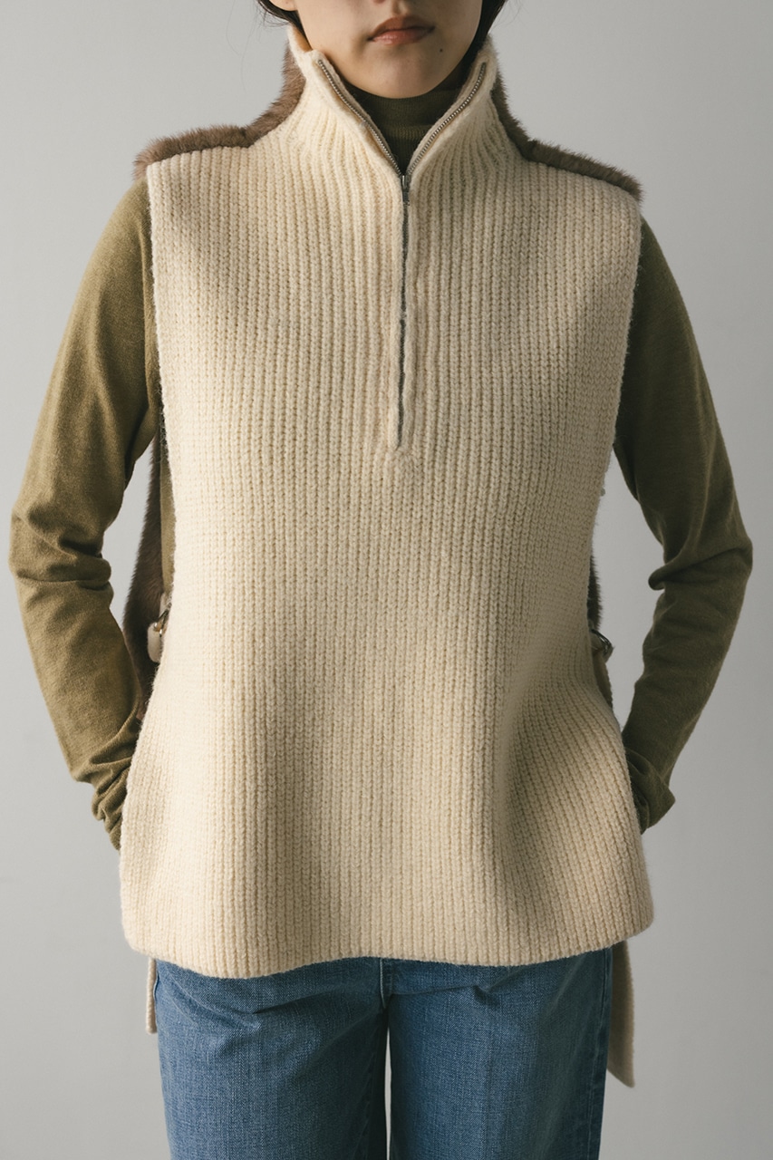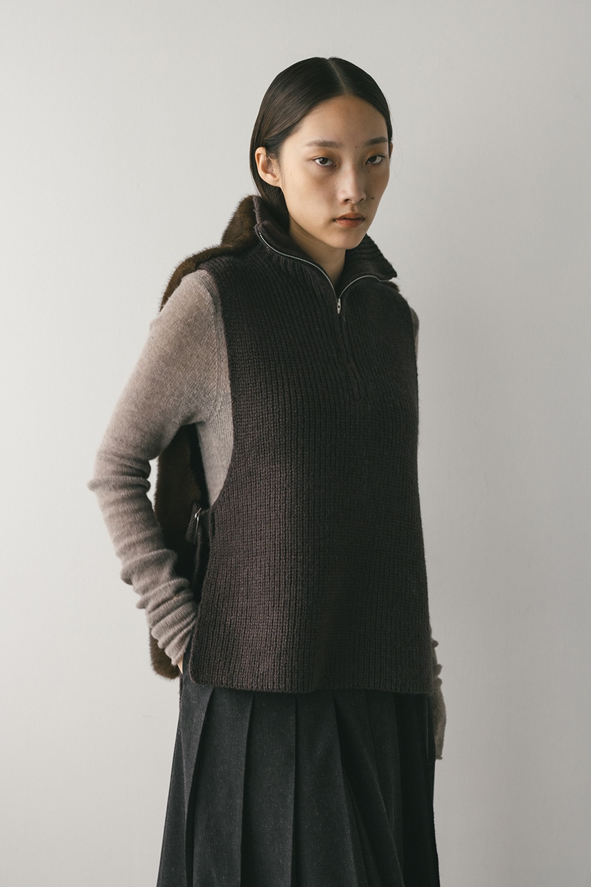 ニットとフェイクファーの前後2WAYで着用できるベスト。スタンドネックにもでき、トレンドライクな着こなしに欠かせないこなれアイテムです。フェイクファーは細い毛足のなめらかな肌触りと艶やかさが特徴。暖かさはもちろん着心地にも優れた一枚です。立体感のあるニットには着脱に優れ、コーデの幅も広がる襟元ファスナーデザインを施しました。両サイドはベルトでレイヤードを楽しんでいただけます。透け感なし、ストレッチなし。