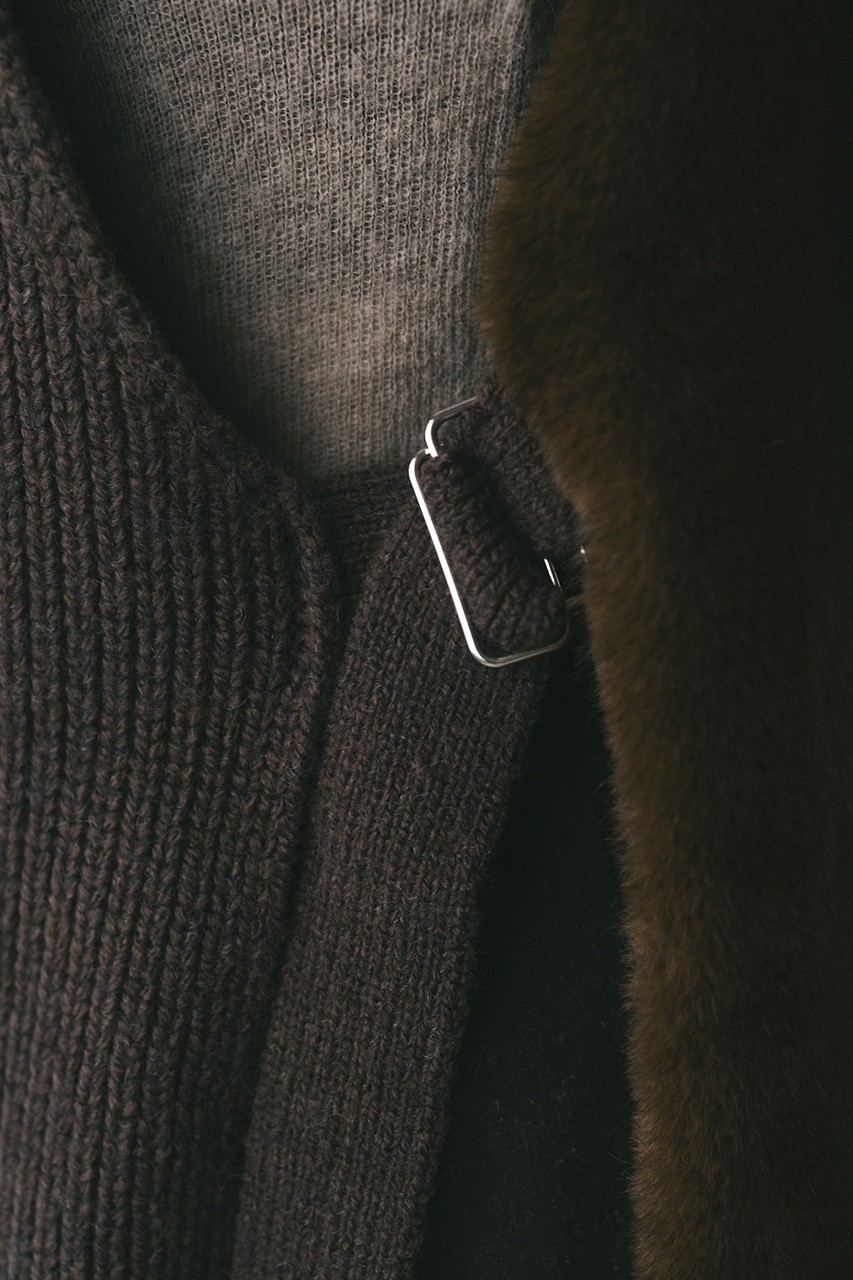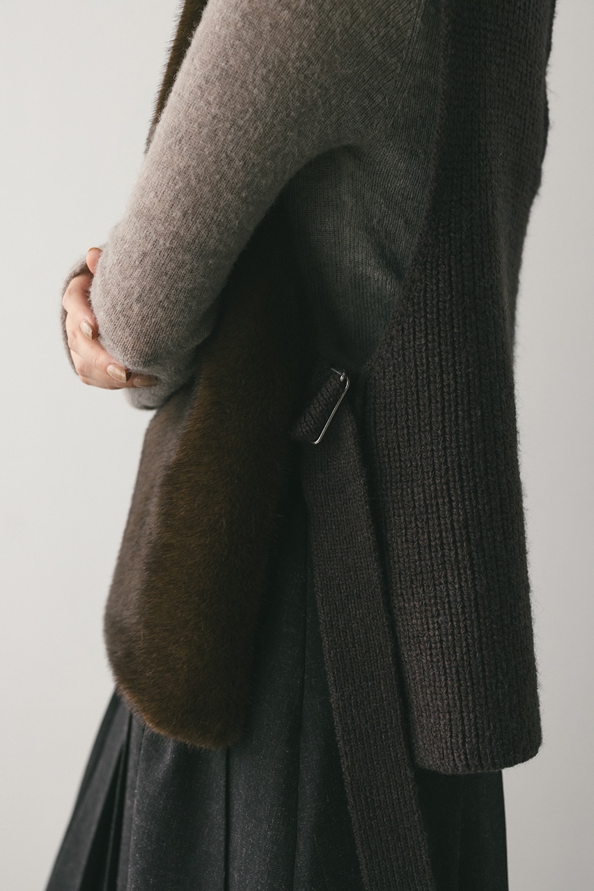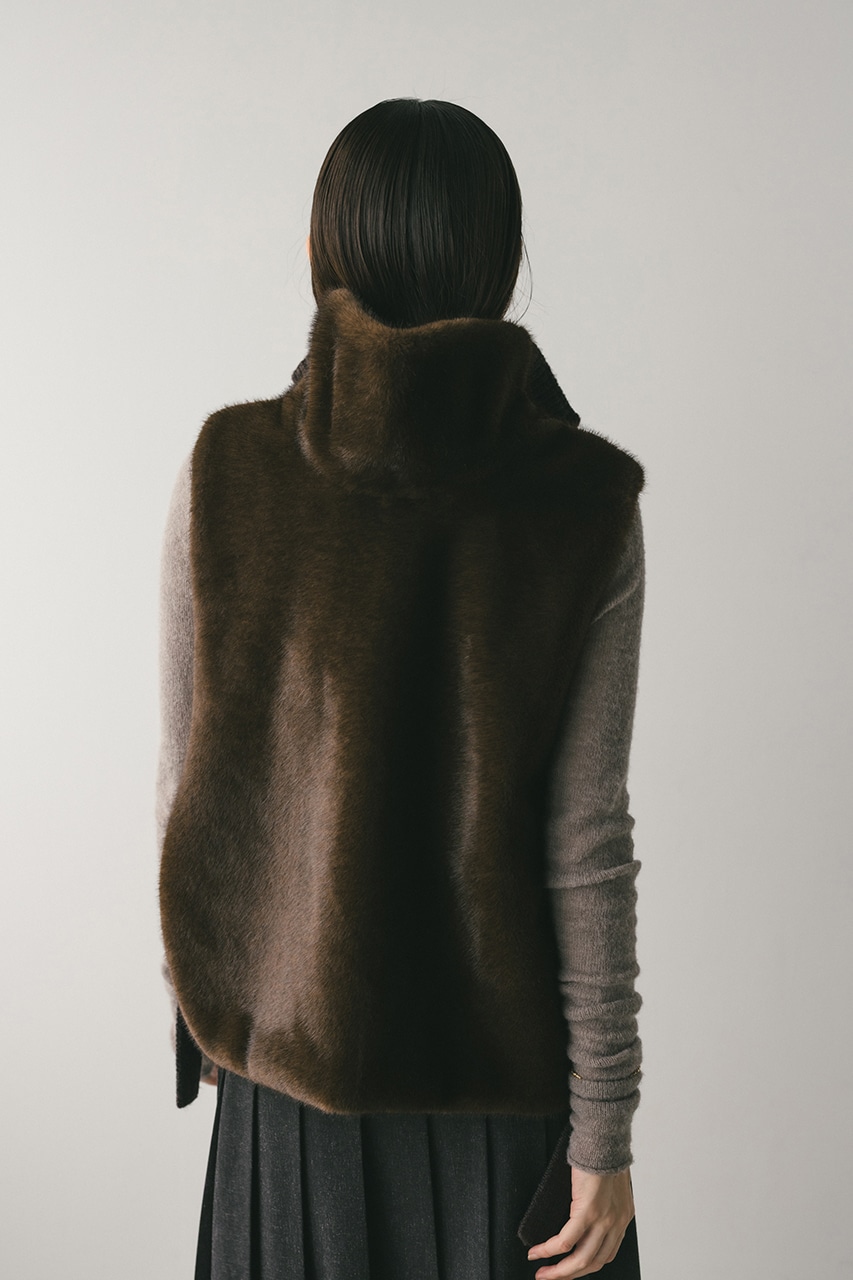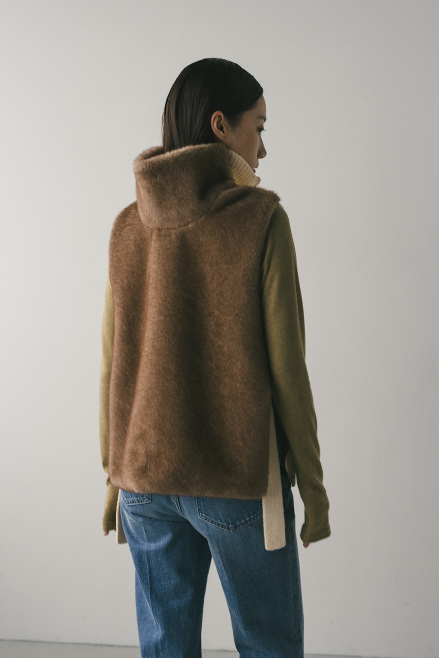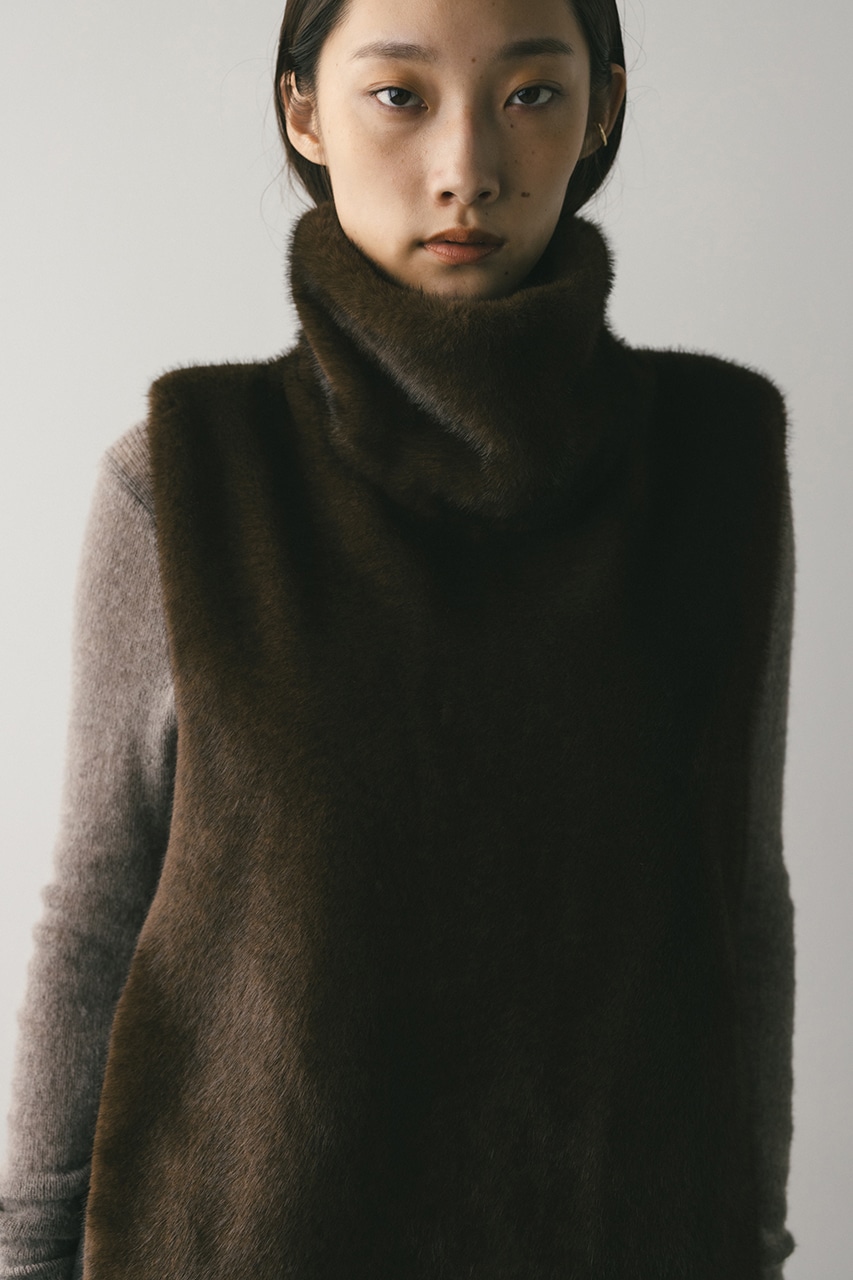 ニットとフェイクファーの前後2WAYで着用できるベスト。スタンドネックにもでき、トレンドライクな着こなしに欠かせないこなれアイテムです。フェイクファーは細い毛足のなめらかな肌触りと艶やかさが特徴。暖かさはもちろん着心地にも優れた一枚です。立体感のあるニットには着脱に優れ、コーデの幅も広がる襟元ファスナーデザインを施しました。両サイドはベルトでレイヤードを楽しんでいただけます。透け感なし、ストレッチなし。