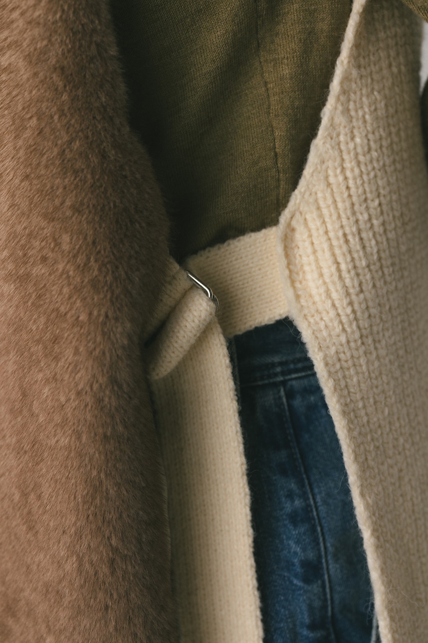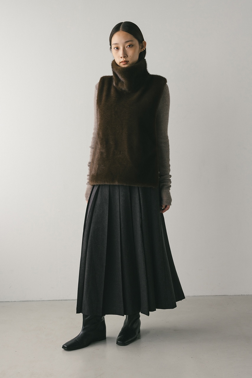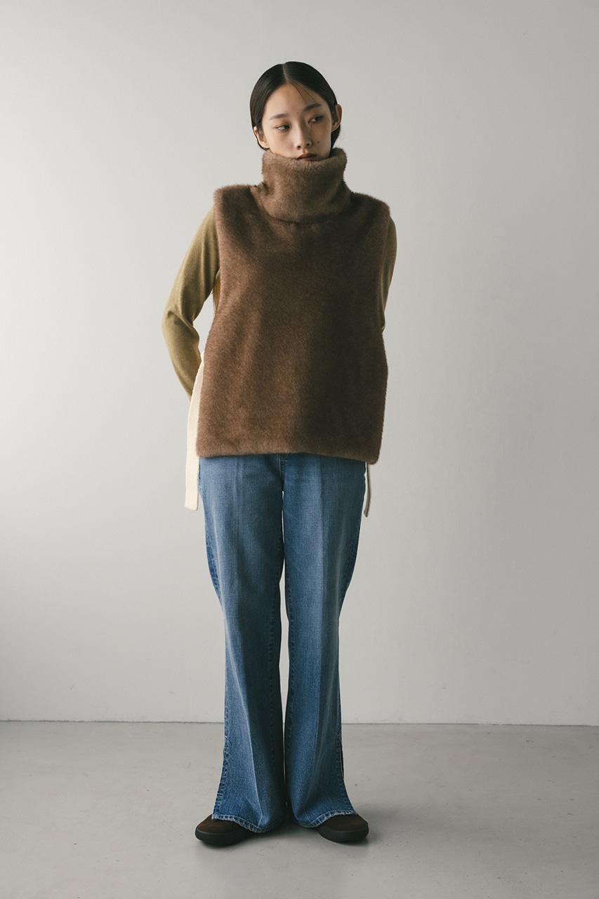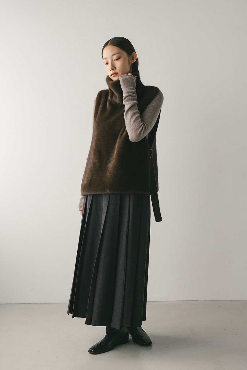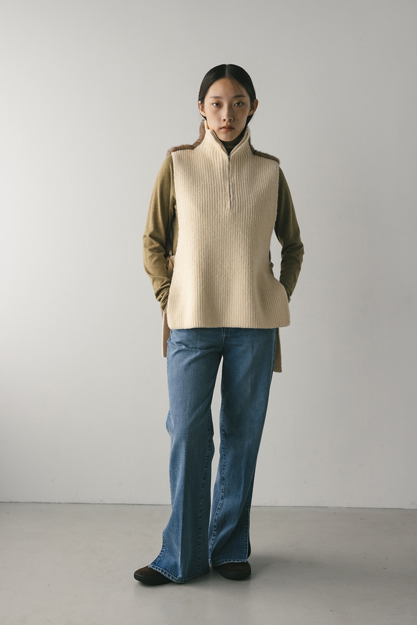 ニットとフェイクファーの前後2WAYで着用できるベスト。スタンドネックにもでき、トレンドライクな着こなしに欠かせないこなれアイテムです。フェイクファーは細い毛足のなめらかな肌触りと艶やかさが特徴。暖かさはもちろん着心地にも優れた一枚です。立体感のあるニットには着脱に優れ、コーデの幅も広がる襟元ファスナーデザインを施しました。両サイドはベルトでレイヤードを楽しんでいただけます。透け感なし、ストレッチなし。
