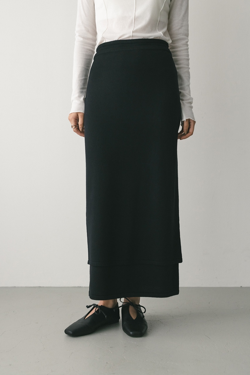 スカートをレイヤードしているように見えるニットスカート。シンプルなストレートシルエットで、トップスを選ばず着用いただけます。後ろにスリットが入っているので、足さばきもしやすい一枚です。ストレッチあり、透け感なし。