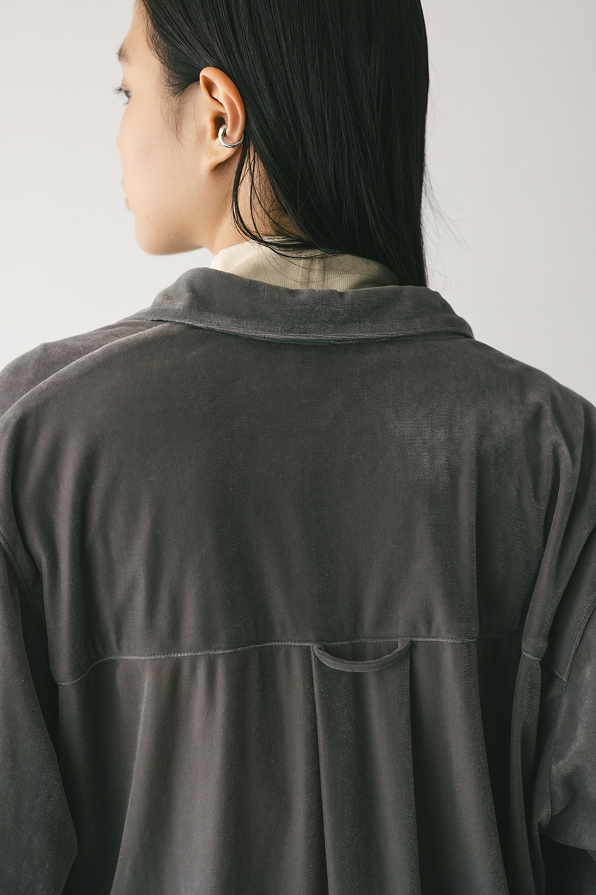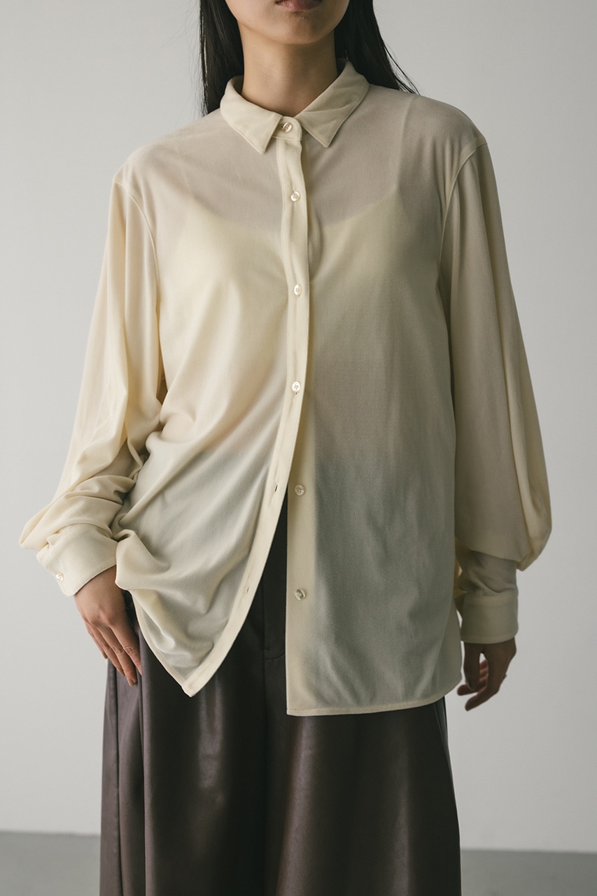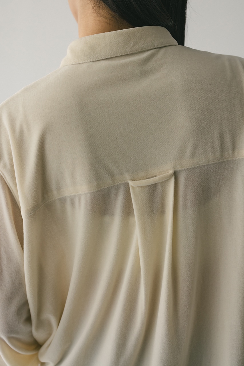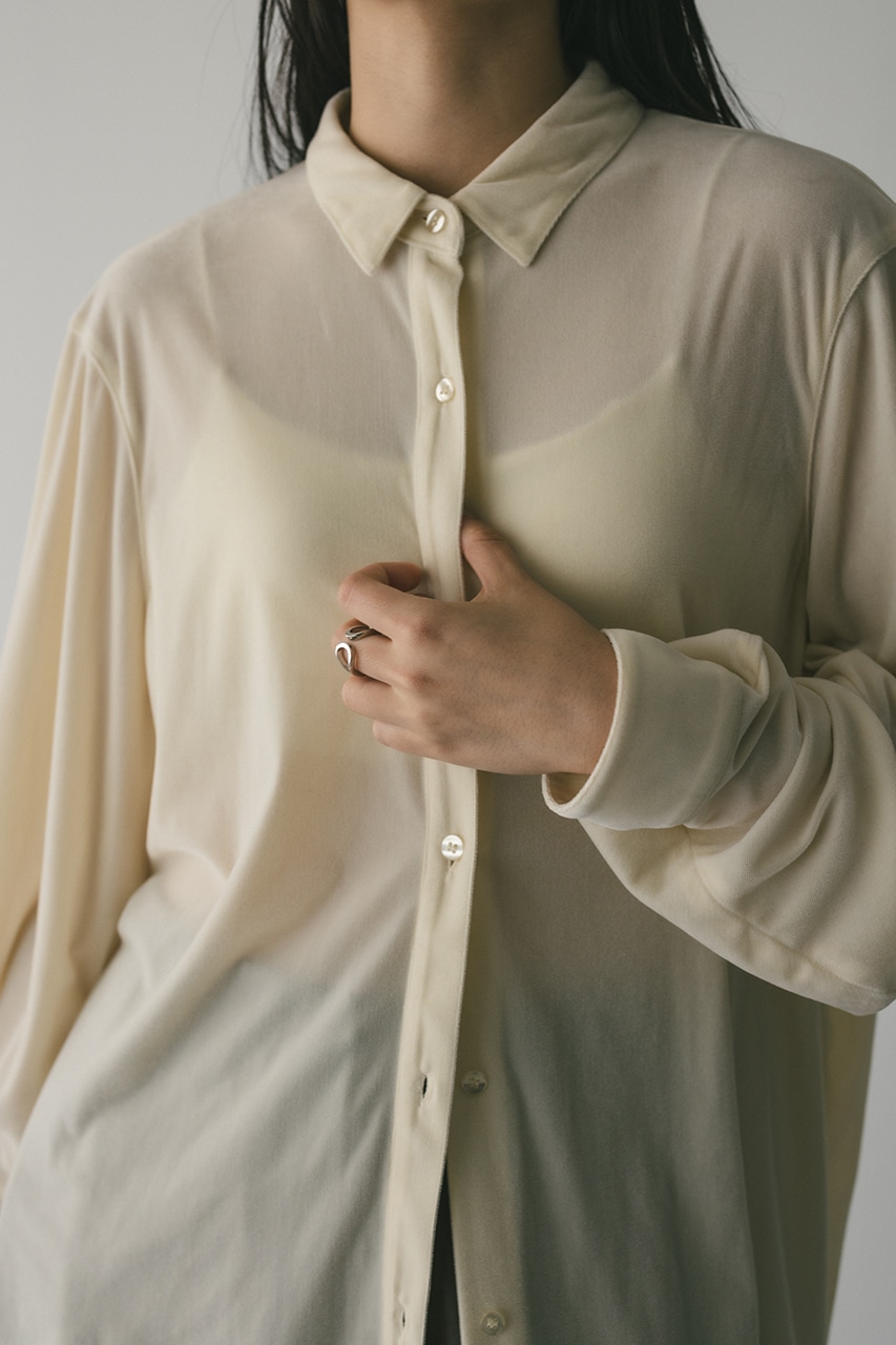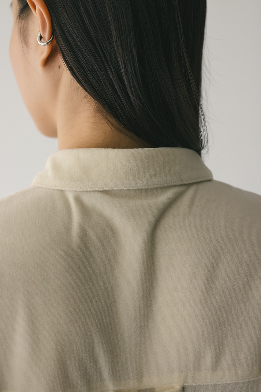 大人な抜け感を演出してくれる程よくシアー感のあるメッシュベロア生地を使用したルーズシャツ。ストレッチあり、透け感ややあり。