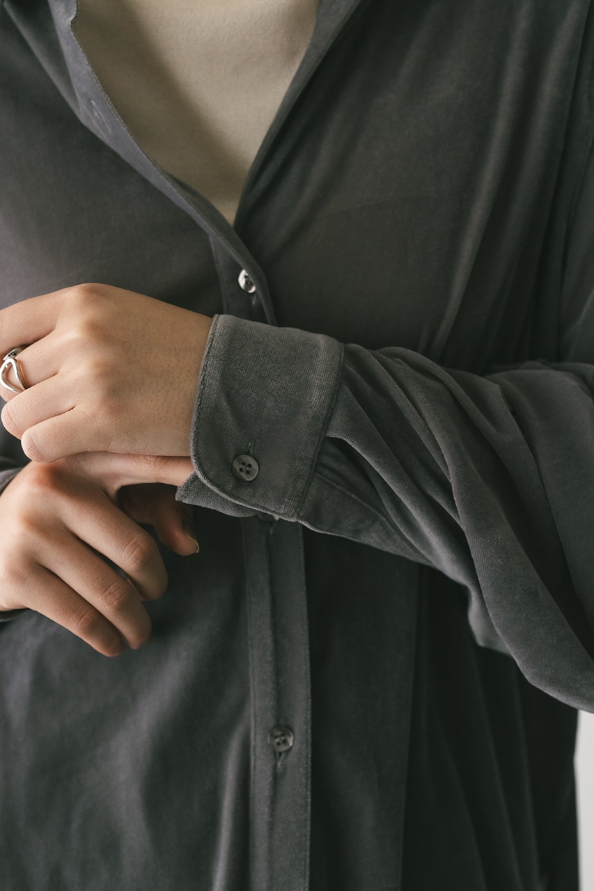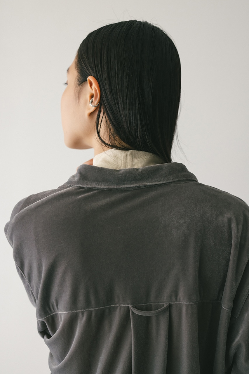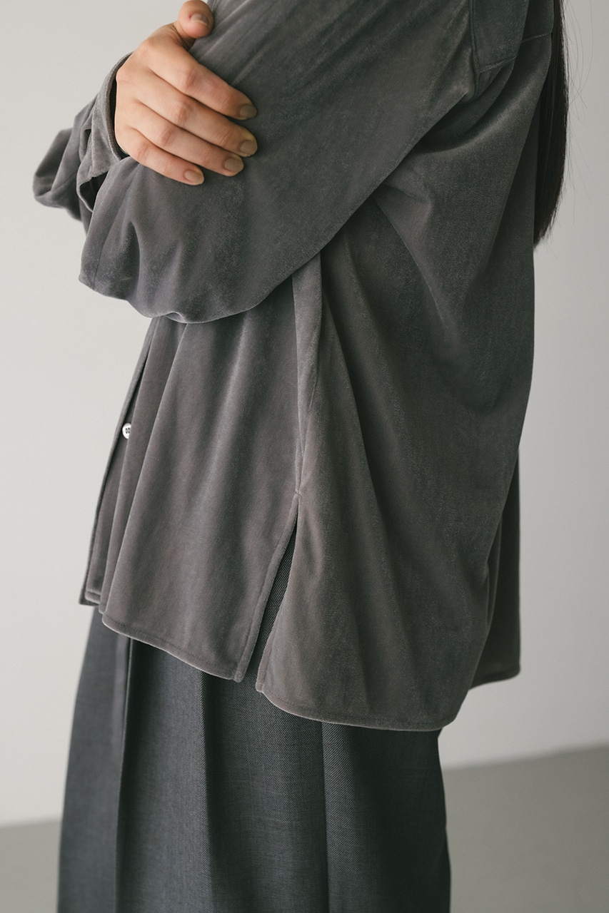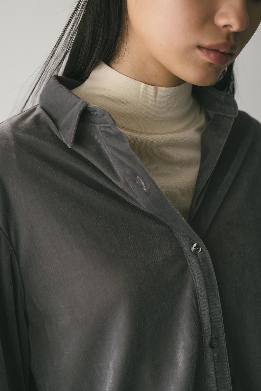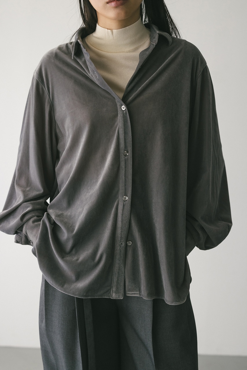 大人な抜け感を演出してくれる程よくシアー感のあるメッシュベロア生地を使用したルーズシャツ。ストレッチあり、透け感ややあり。