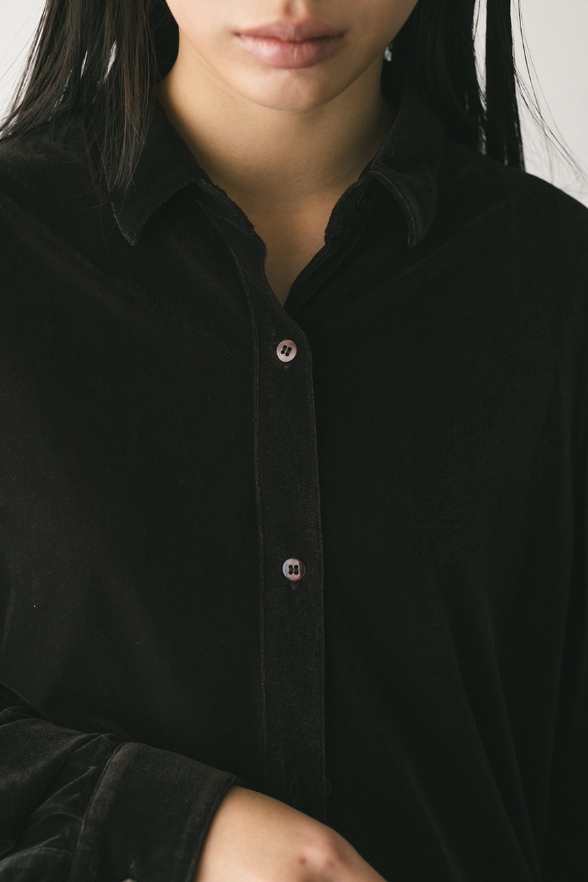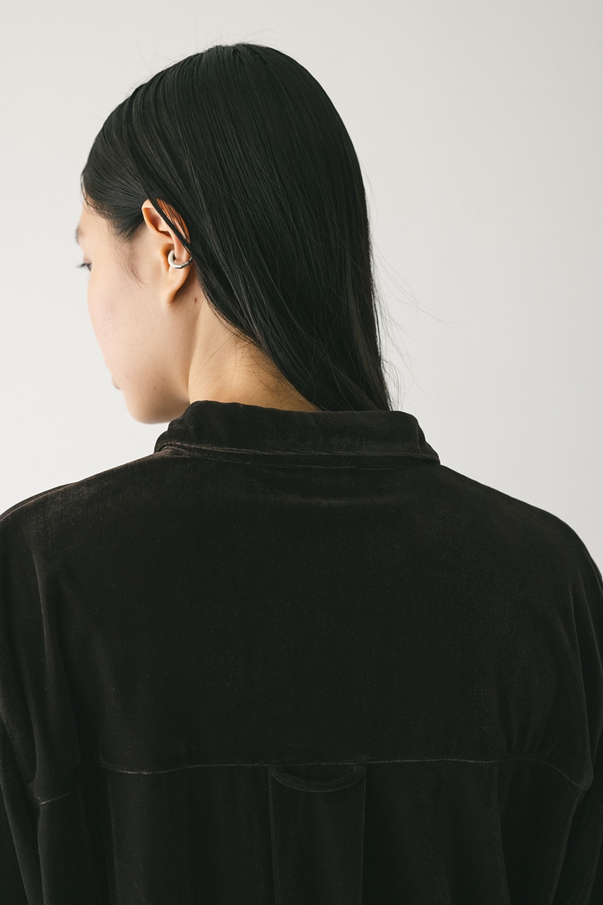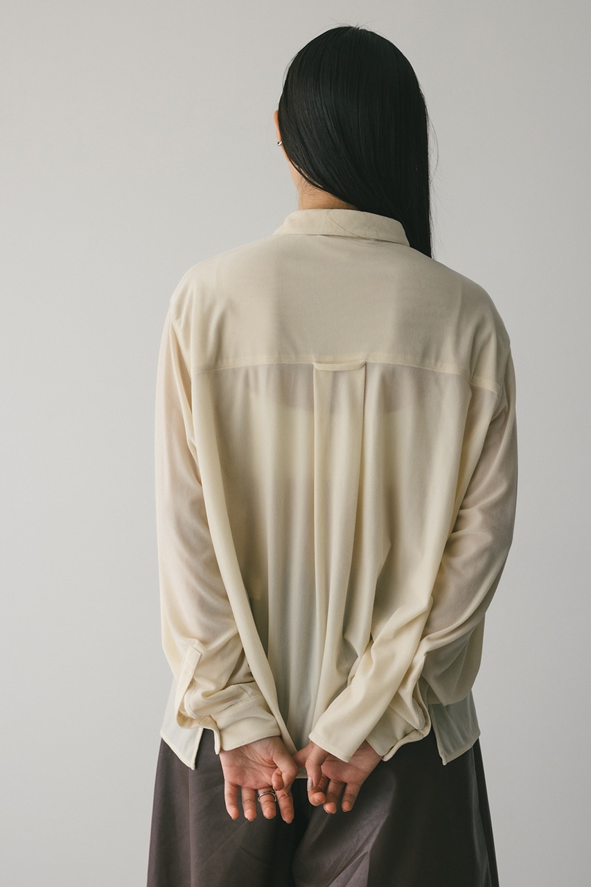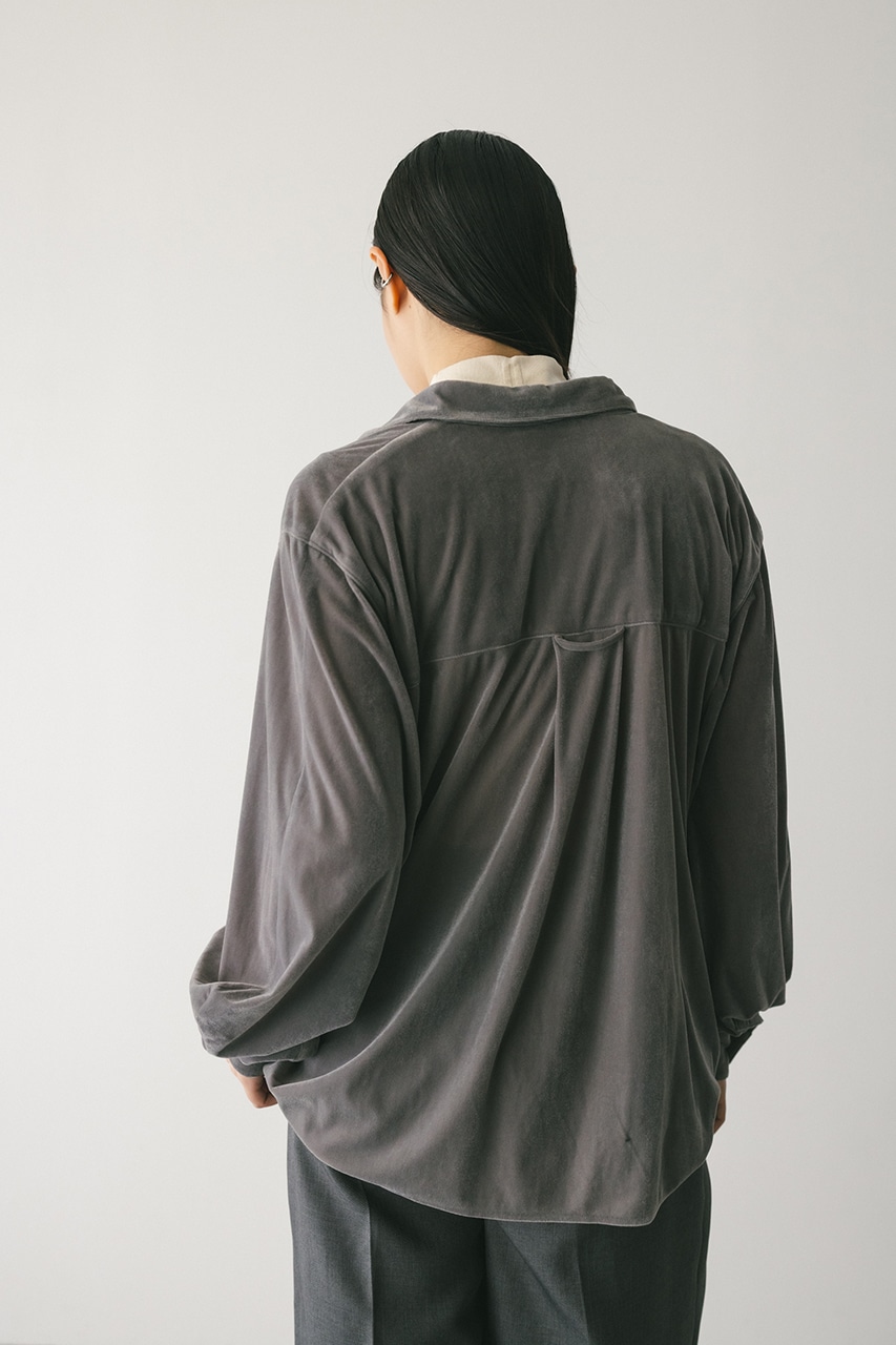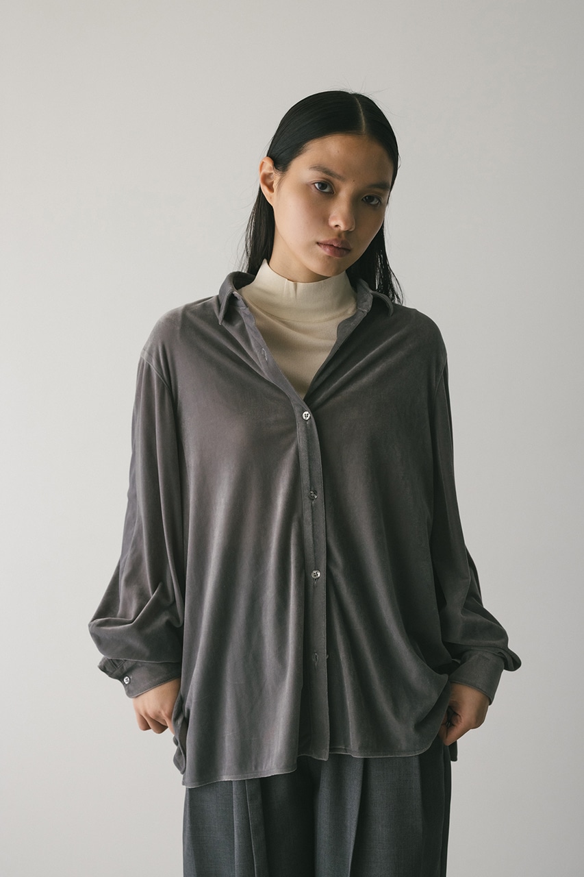 大人な抜け感を演出してくれる程よくシアー感のあるメッシュベロア生地を使用したルーズシャツ。ストレッチあり、透け感ややあり。