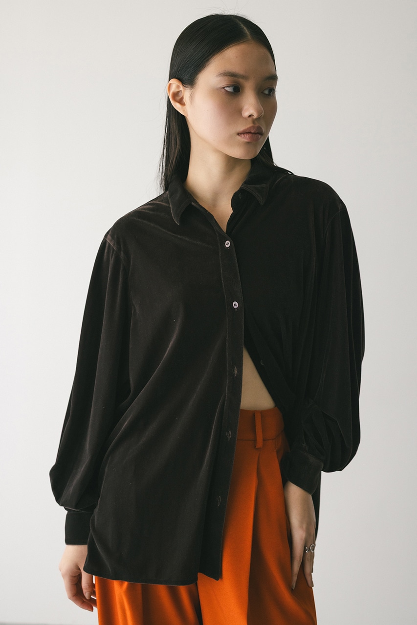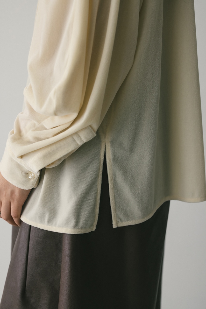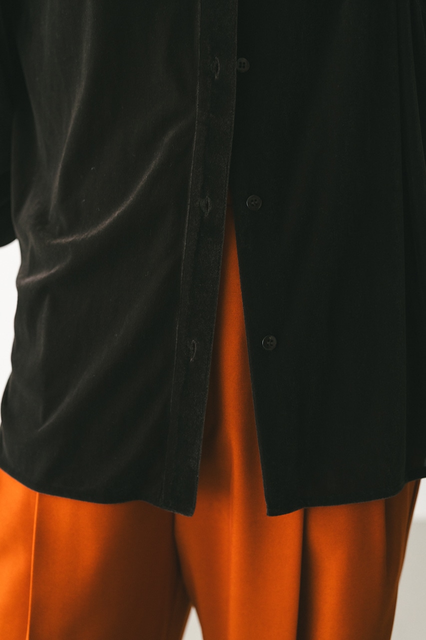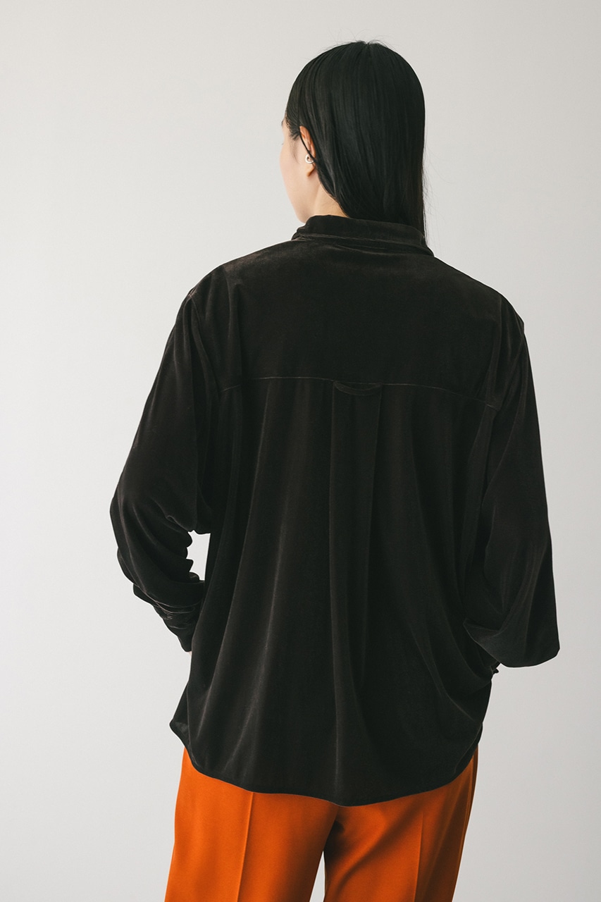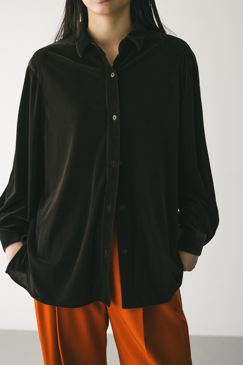 大人な抜け感を演出してくれる程よくシアー感のあるメッシュベロア生地を使用したルーズシャツ。ストレッチあり、透け感ややあり。