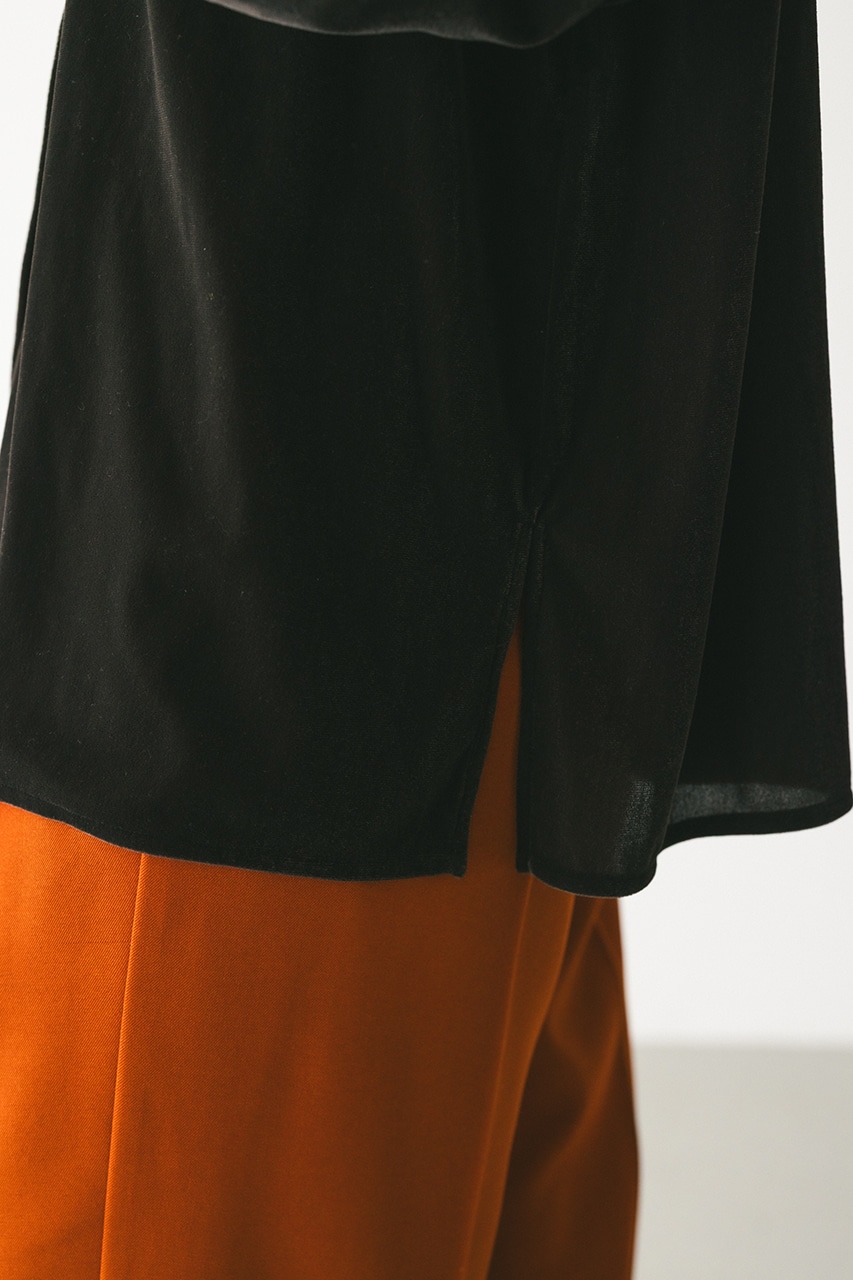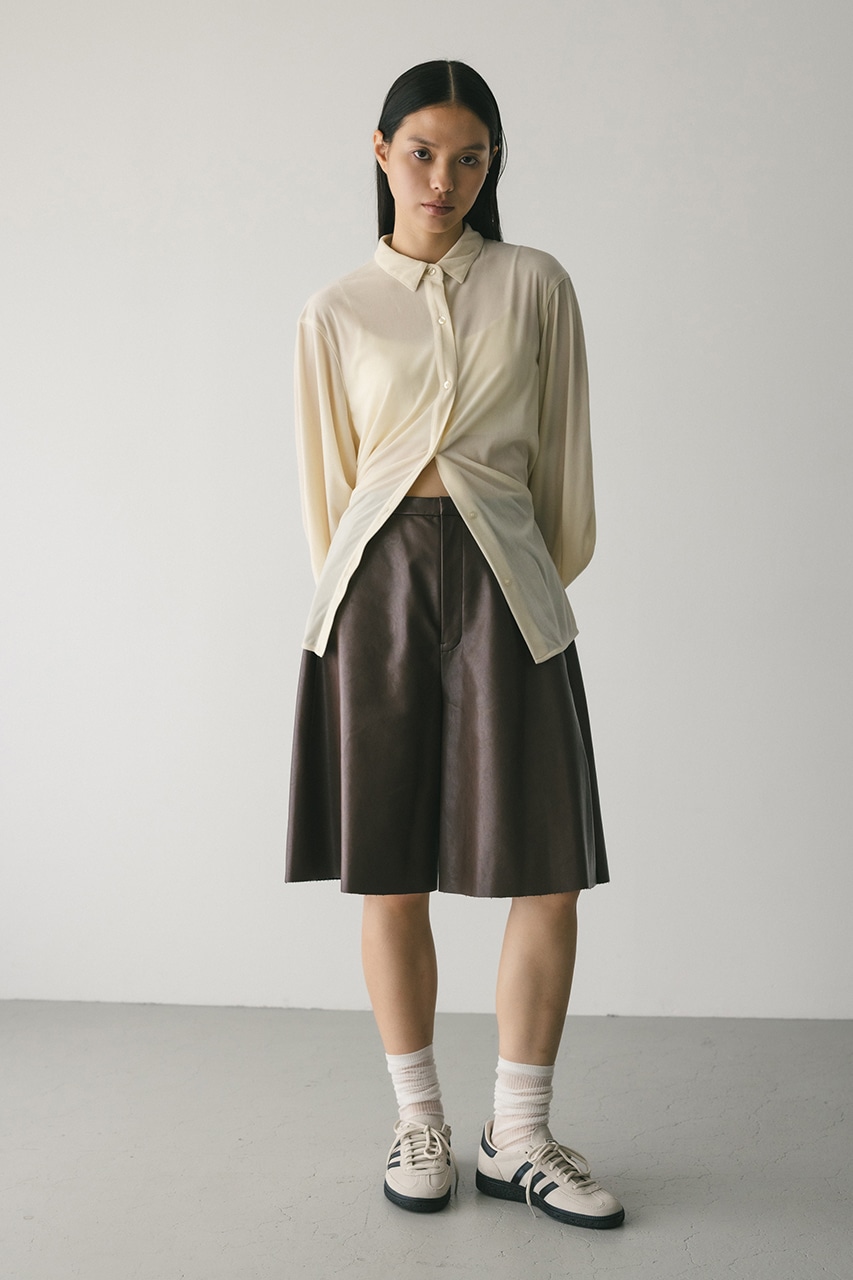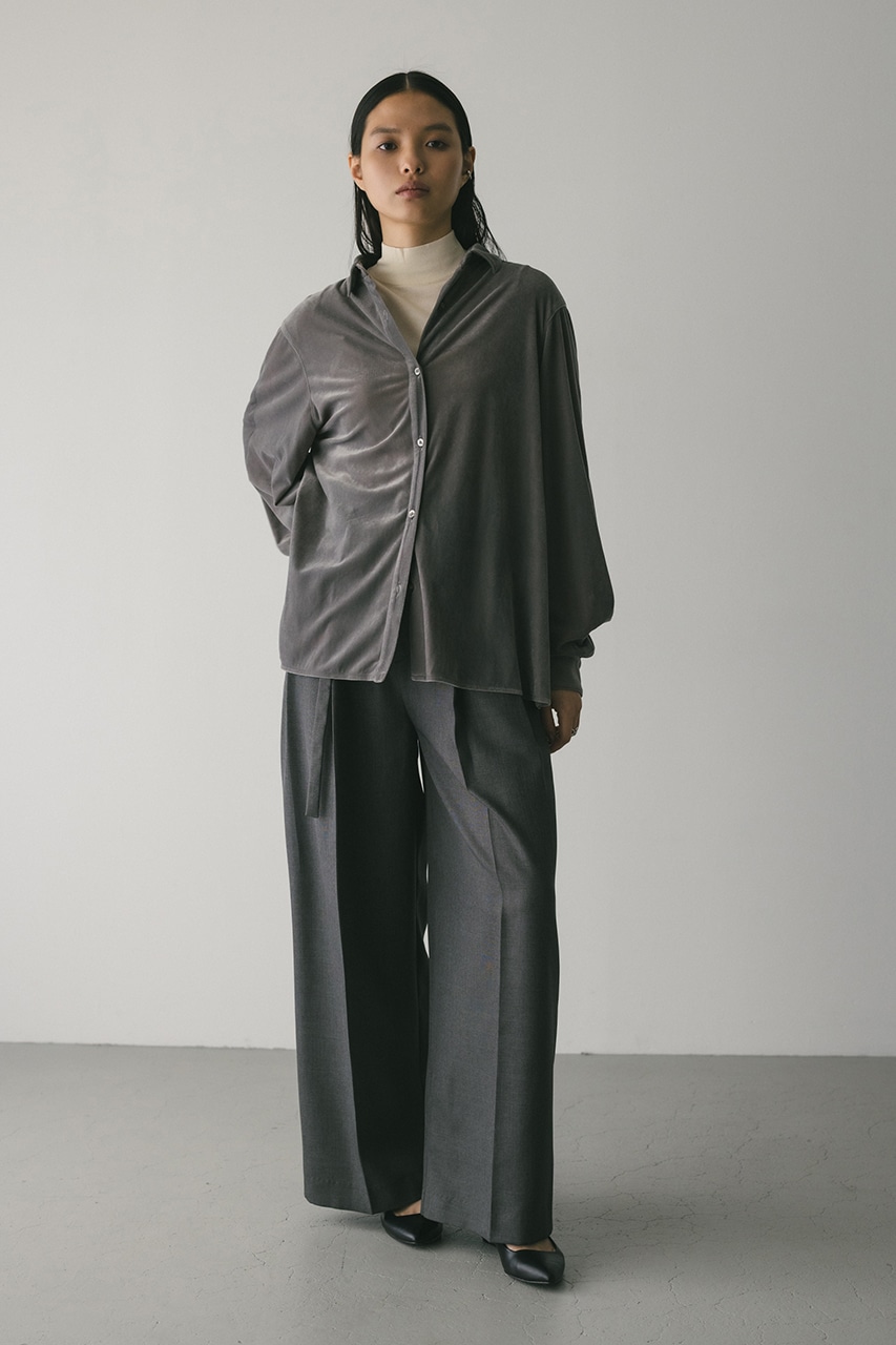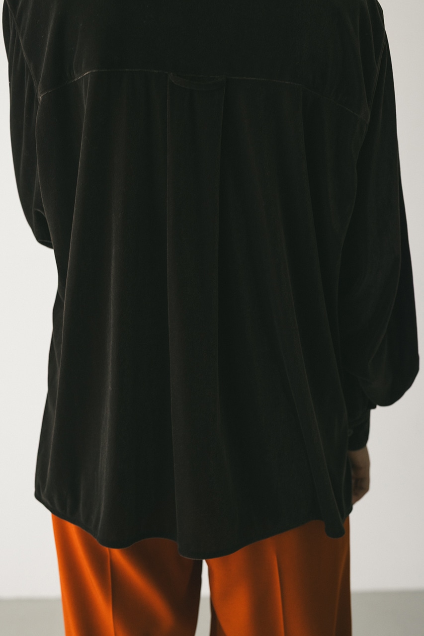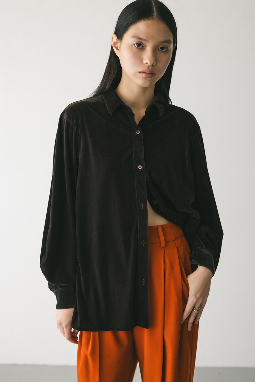 大人な抜け感を演出してくれる程よくシアー感のあるメッシュベロア生地を使用したルーズシャツ。ストレッチあり、透け感ややあり。