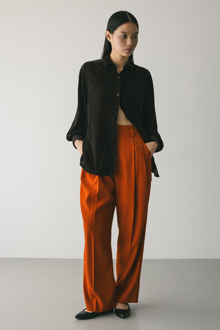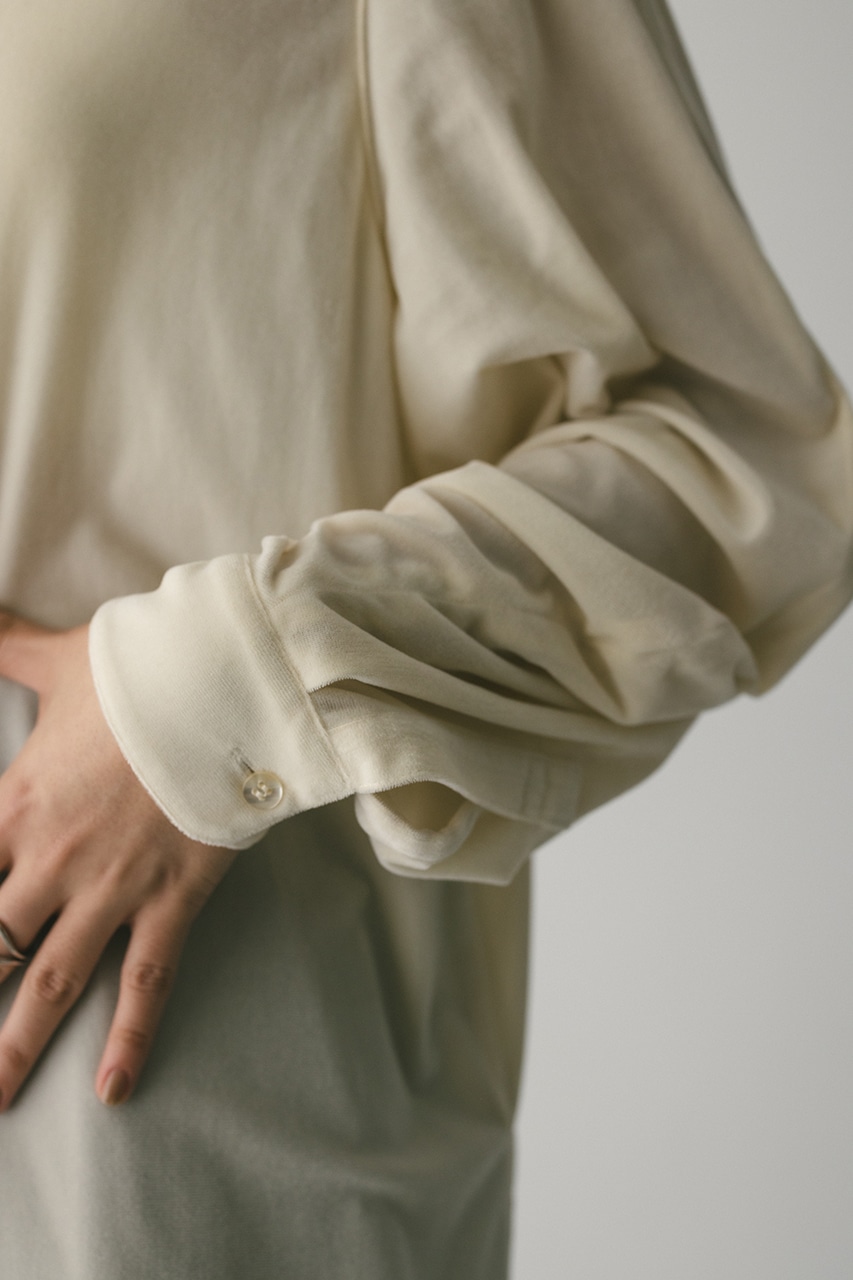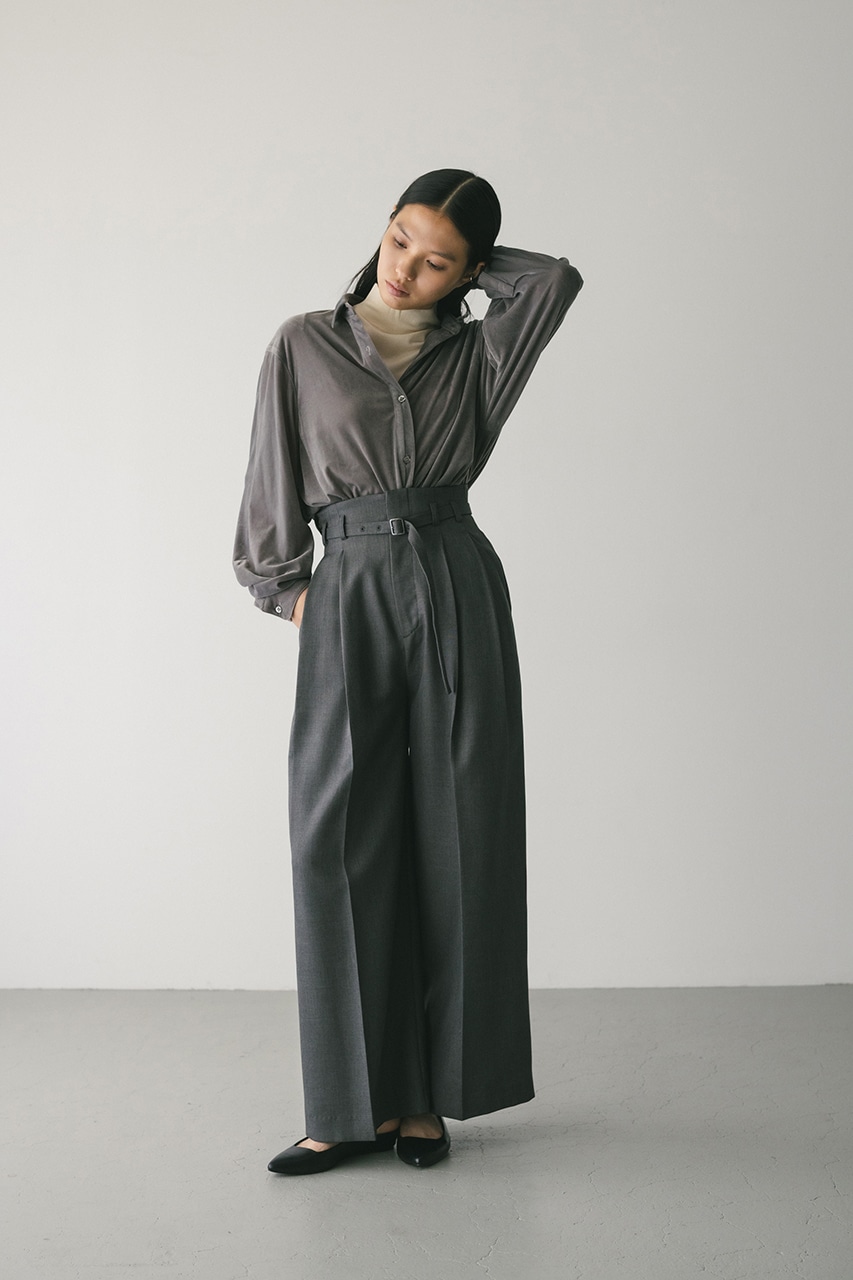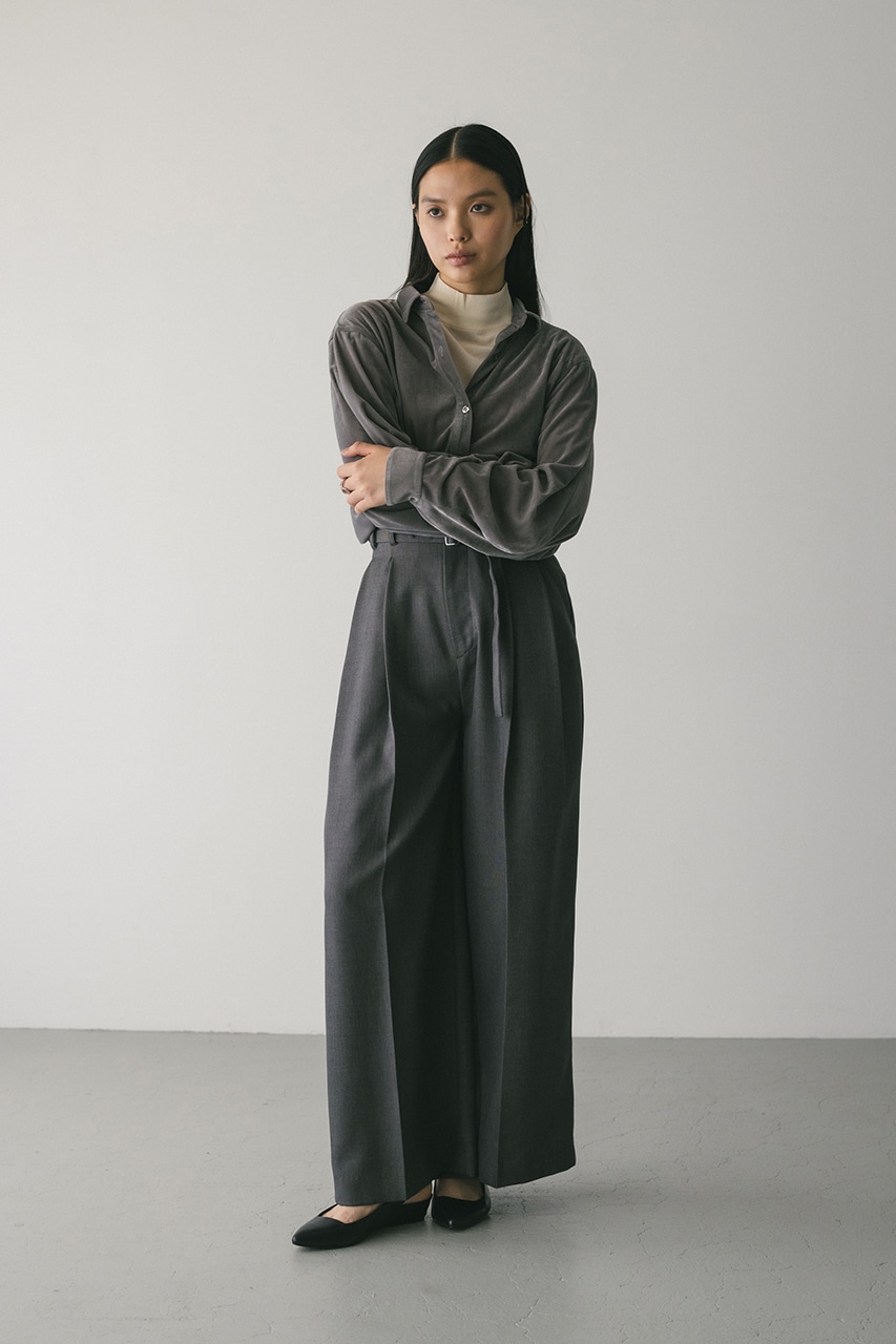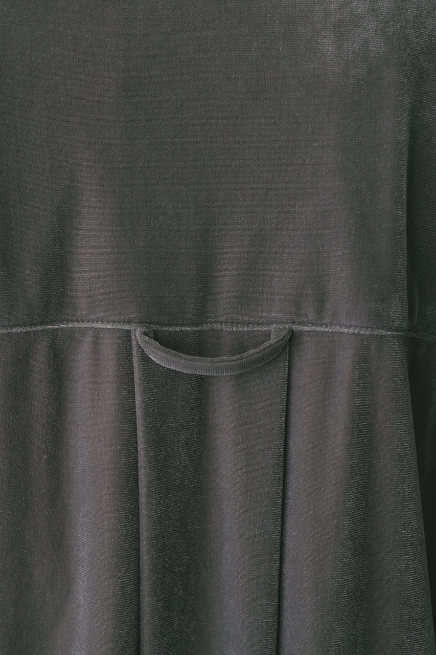 大人な抜け感を演出してくれる程よくシアー感のあるメッシュベロア生地を使用したルーズシャツ。ストレッチあり、透け感ややあり。