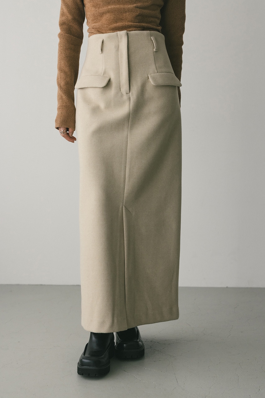 すっきりとしたナローシルエットと実用性とアクセントを兼ね備えたフロントポケットをデザインがポイントのスカート。センタースリットが抜け感を与え、足さばきの良さとスタイルアップ効果をかなえます。シーズン問わず取り入れやすく、合わせるトップス次第で印象を自在にアレンジできる1枚。ミニマルでありながら存在感のあるデザインが、日常のスタイリングにさりげなくモード感をプラスしてくれます。ストレッチなし、透け感なし。