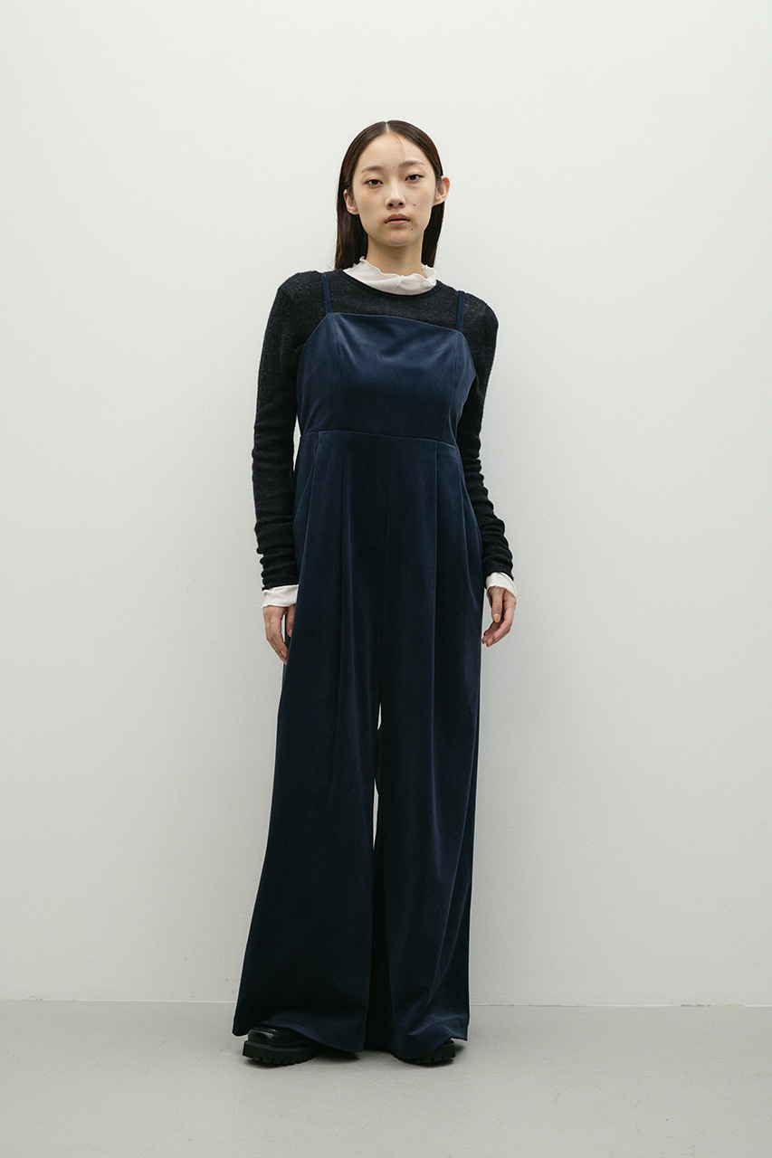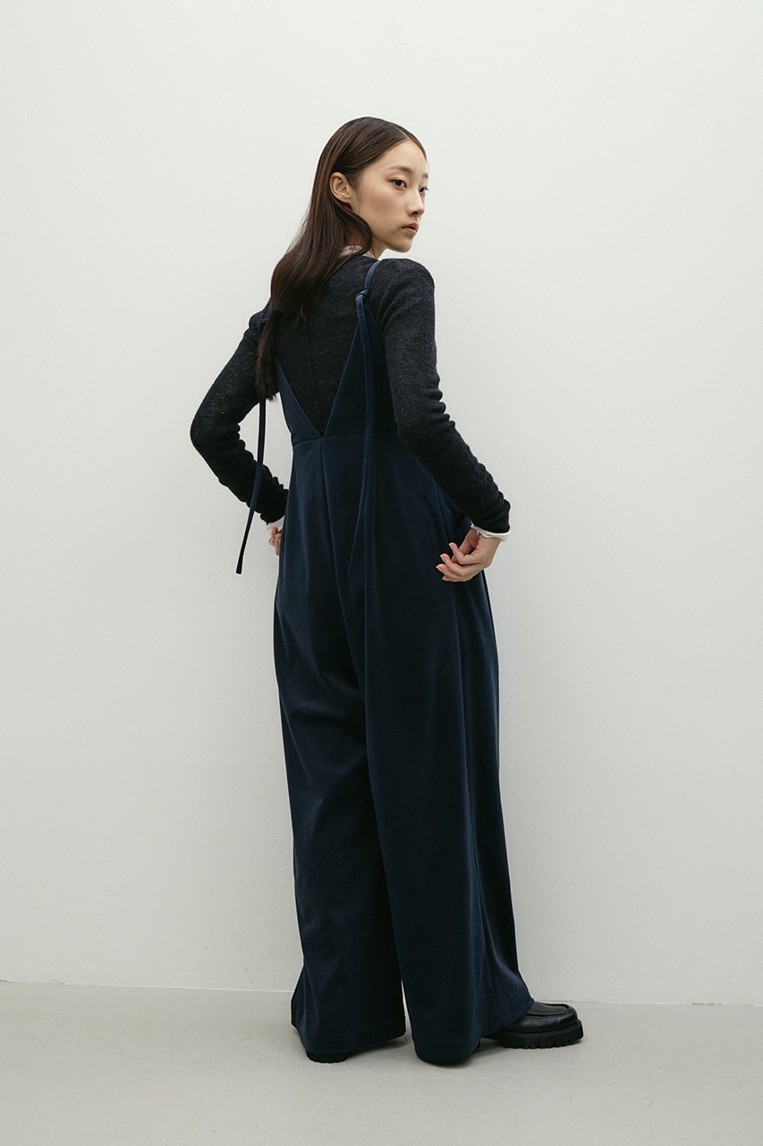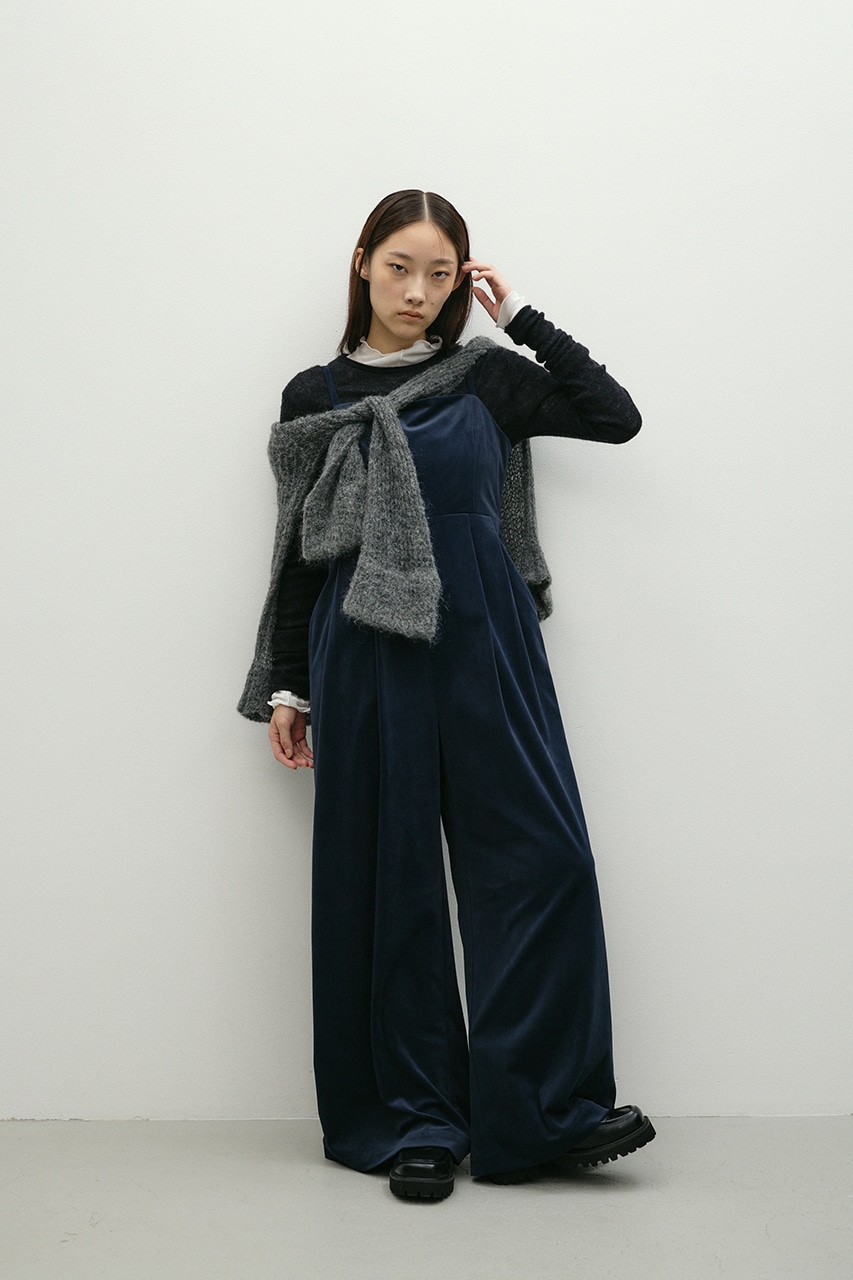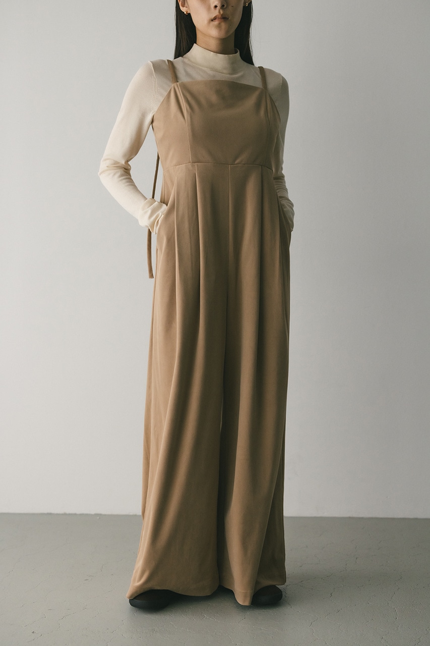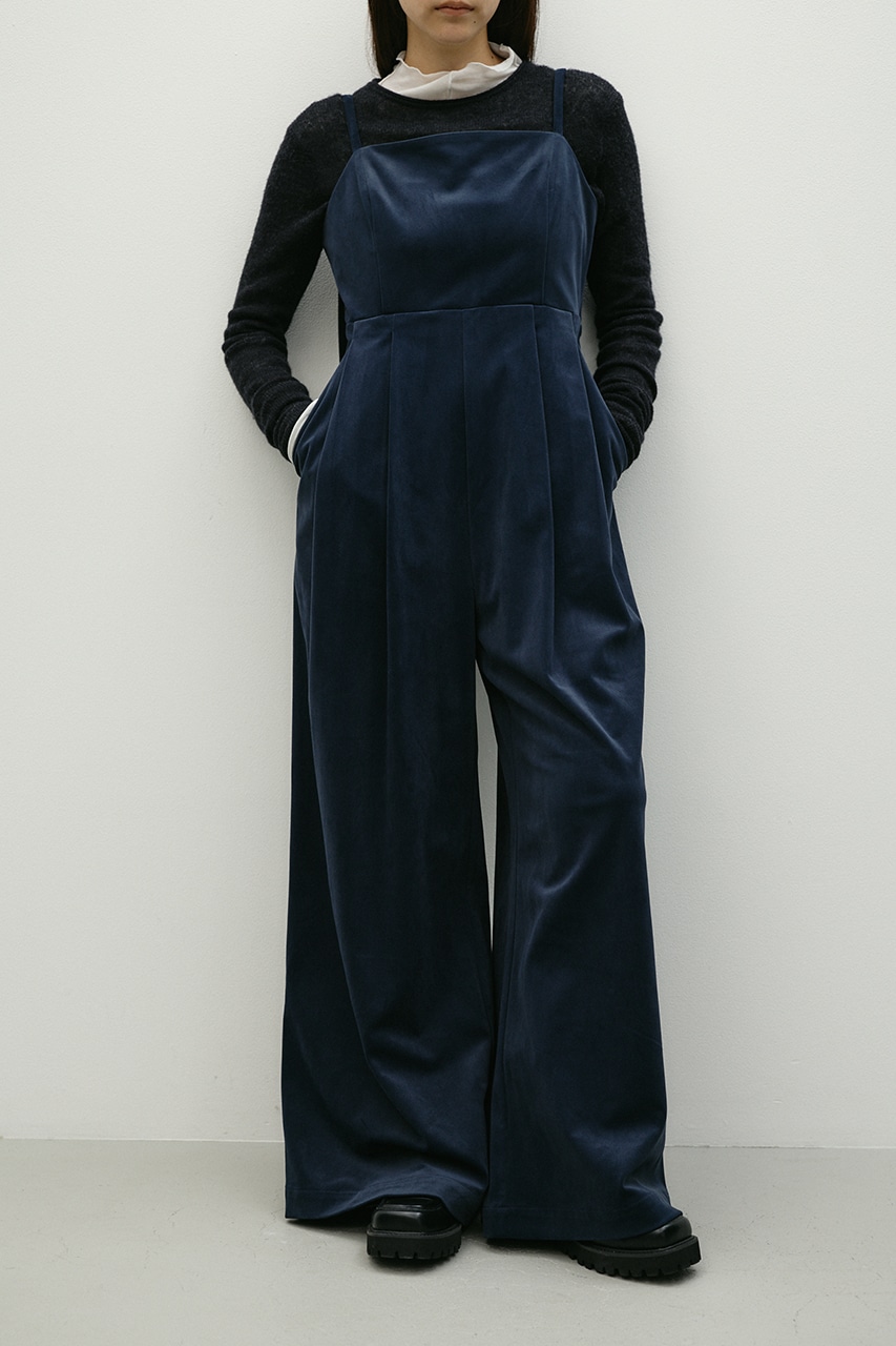 光沢感のあるベロア生地を使用したキャミロンパース。ワイドシルエットに深めのタックを入れることで、縦のラインを強調し、脚長効果を演出します。程よく落ち感のあるベロアが身体のラインを拾いすぎず、リラクシーながらも上品な印象に。インナーを合わせればシーズンレスで活躍し、Tシャツでカジュアルに、ニットやシャツでモードにアレンジできる万能アイテム。華やかさと抜け感を兼ね備え、特別なシーンから日常まで幅広く着回せます。ストレッチなし、透け感なし。