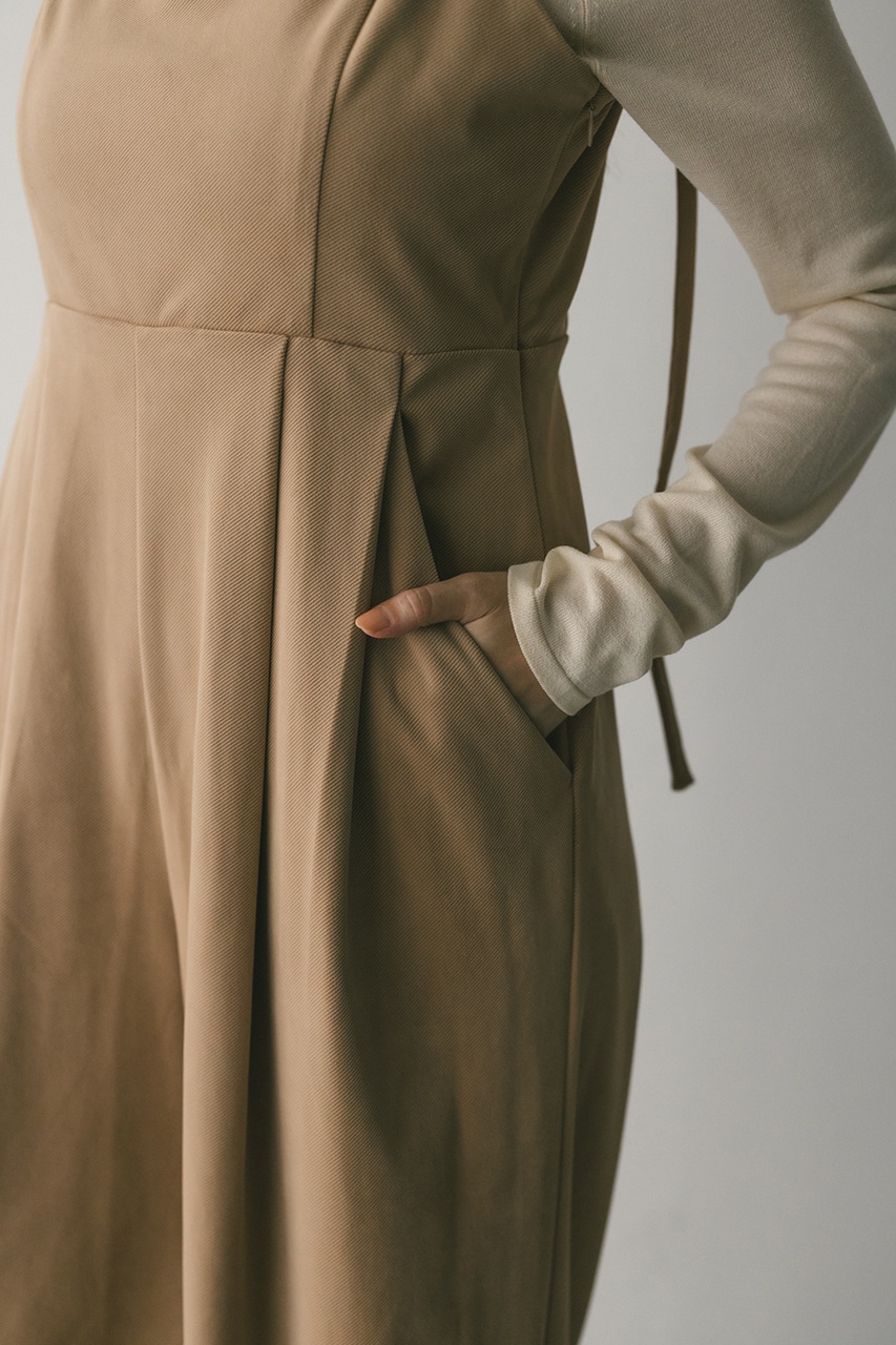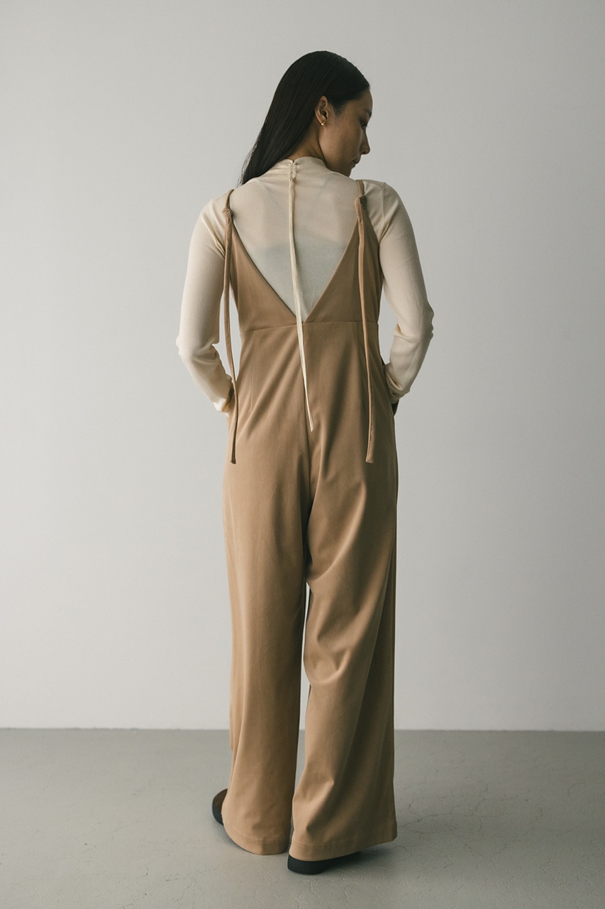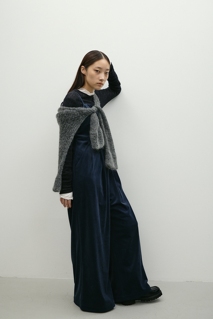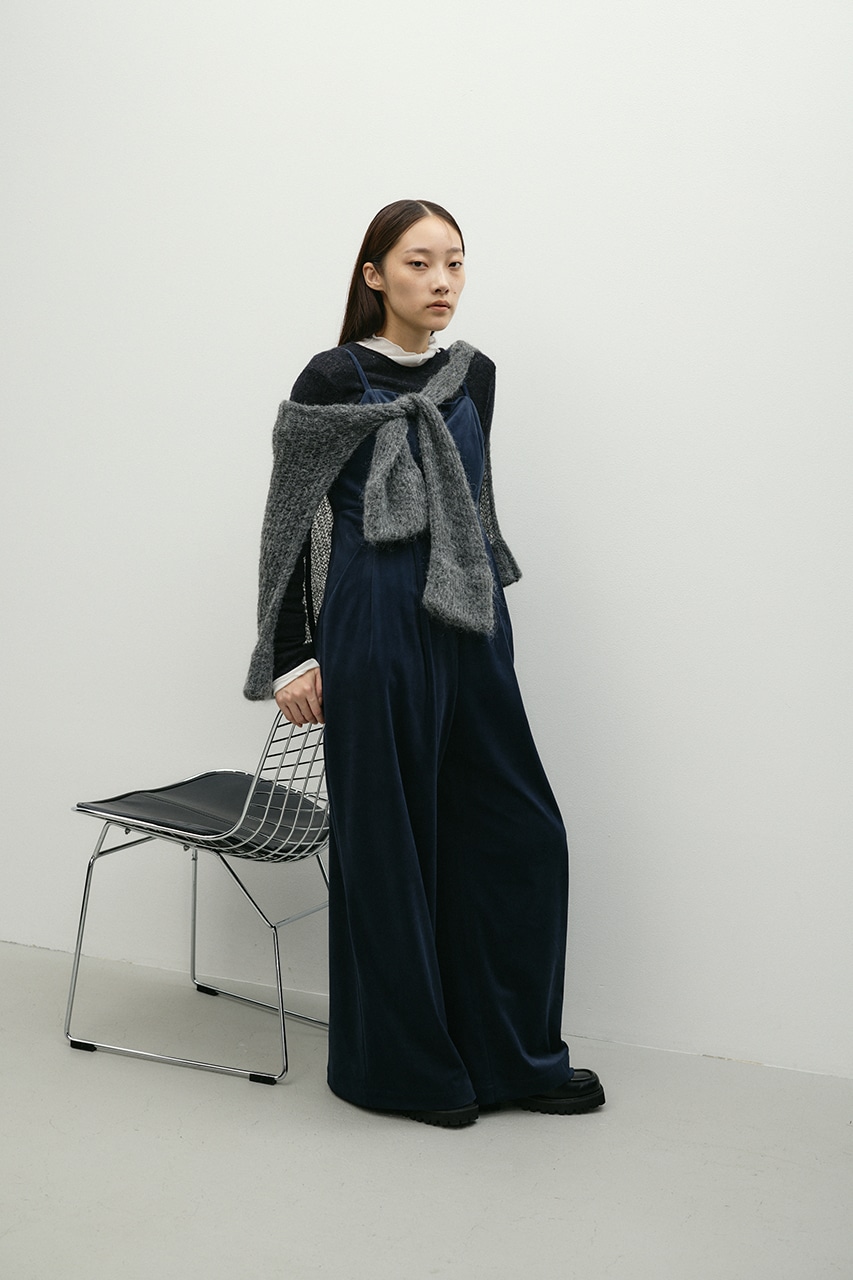 光沢感のあるベロア生地を使用したキャミロンパース。ワイドシルエットに深めのタックを入れることで、縦のラインを強調し、脚長効果を演出します。程よく落ち感のあるベロアが身体のラインを拾いすぎず、リラクシーながらも上品な印象に。インナーを合わせればシーズンレスで活躍し、Tシャツでカジュアルに、ニットやシャツでモードにアレンジできる万能アイテム。華やかさと抜け感を兼ね備え、特別なシーンから日常まで幅広く着回せます。ストレッチなし、透け感なし。